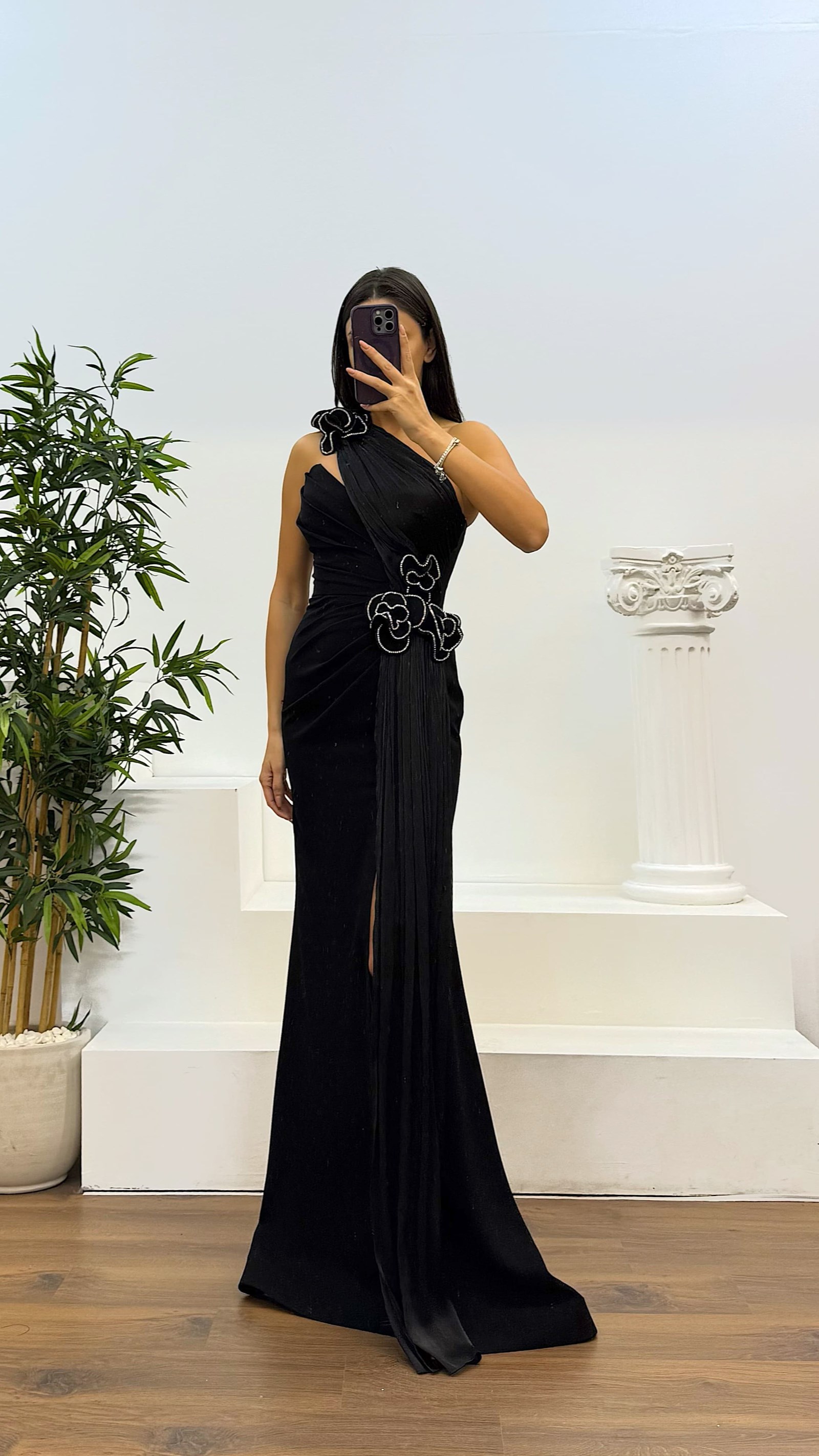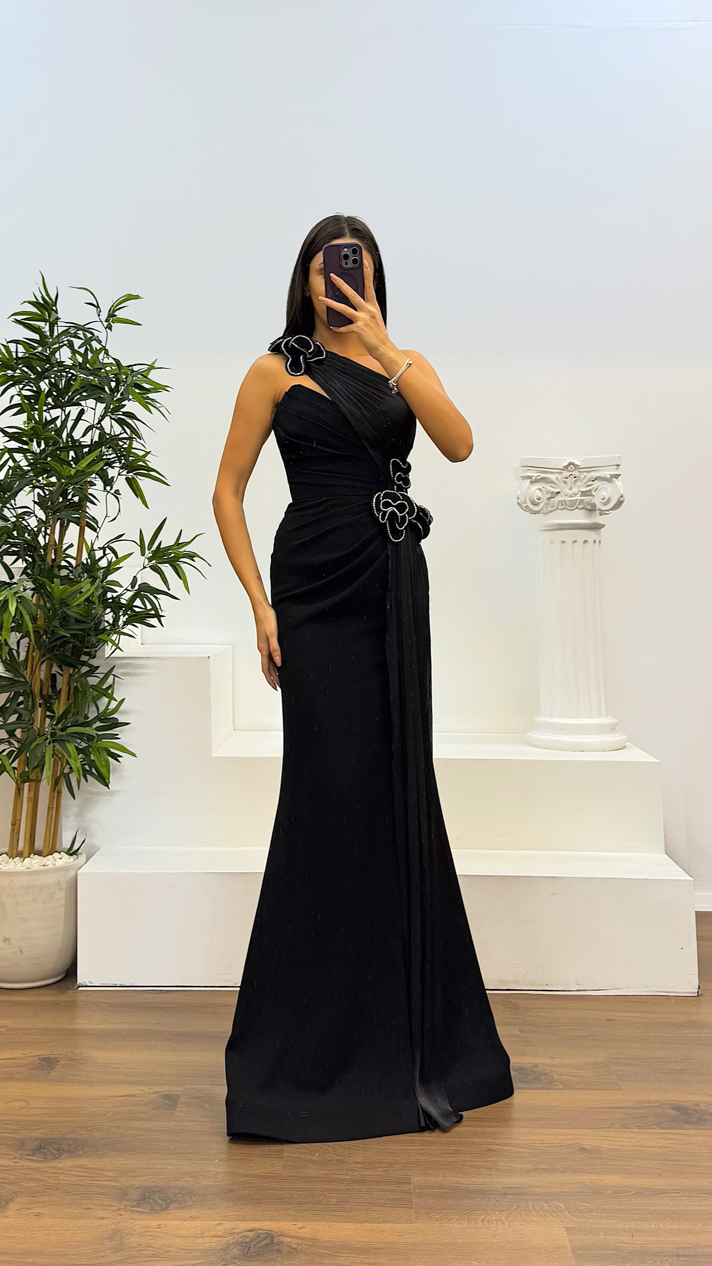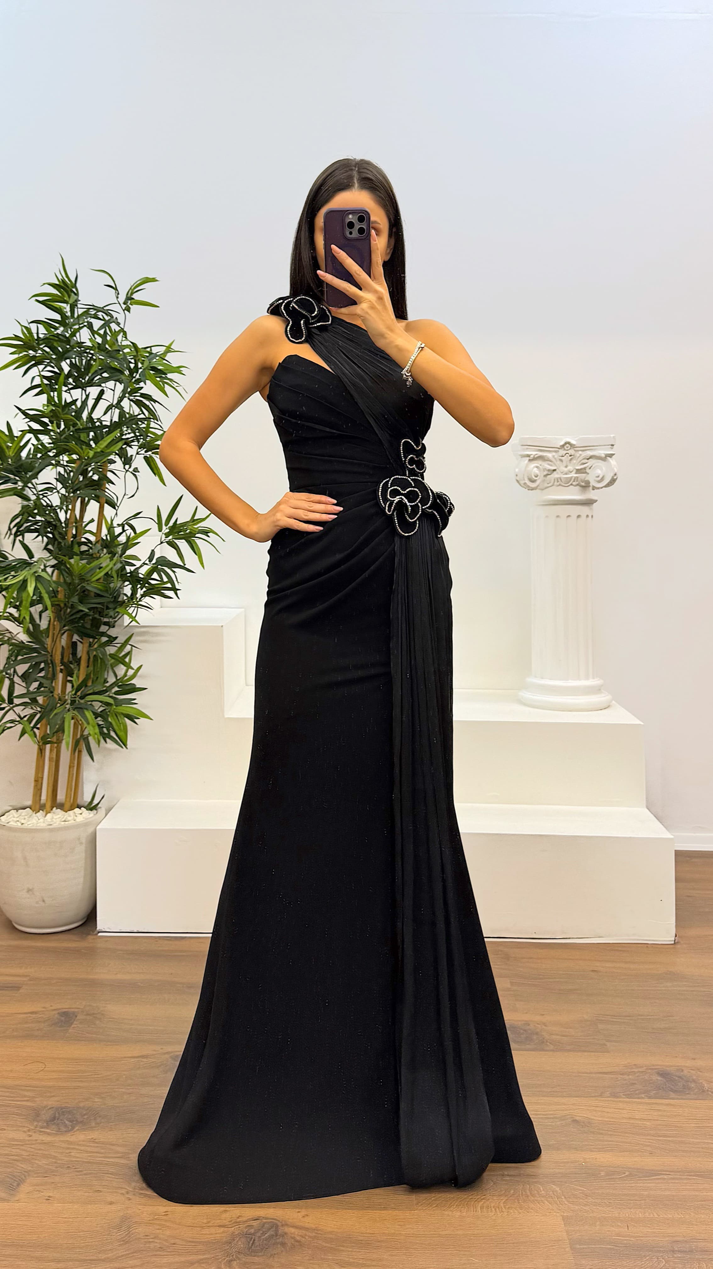 Siyah Tek Omuz Çiçek Detay Abiye Elbise
