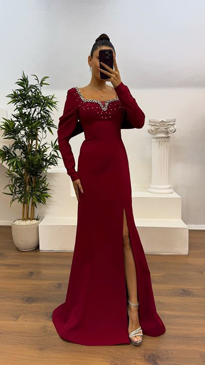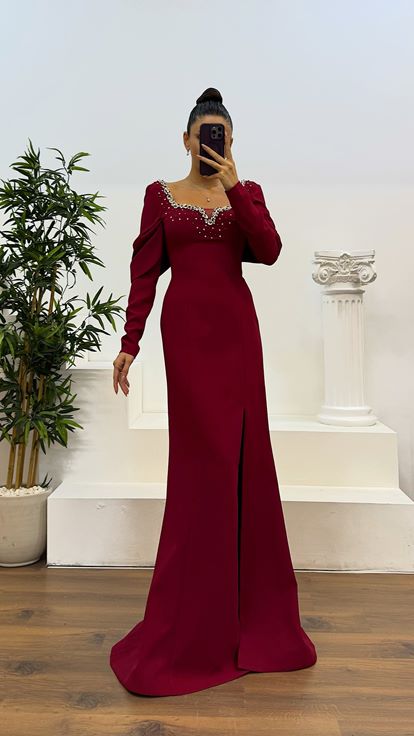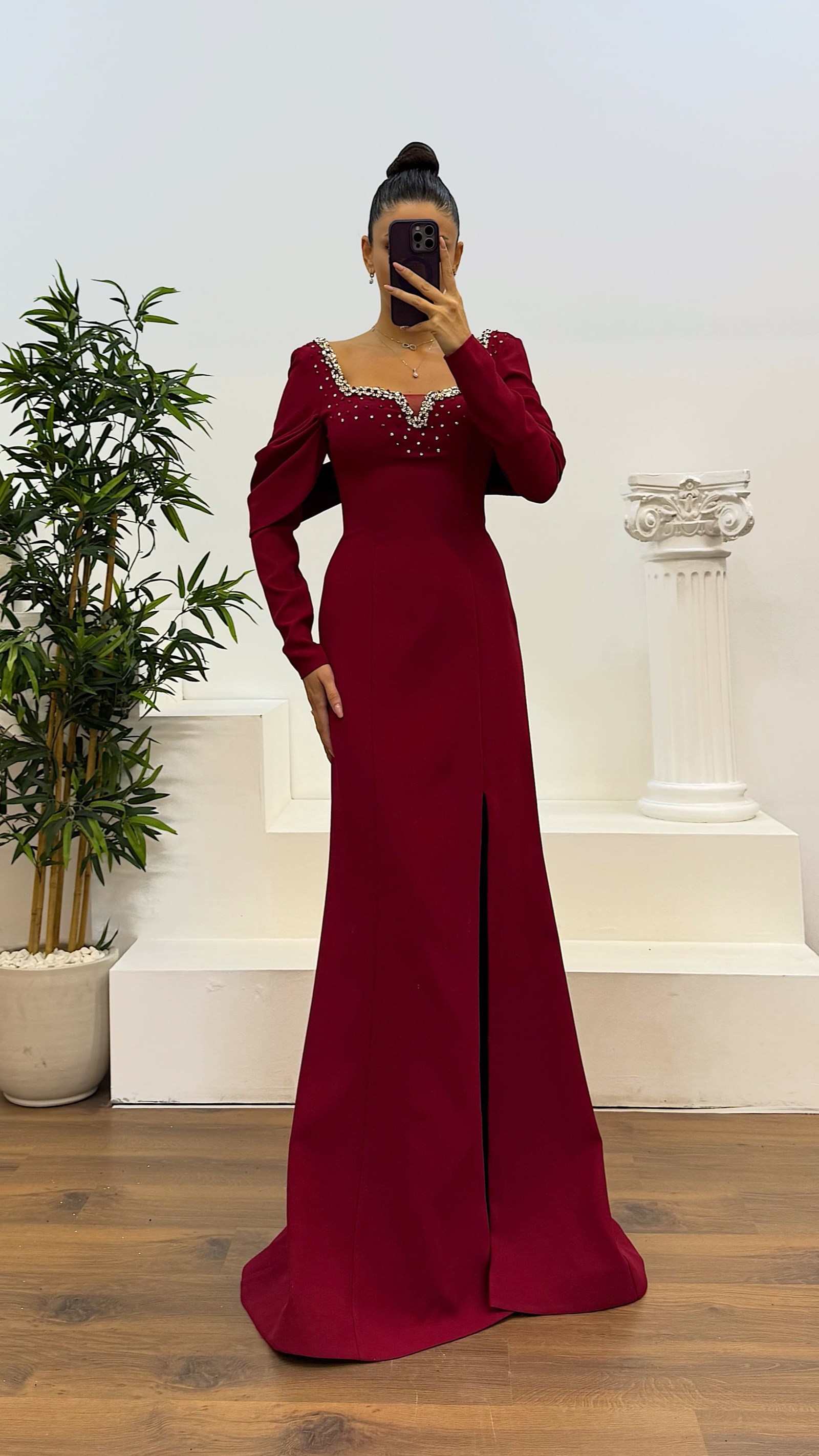 فستان سهرة بتفاصيل حجرية وياقة بورجوندي