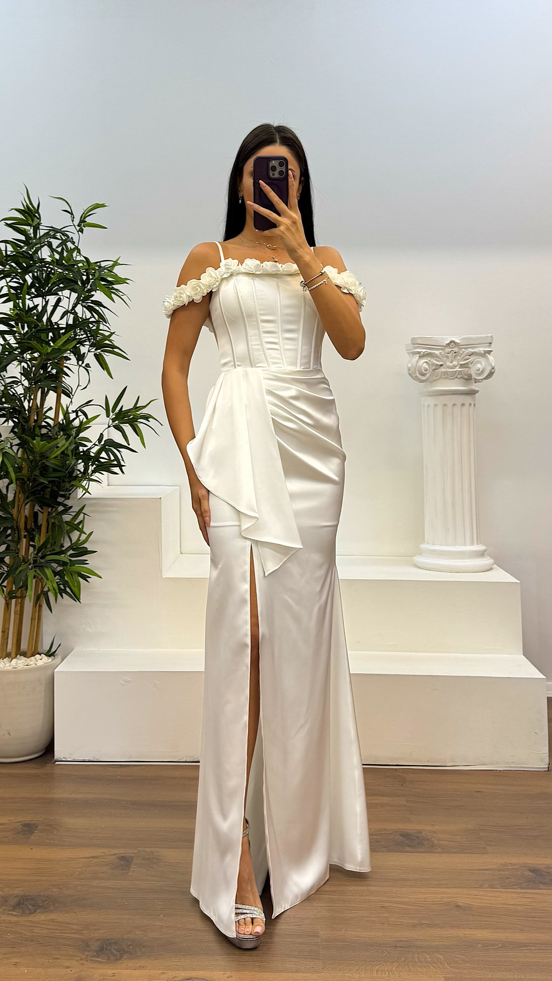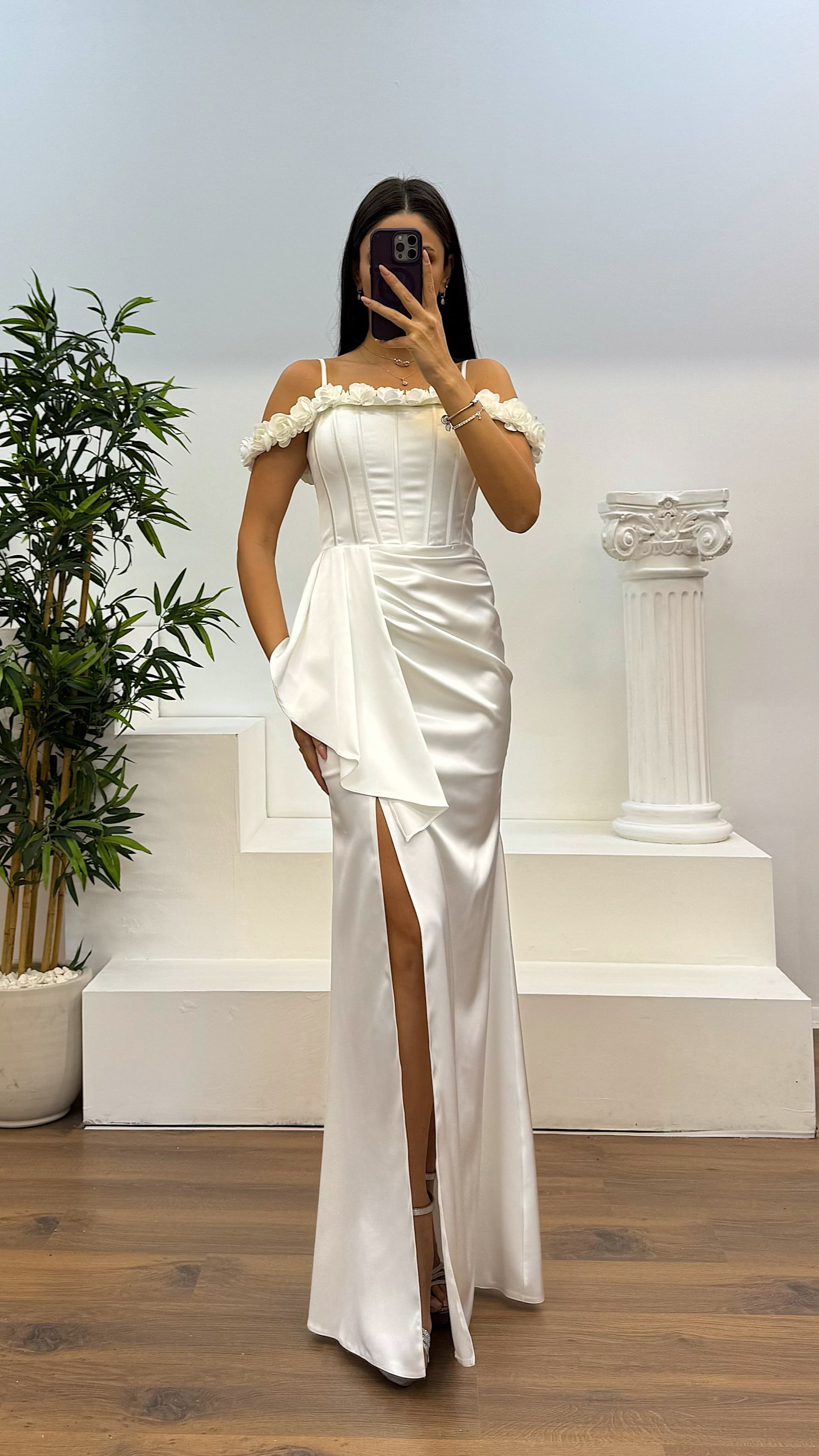 Beyaz İp Askılı Yaka Gül Detay Saten Abiye Elbise