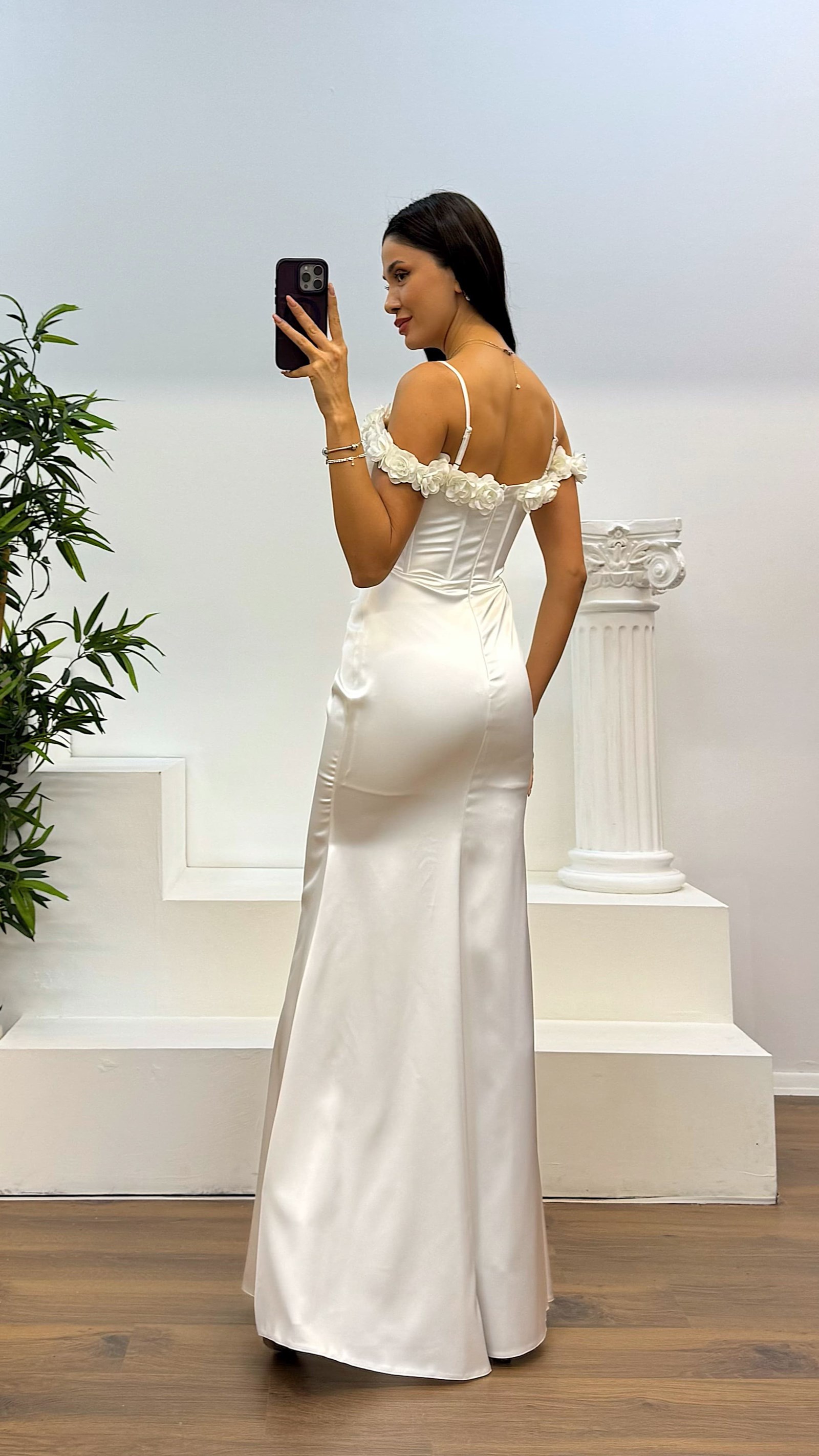 • Beyaz İp Askılı Yaka Gül Detay Saten Abiye Elbise