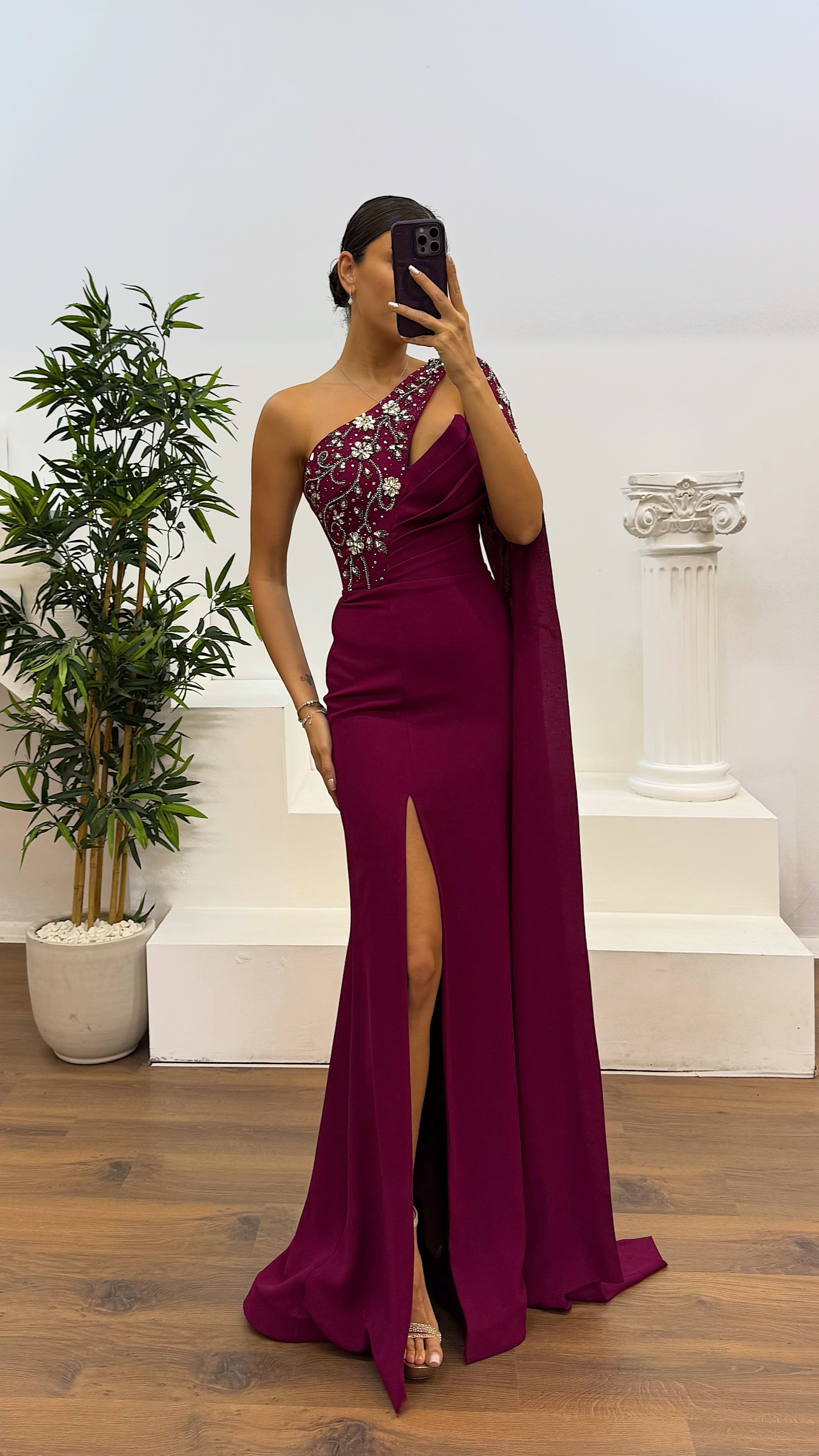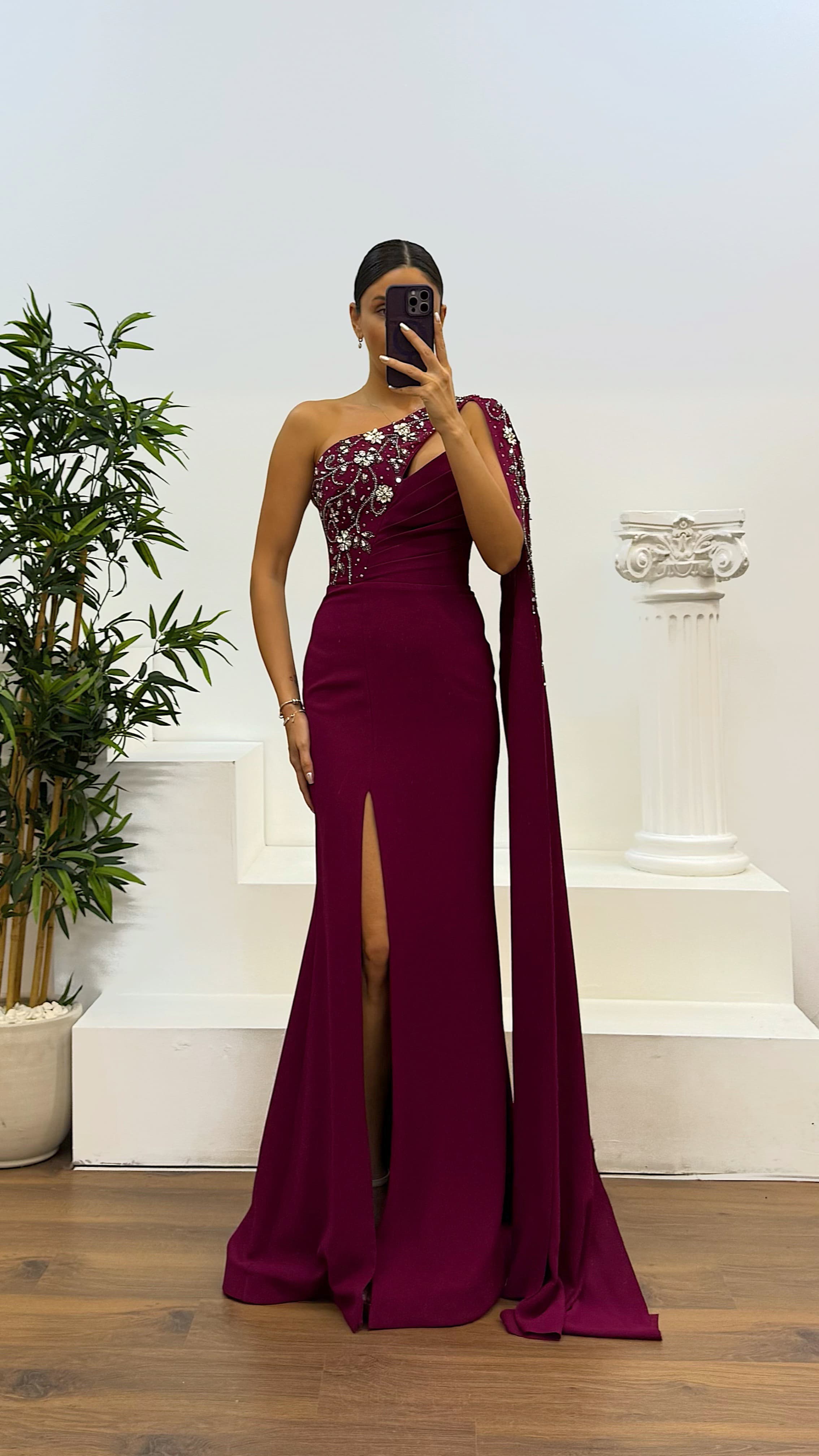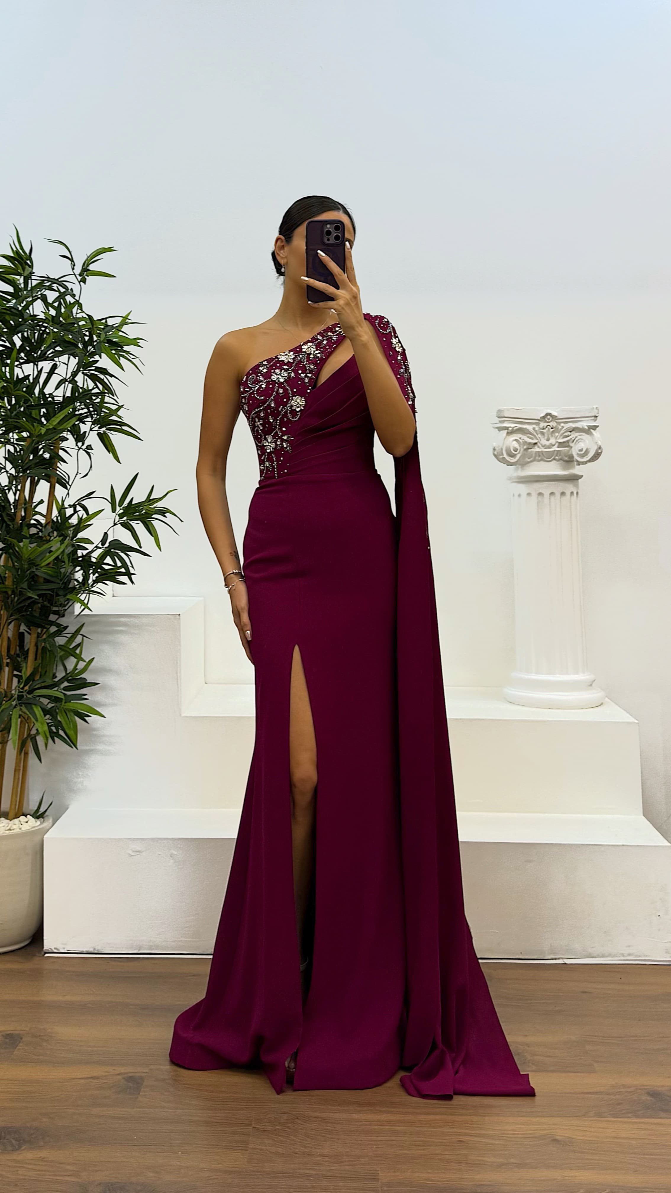 • فستان سهرة بأكمام واحدة بلون البرقوق مع تفاصيل تطريز
