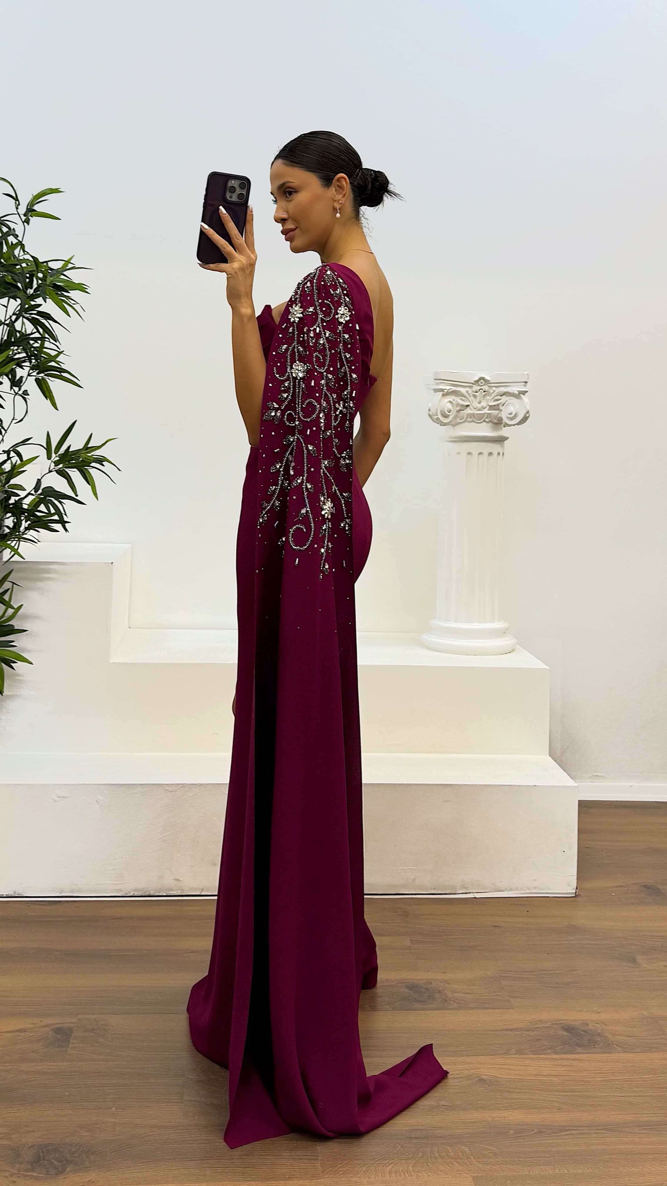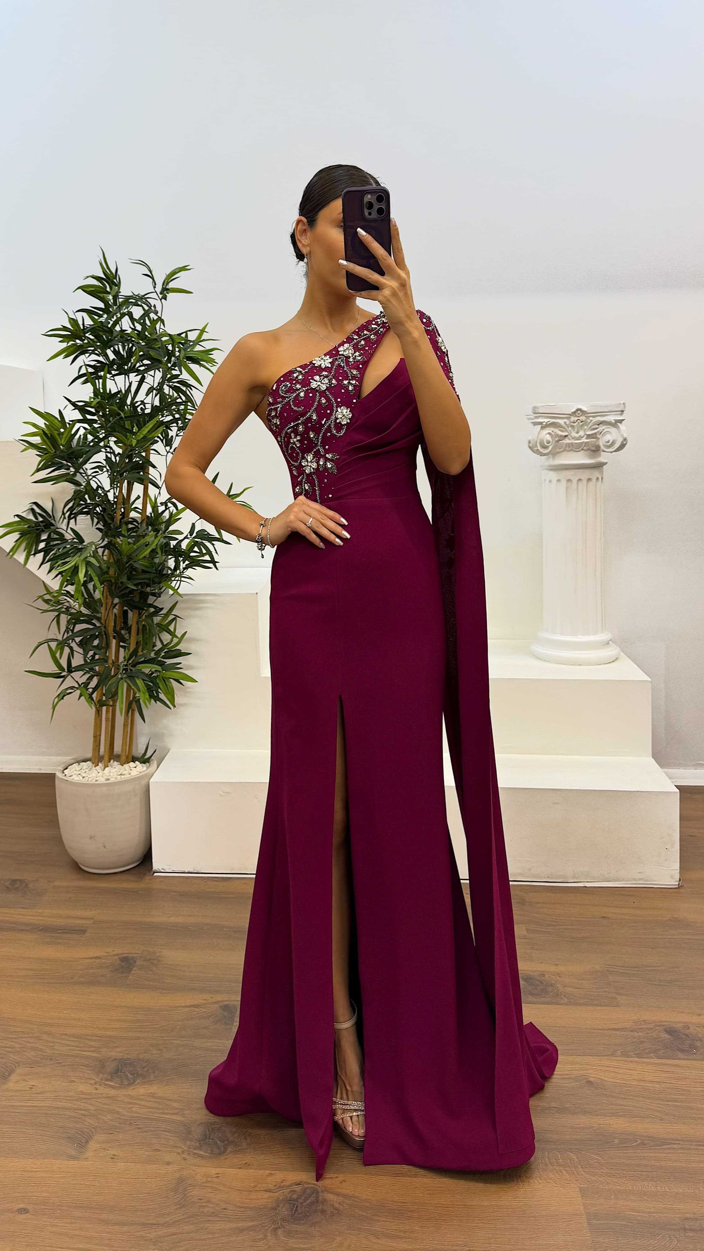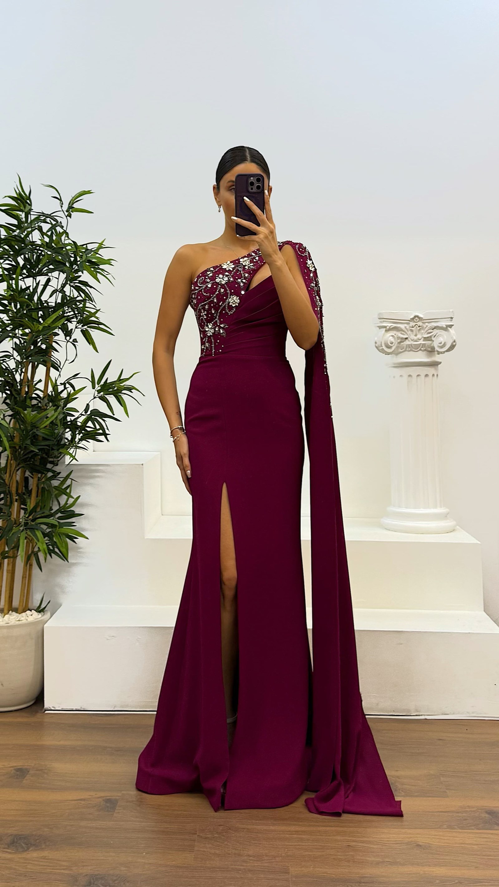 • فستان سهرة بأكمام واحدة بلون البرقوق مع تفاصيل تطريز