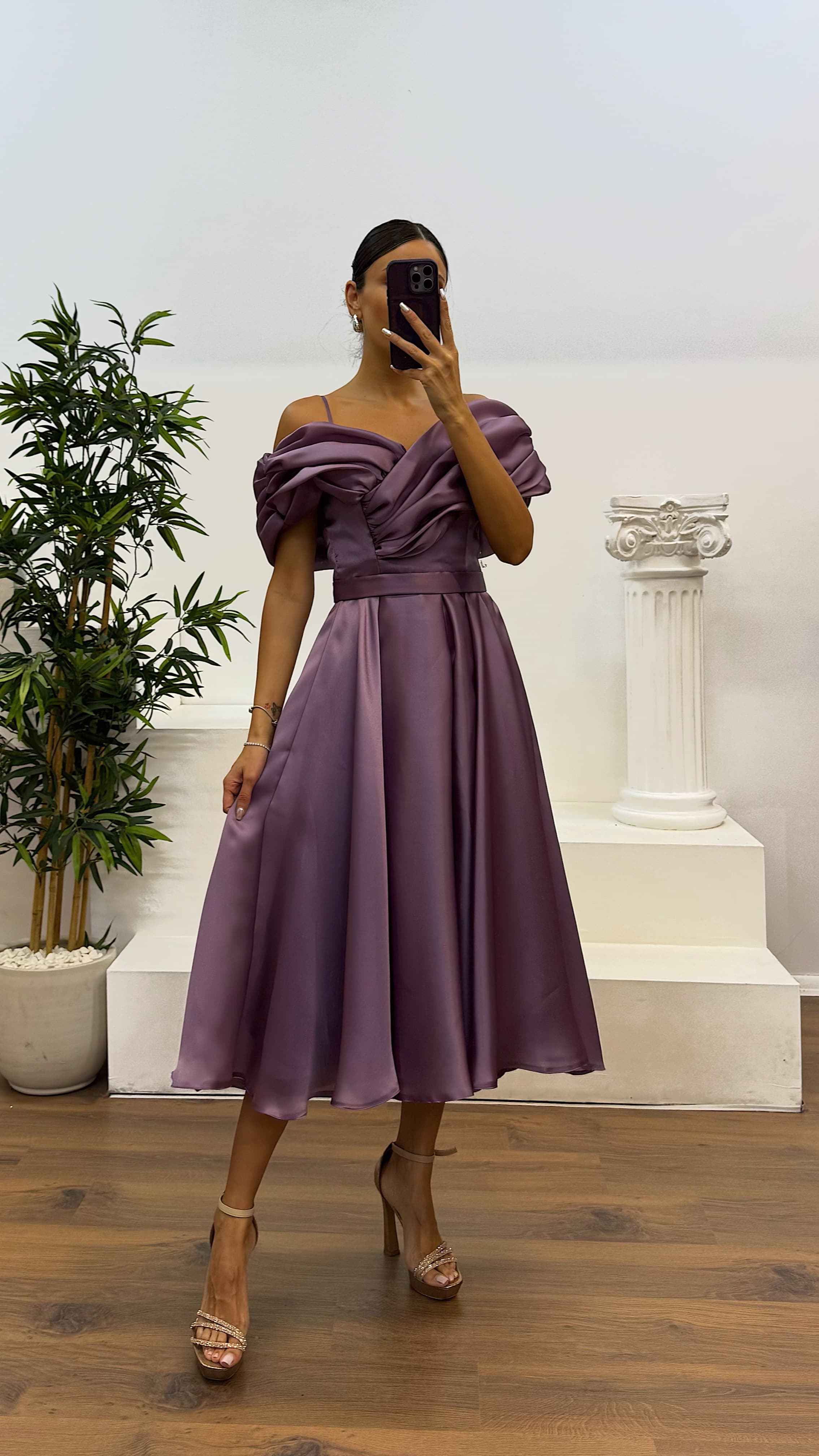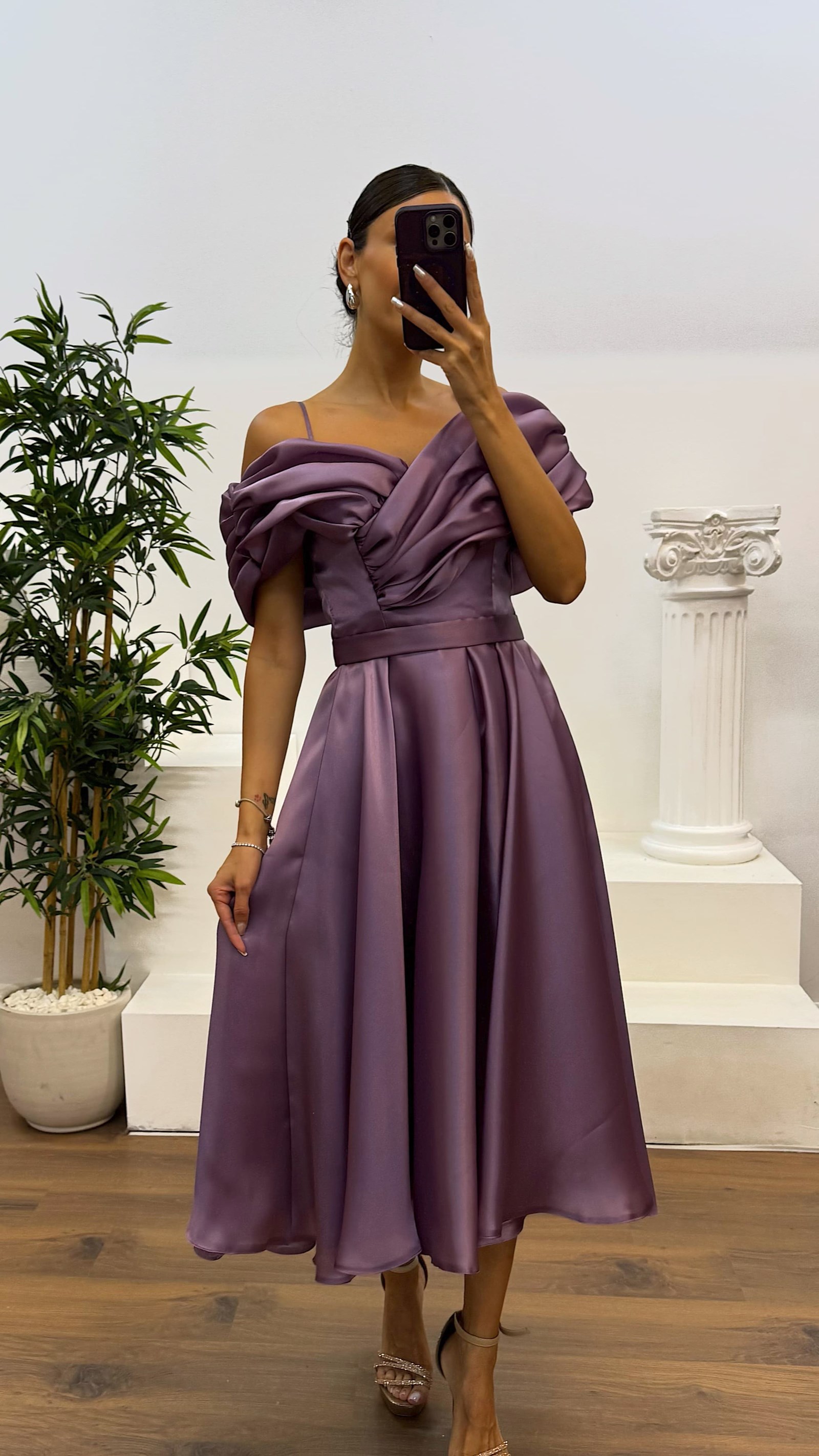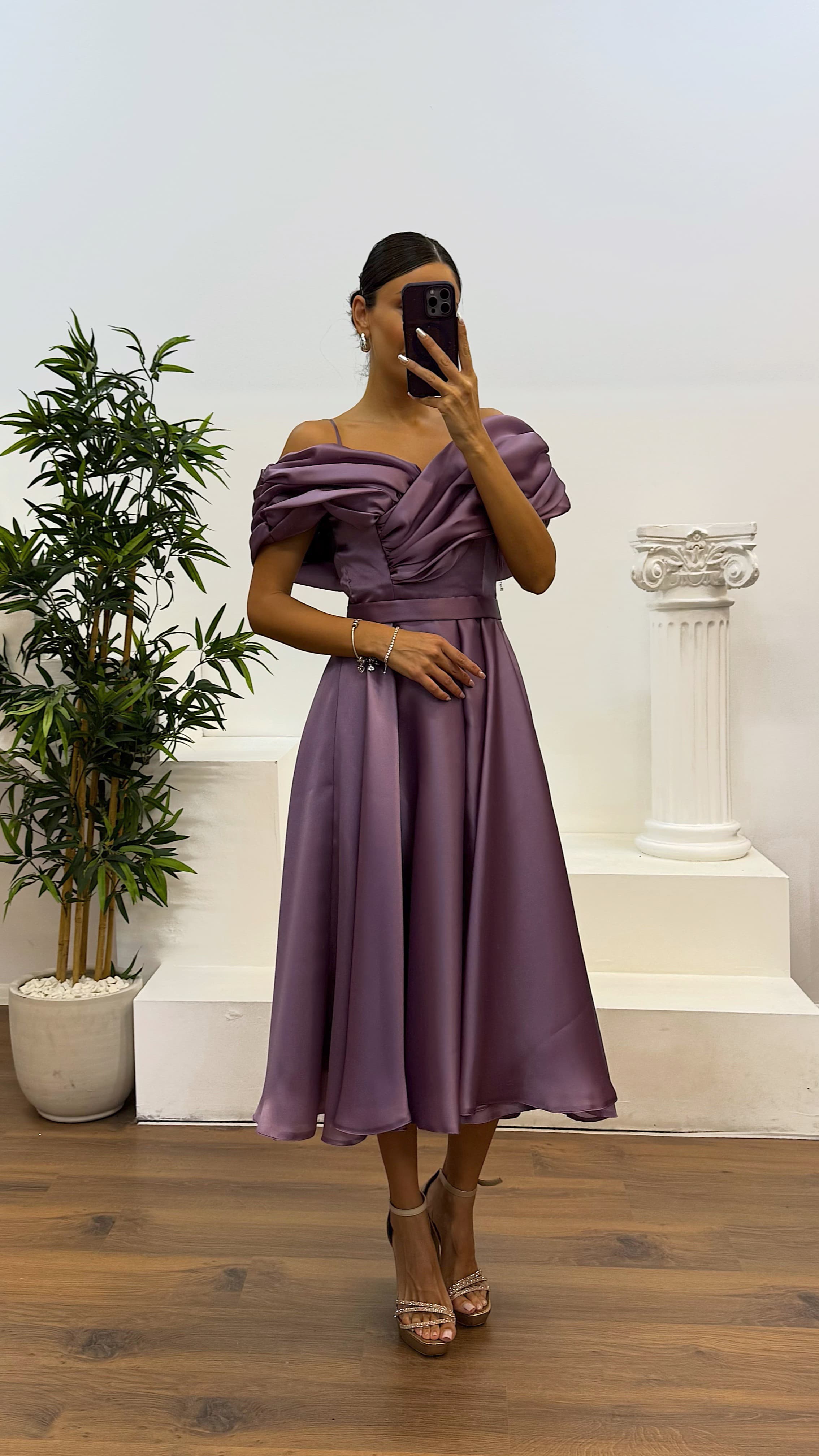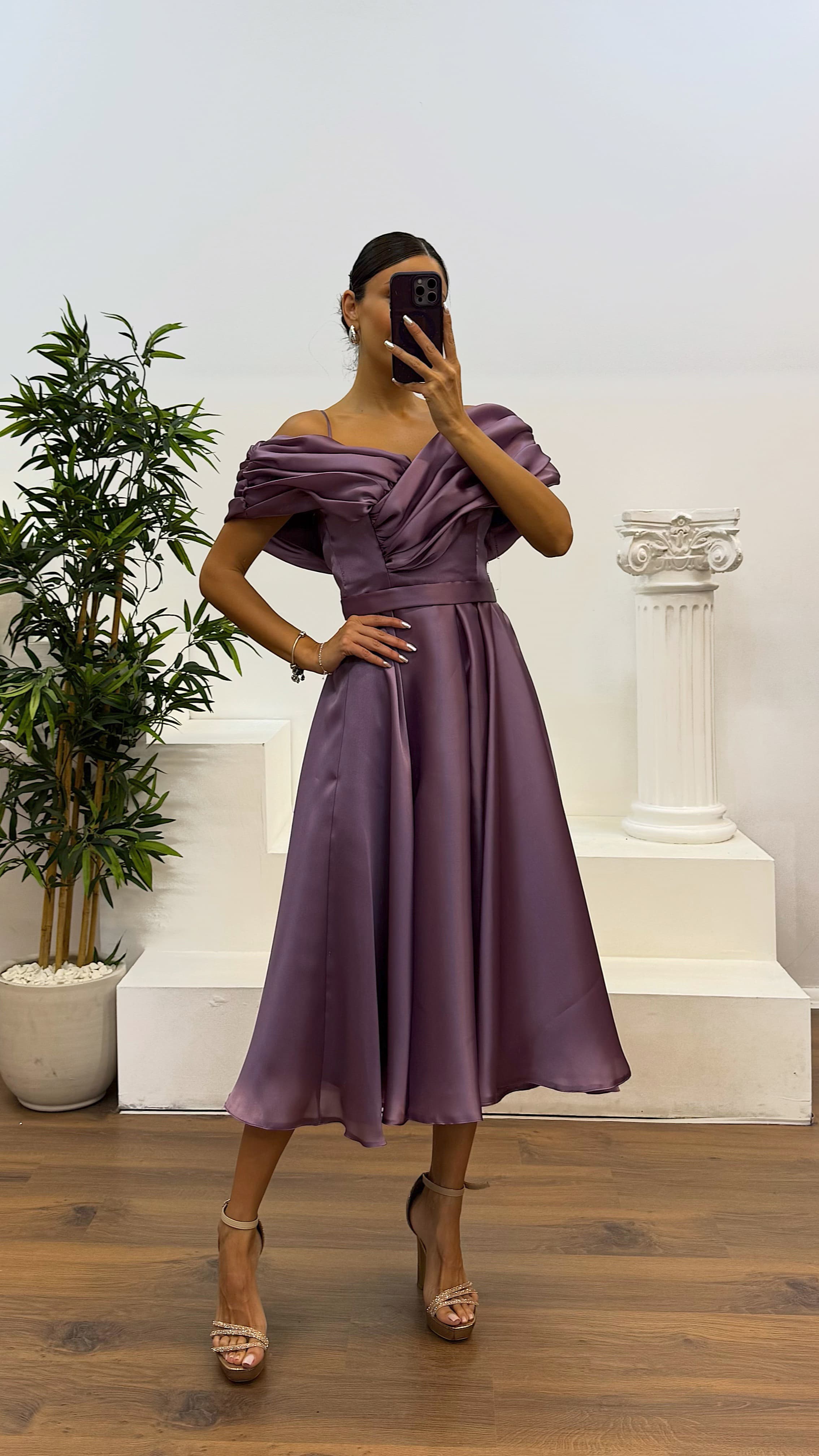 فستان سهرة متوسط ​​الطول بتفاصيل خلفية أرجواني