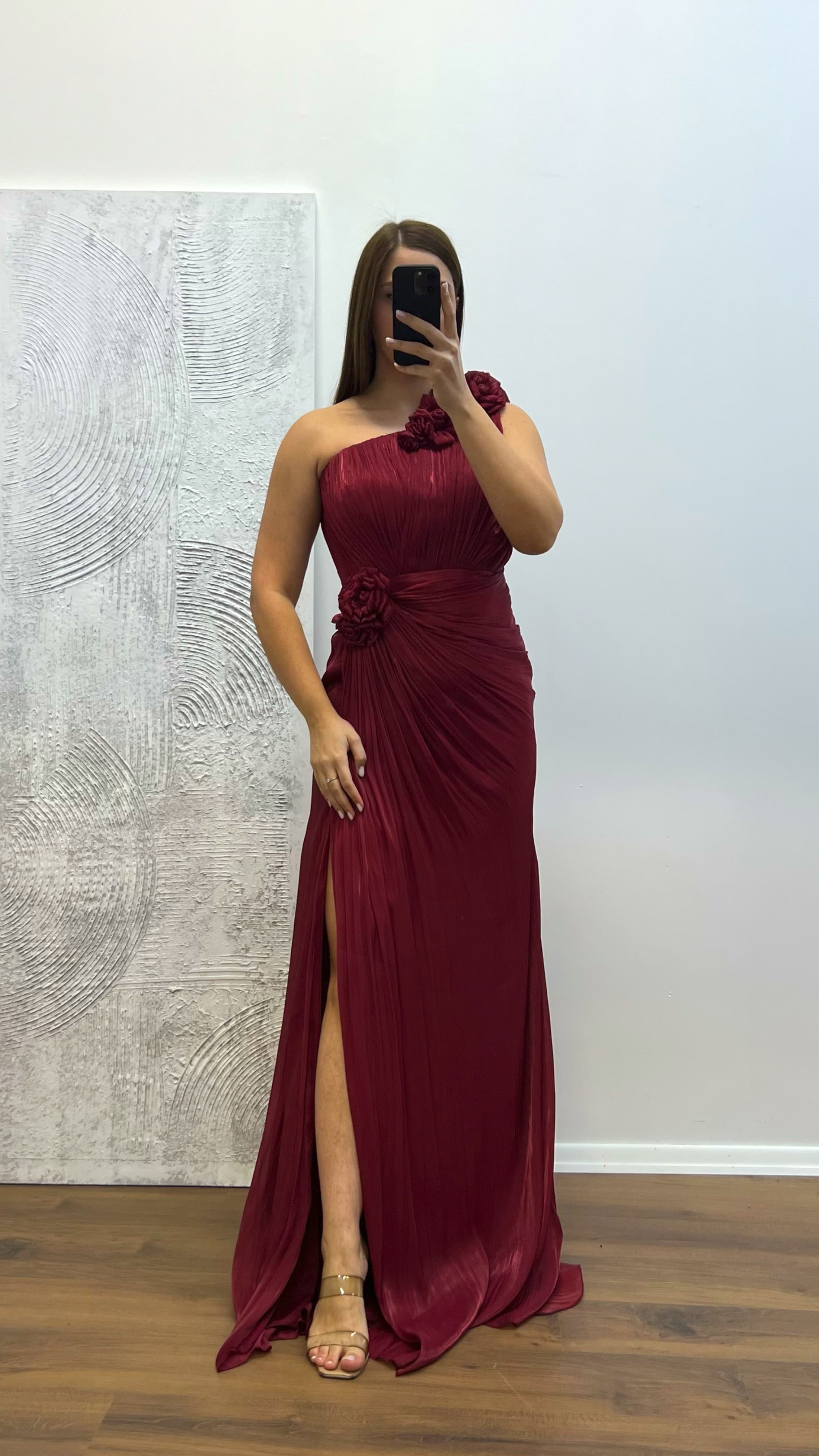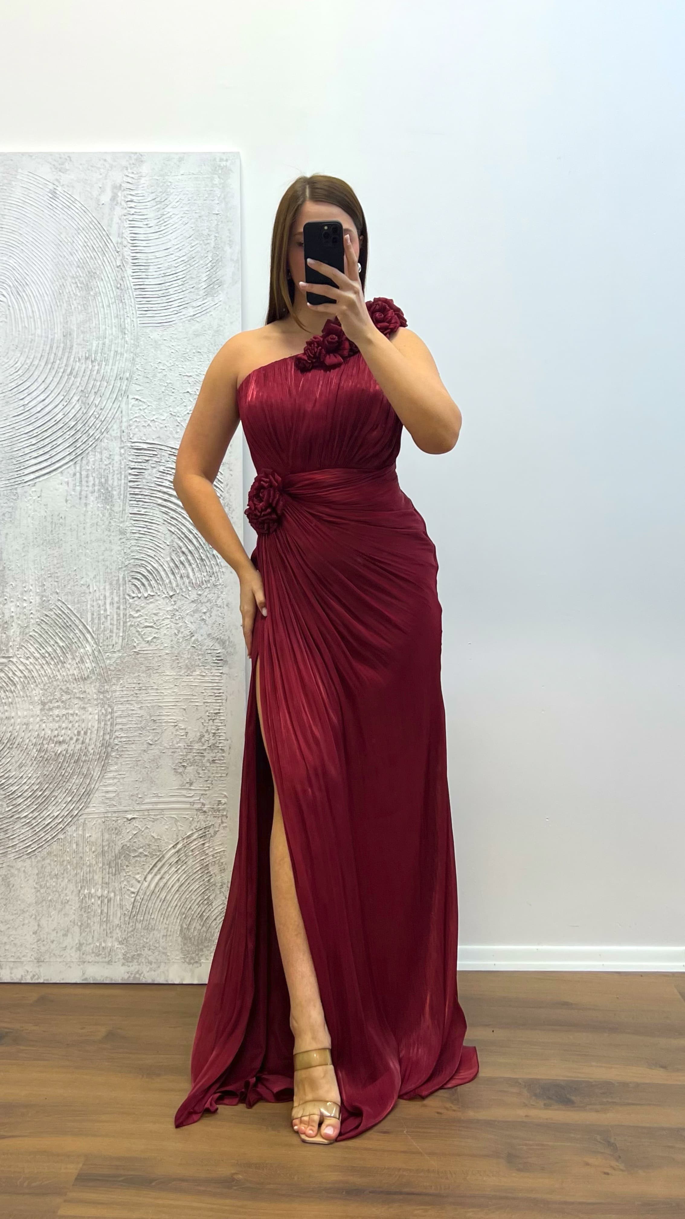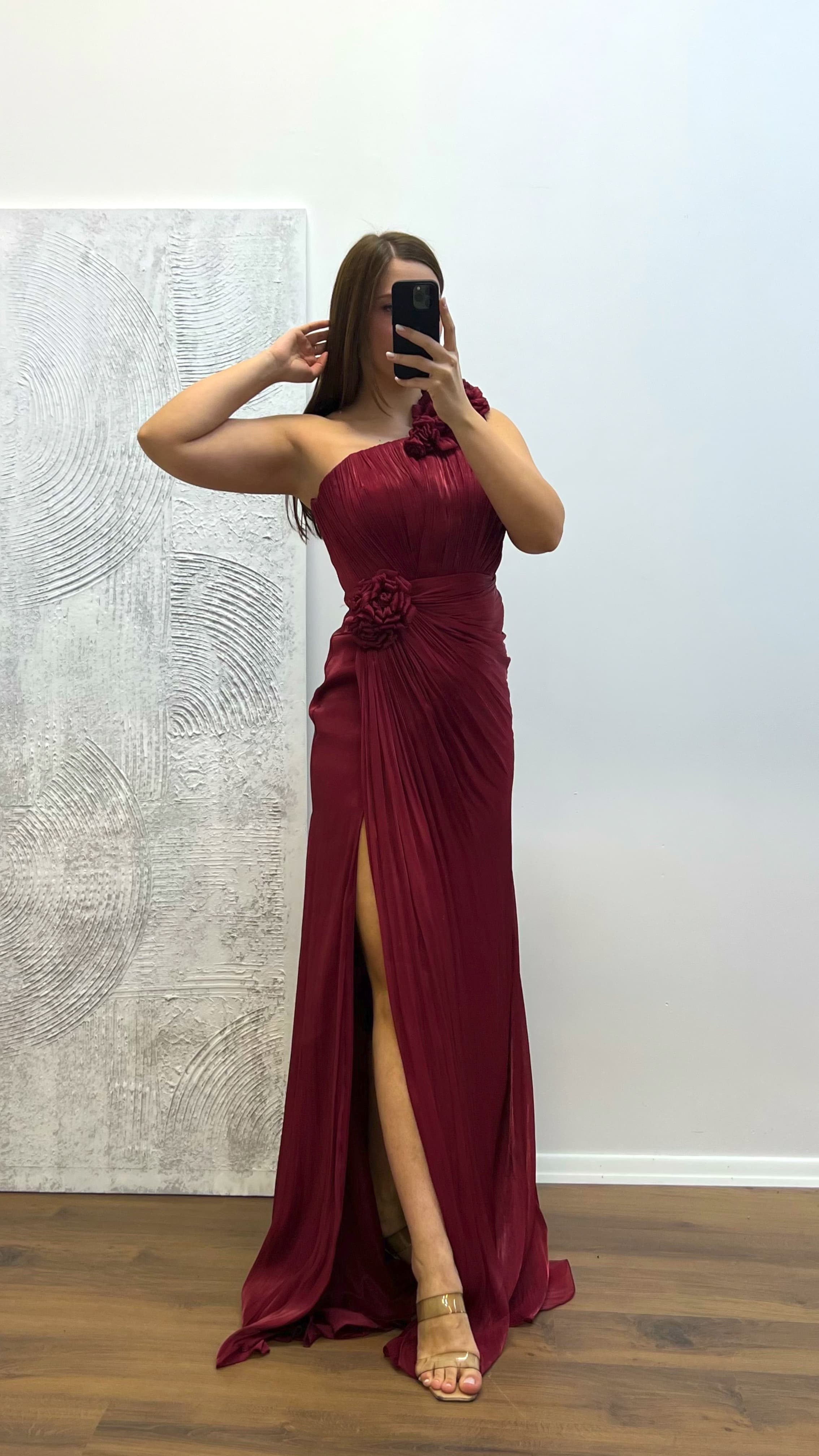 • Kırmızı Tek Omuz Çiçek Detay Büyük Beden Abiye Elbise