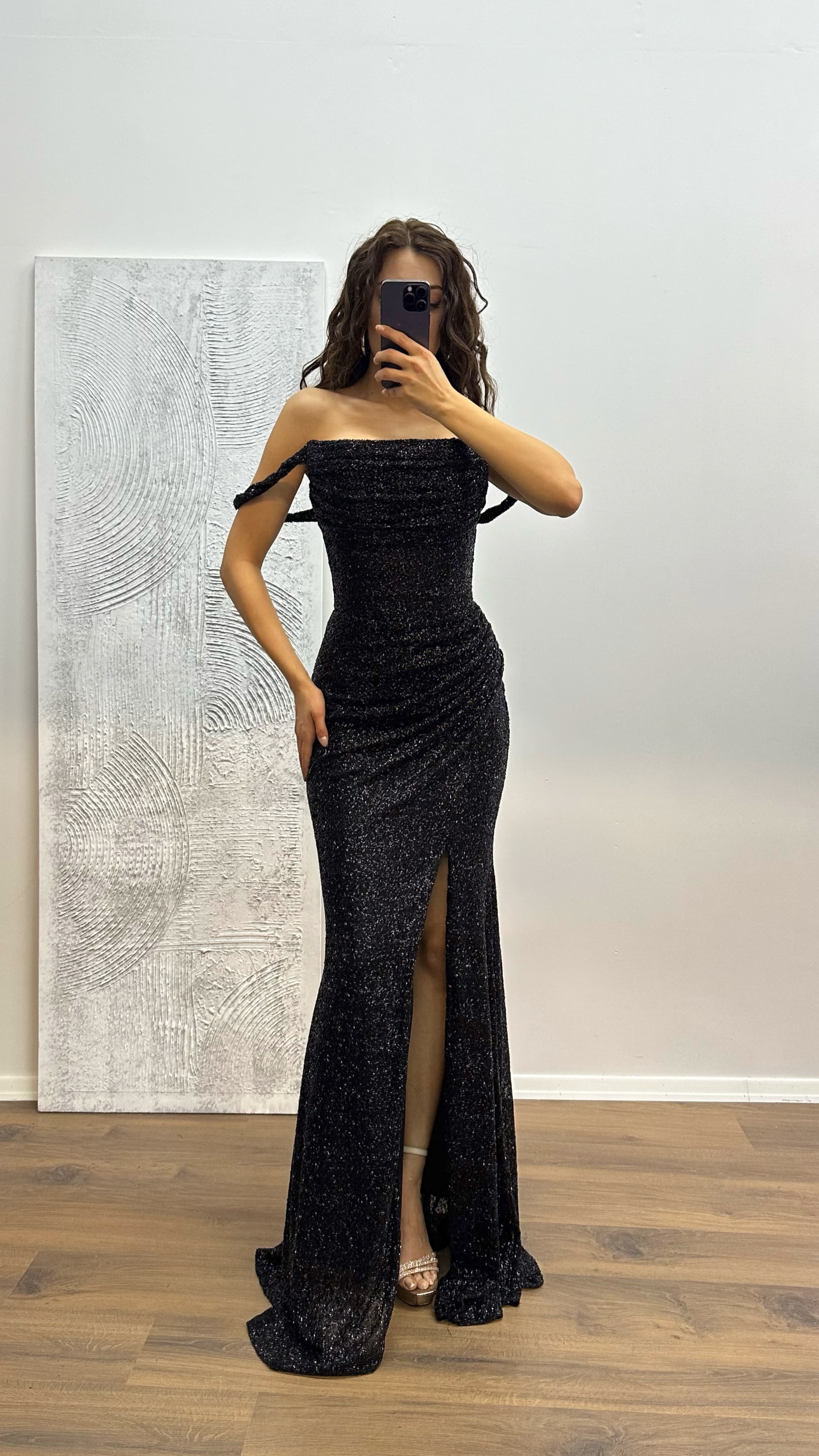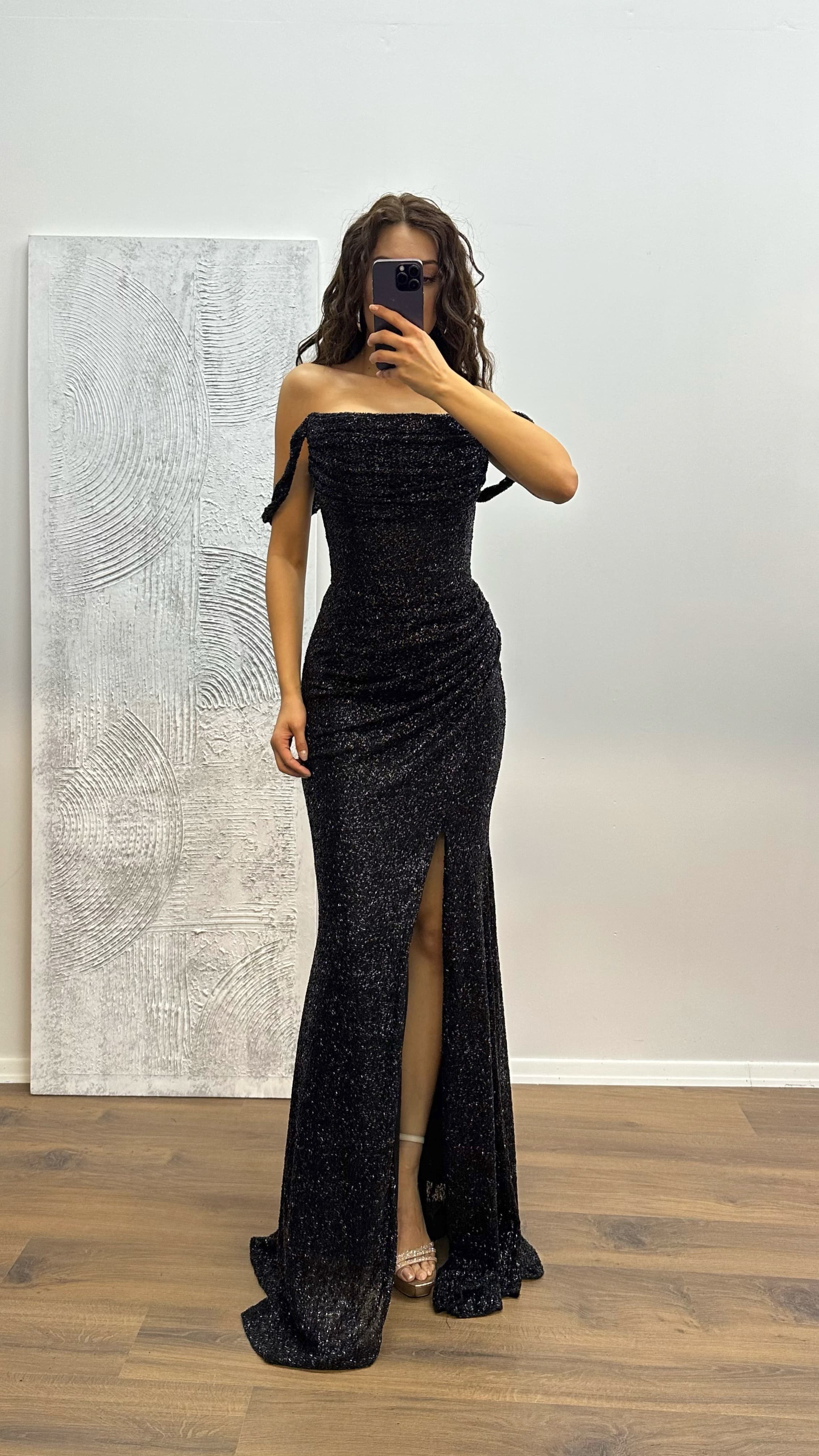 فستان سهرة أسود شفاف ومفصل