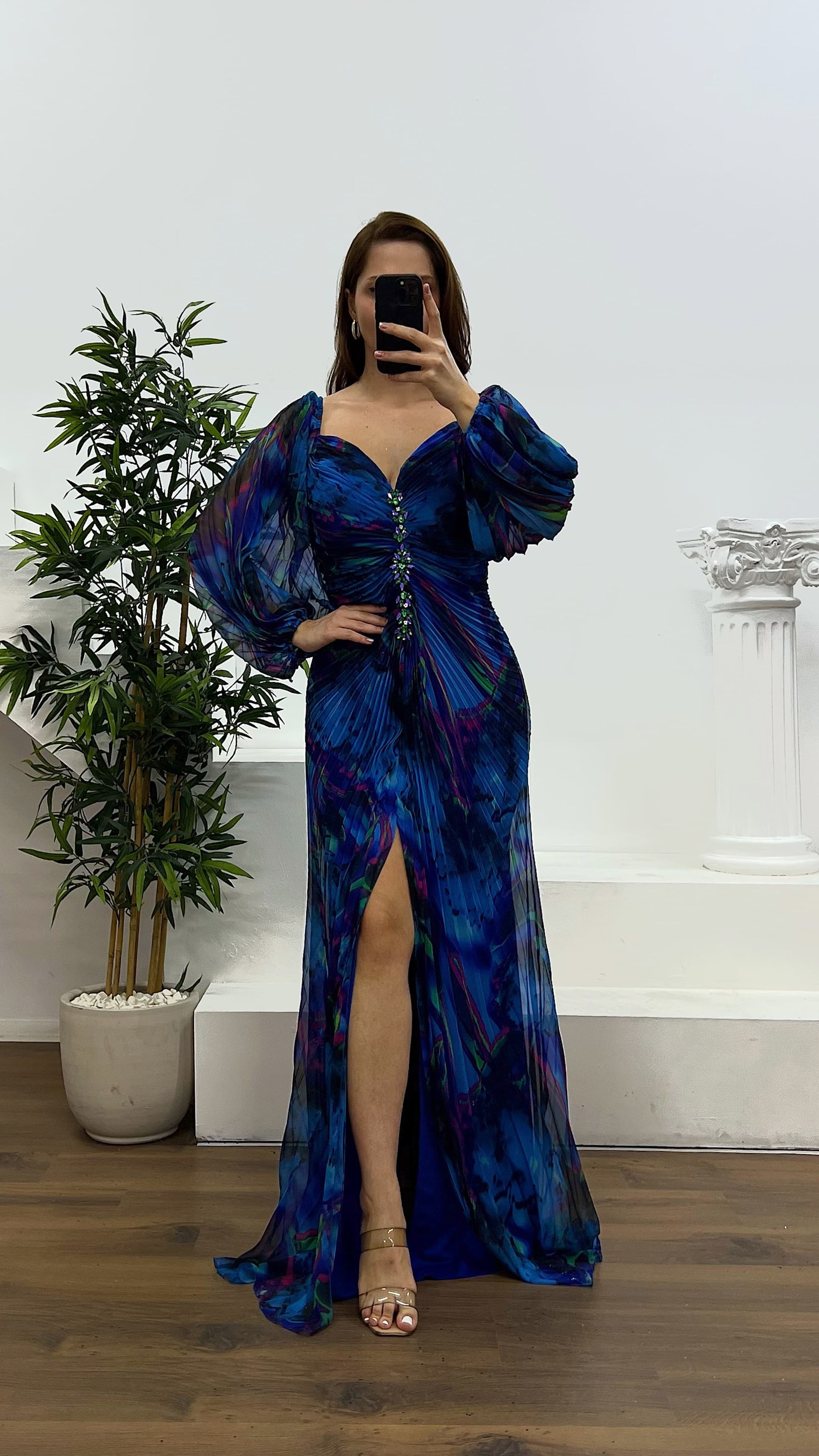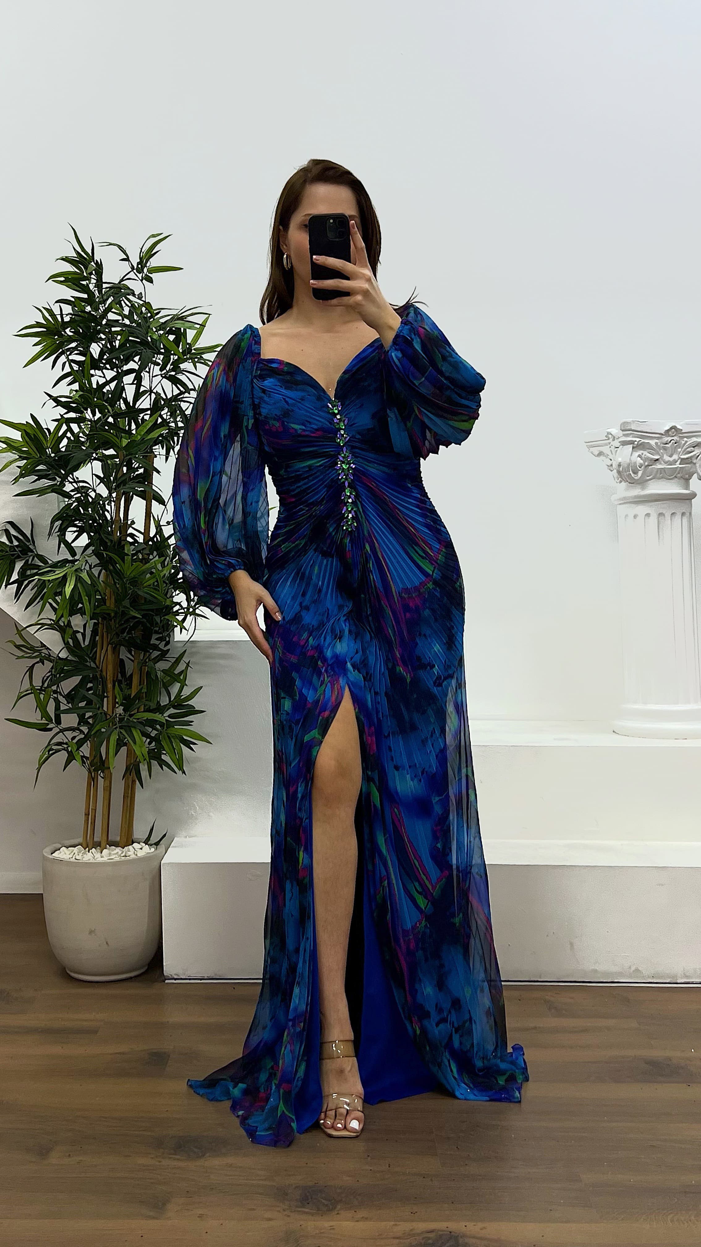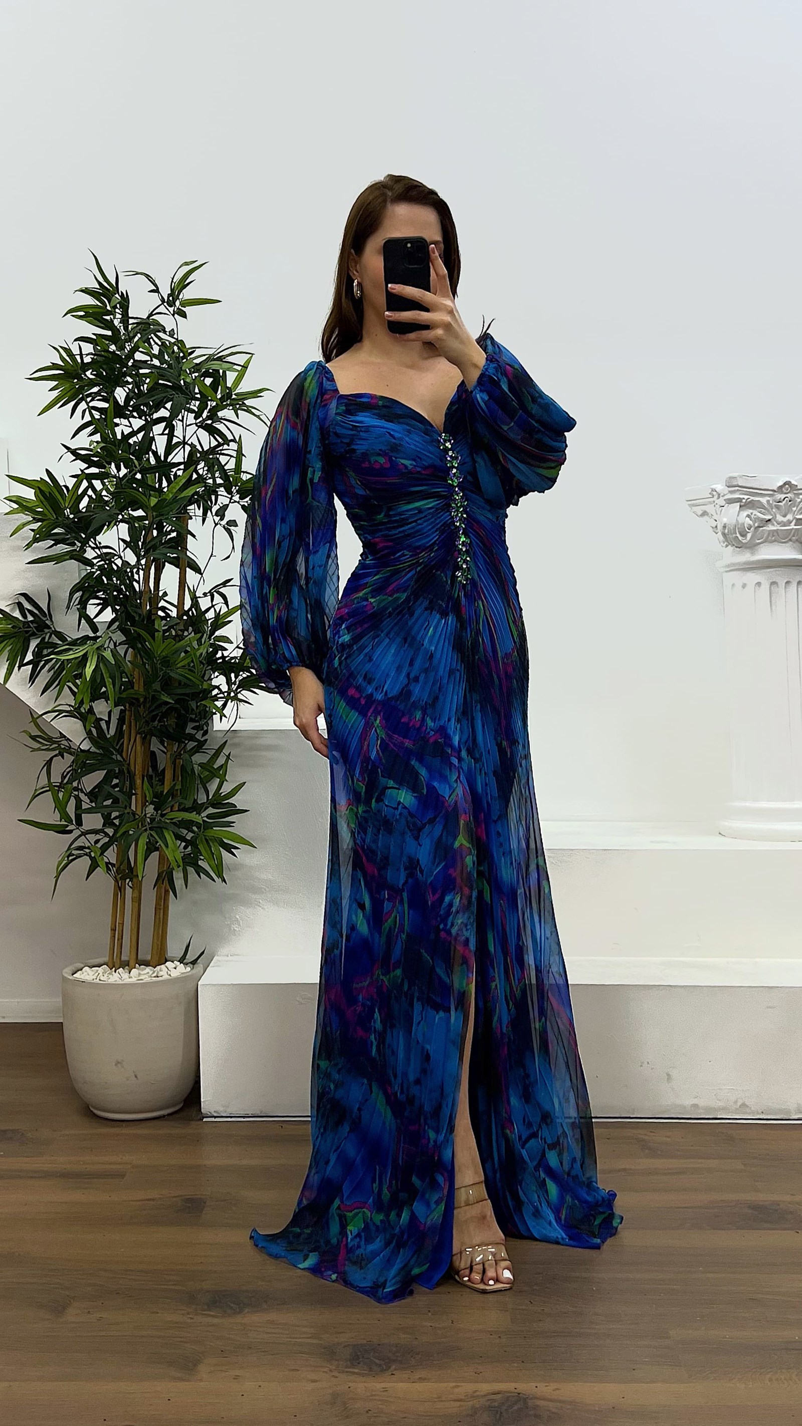 فستان سهرة بكسرات وتفصيل بروش المنتج مناسب للمقاسات من 44 إلى 48، يحتوي على بطانة داخلية في منطقة الصدر، مبطّن بالكامل، بسحاب خلفي، شق جانبي، ومصمم كفستان سهرة بكسرات. طول الفستان: يتراوح بين 165 و170 سم. طول الكم: 65 سم. نوع القماش: شيفون، 66% فيسكوز، 34% بوليستر.