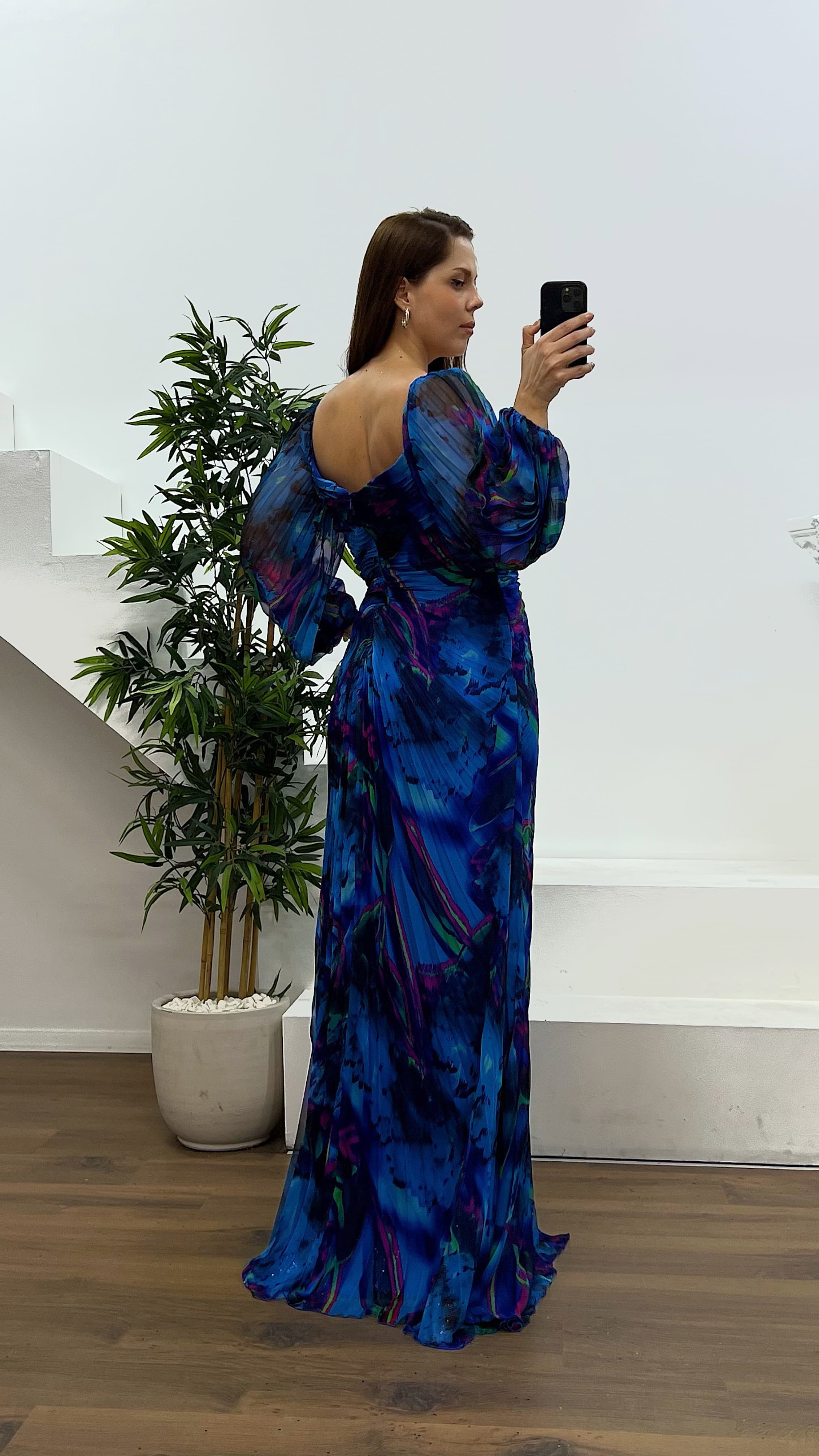 • فستان سهرة بمقاس كبير وتفاصيل بروش باللون الأزرق