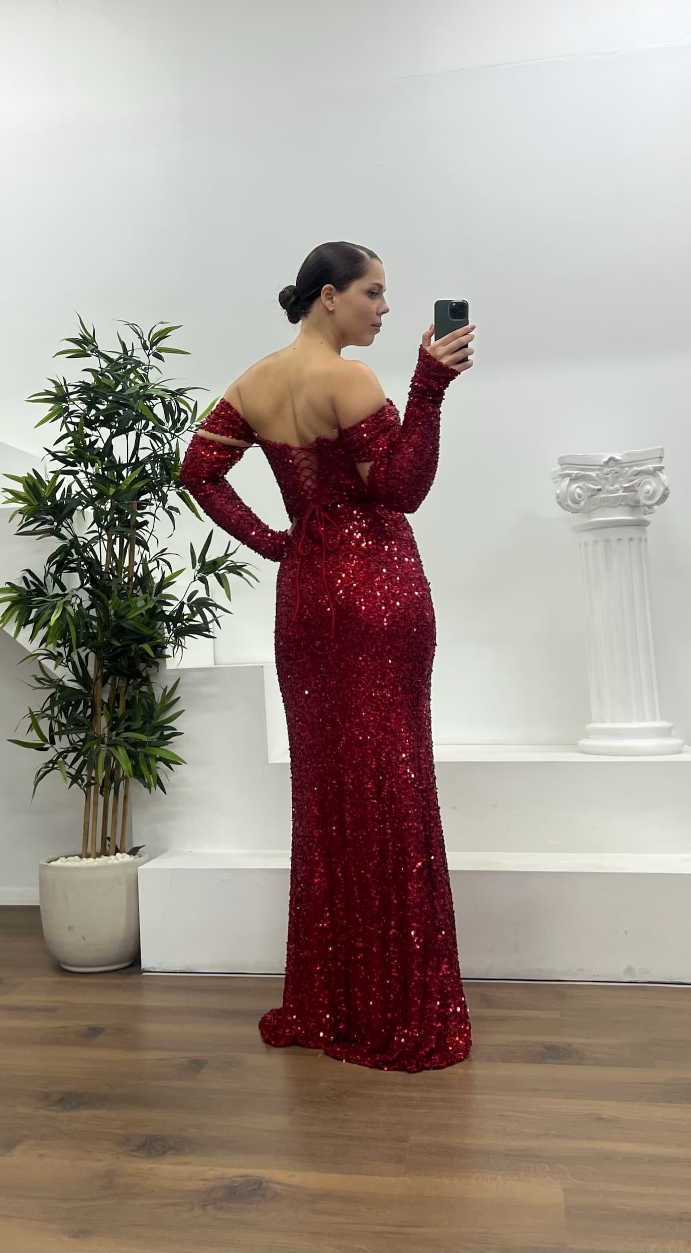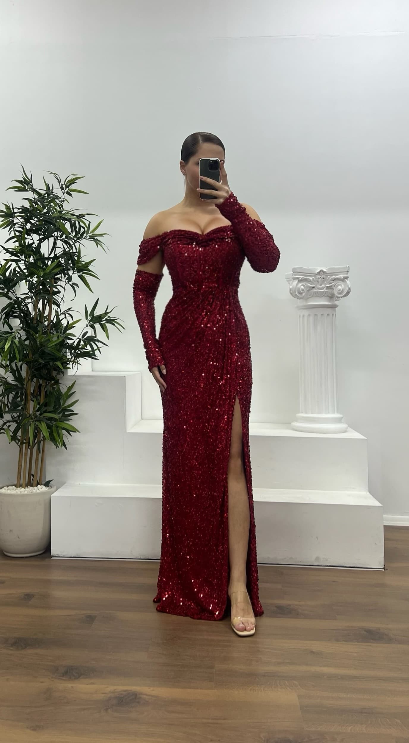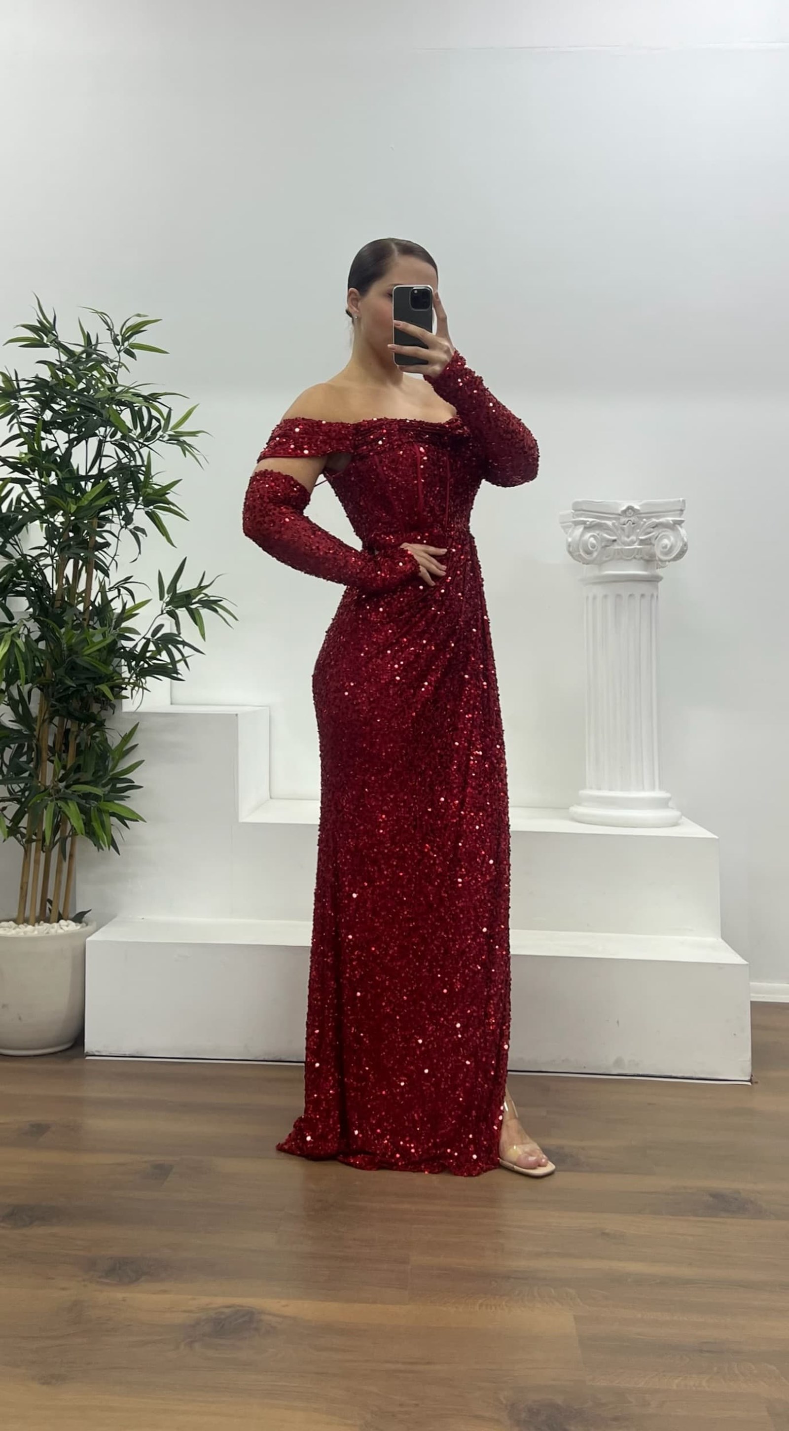 • Kırmızı Kayık Yaka Pul Payet Büyük Beden Abiye Elbise