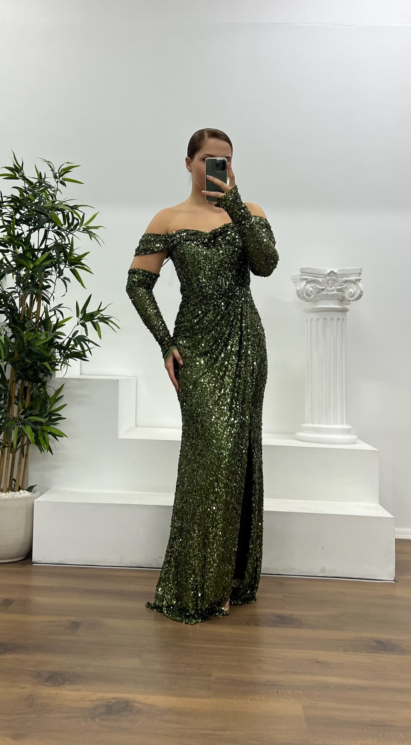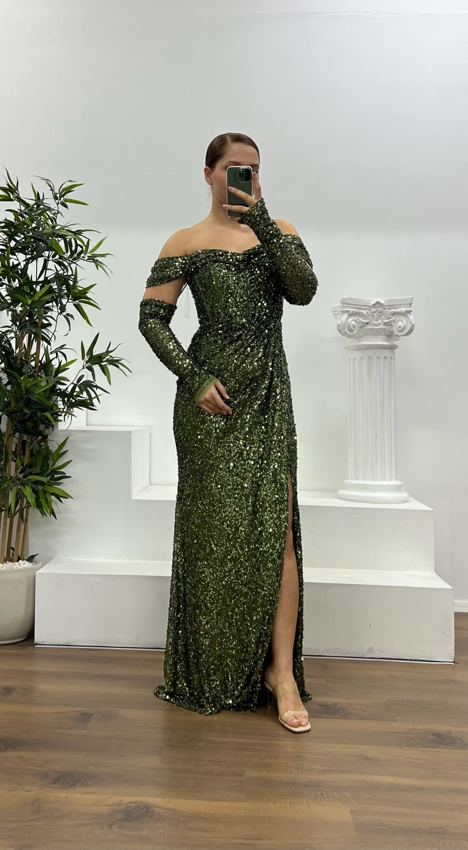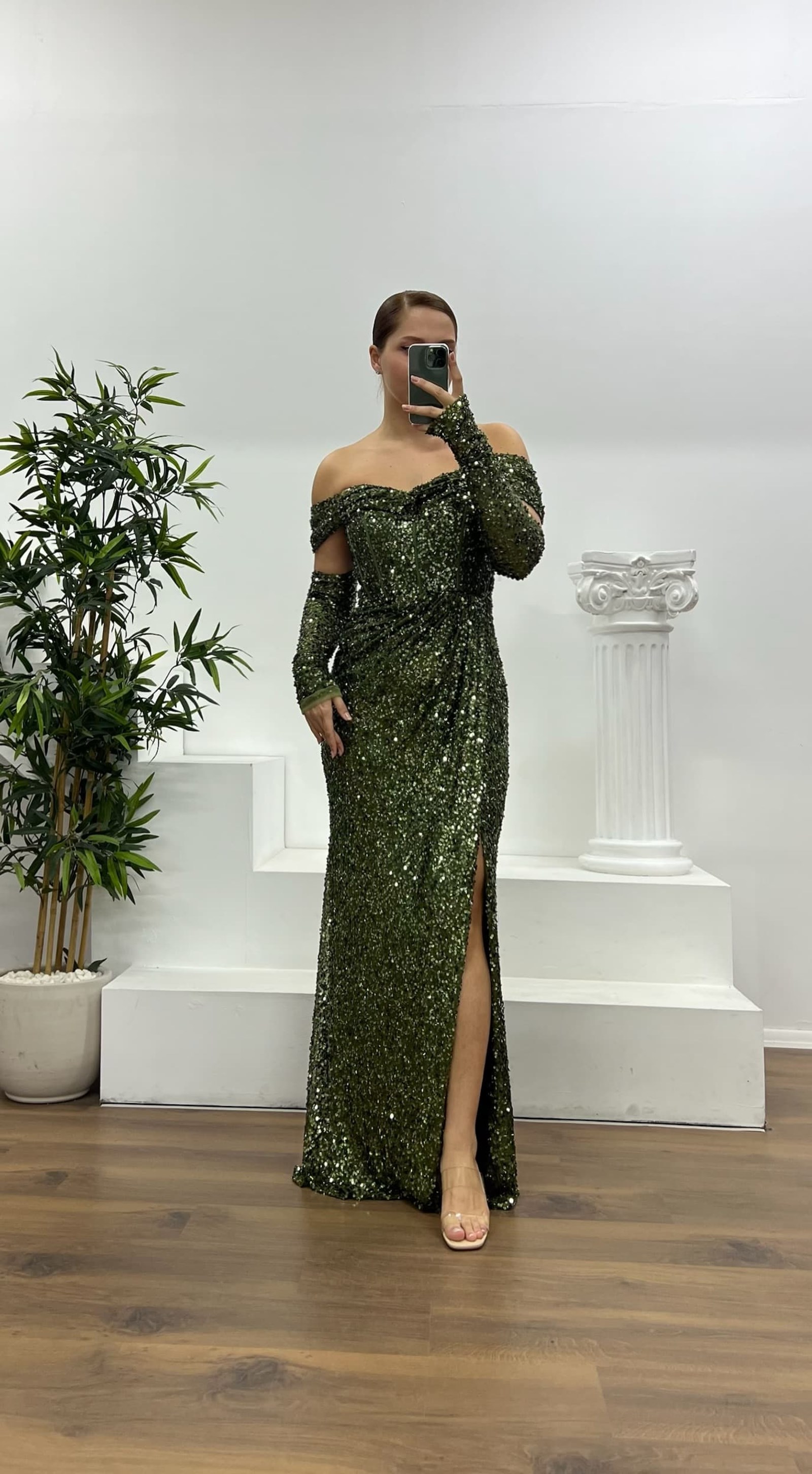 • Haki Kayık Yaka Pul Payet Büyük Beden Abiye Elbise