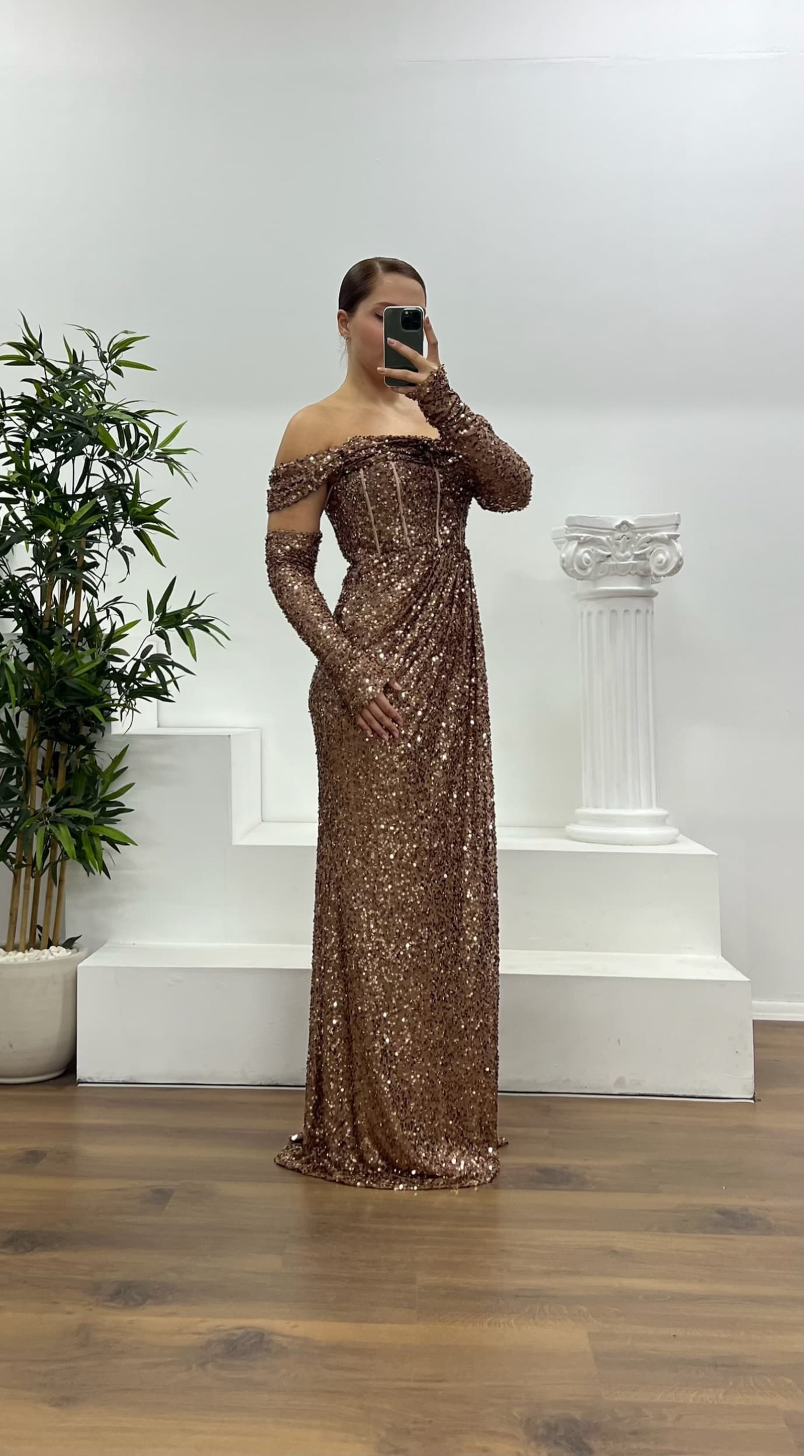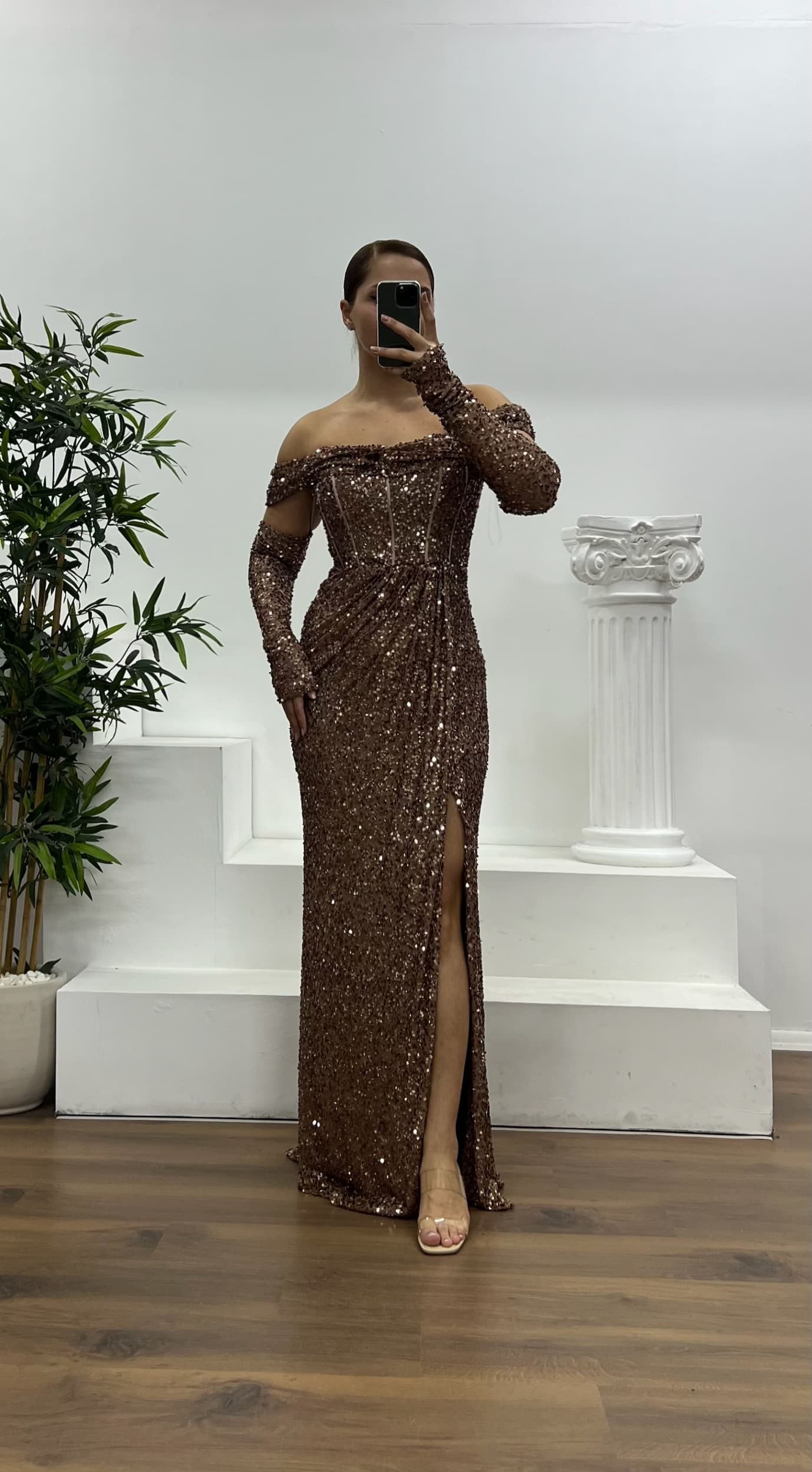 • Kahve Kayık Yaka Pul Payet Büyük Beden Abiye Elbise