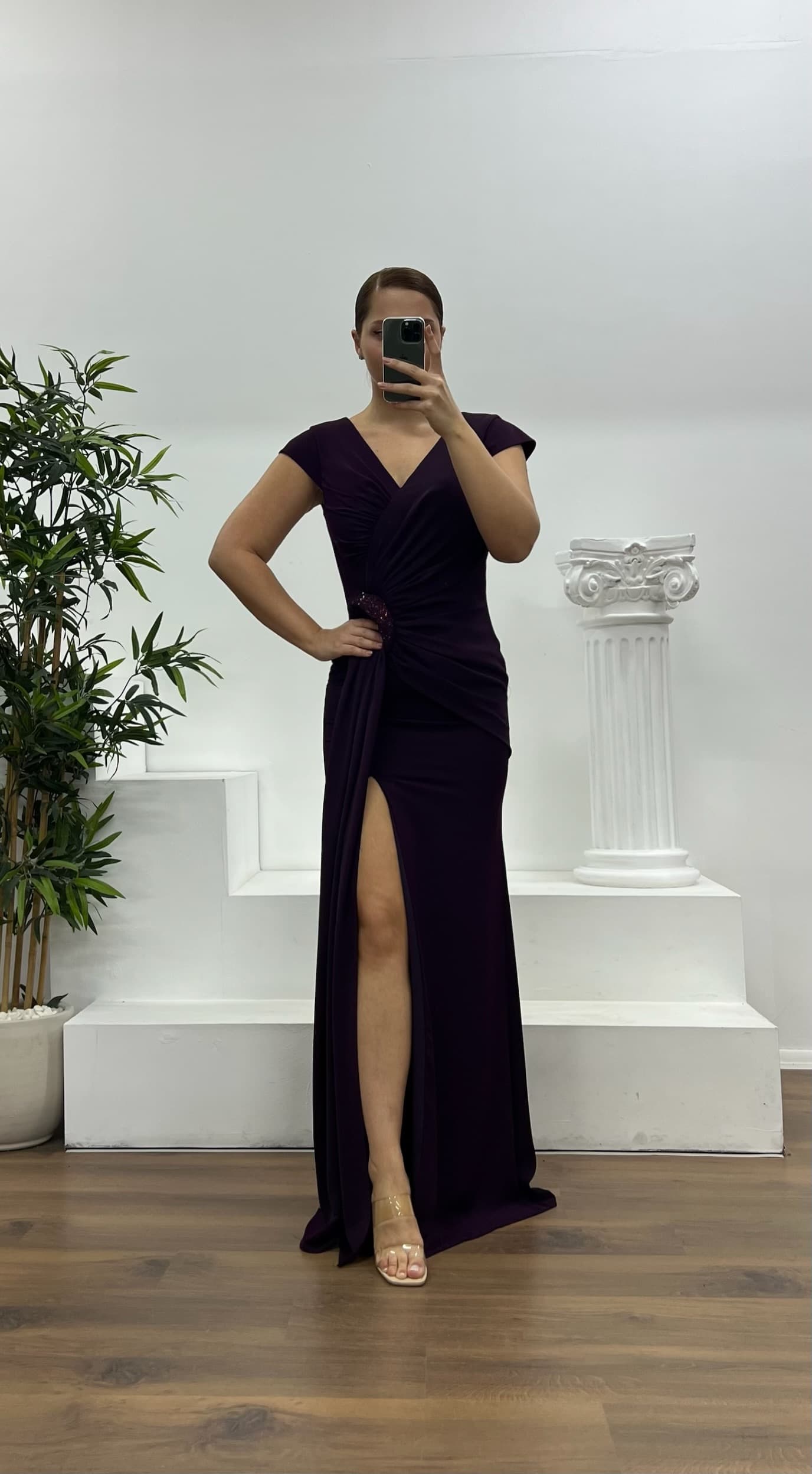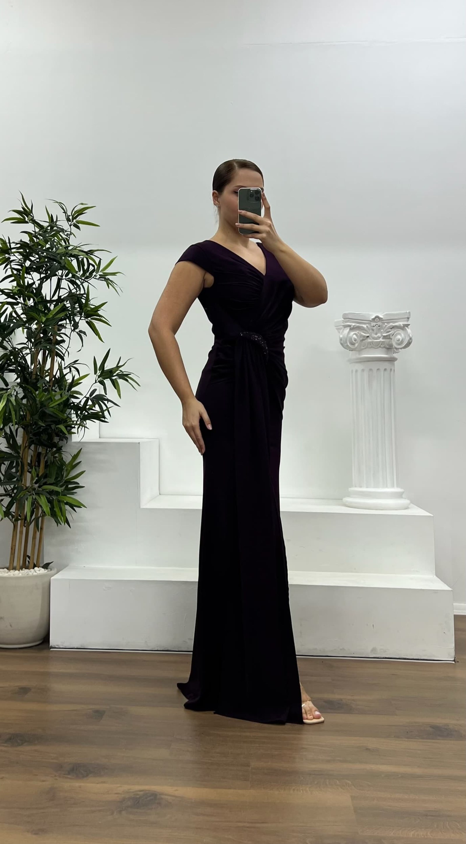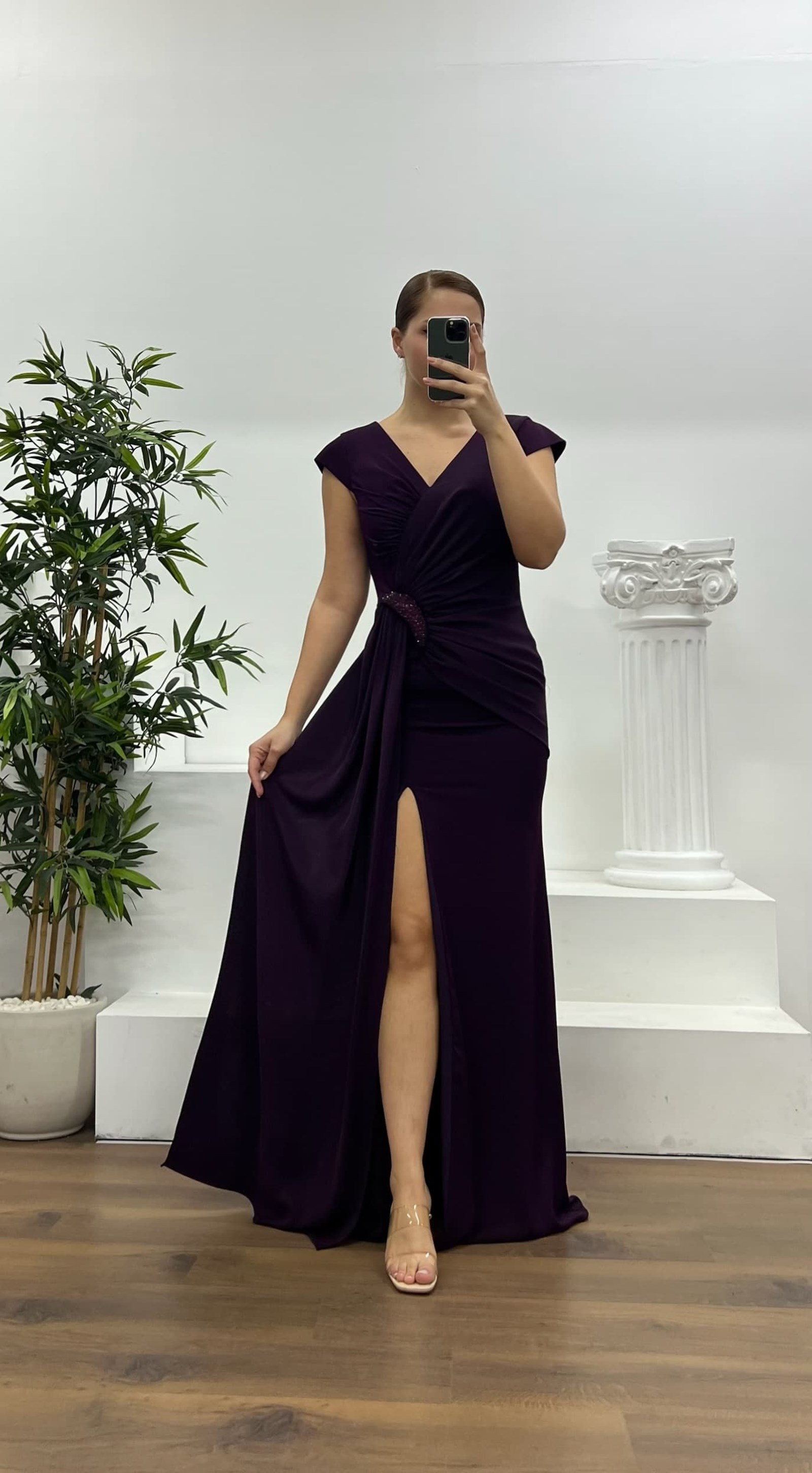 • Mor Bel Detay Büyük Beden Abiye Elbise