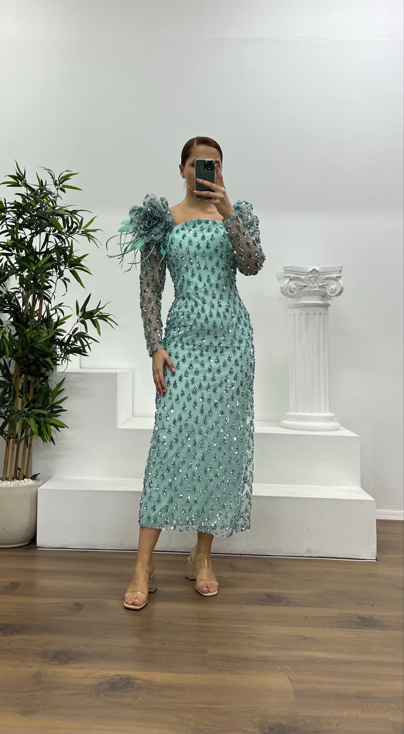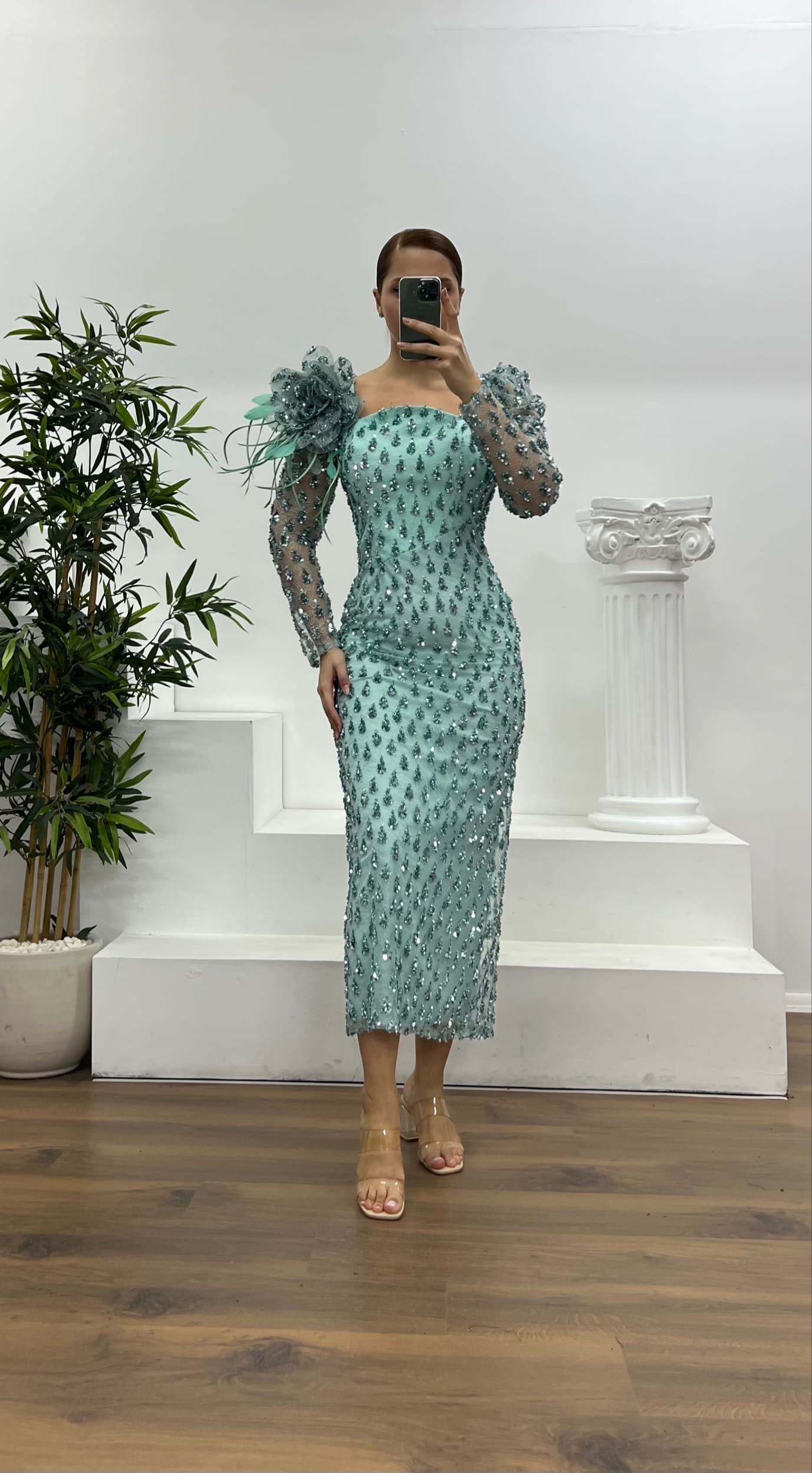فستان سهرة مطرز باللون النعناعي بمقاسات كبيرة