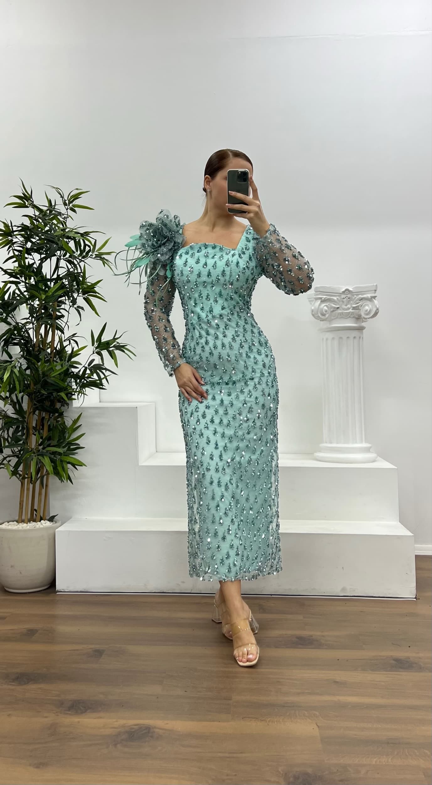 Mint İşlemeli Büyük Beden Abiye Elbise