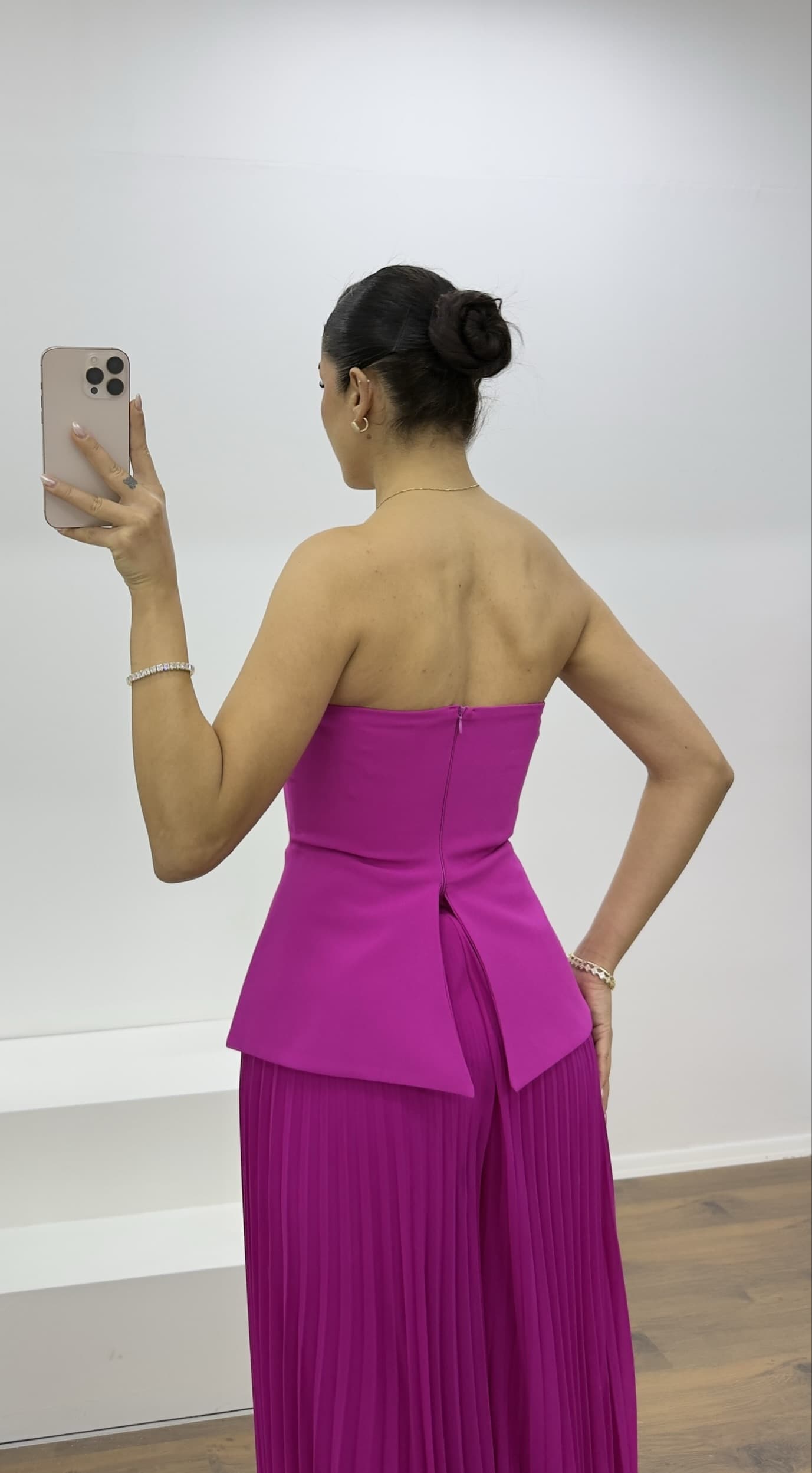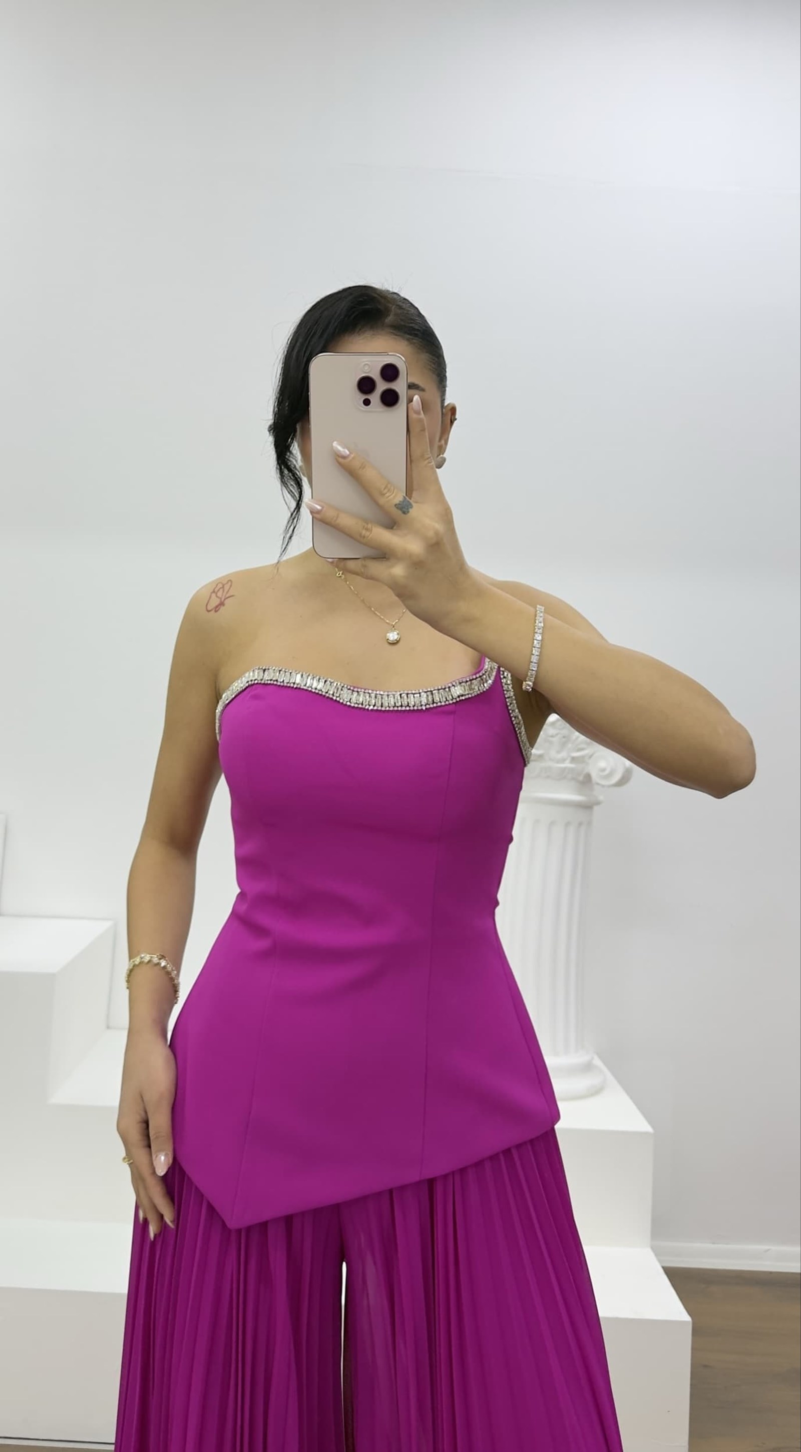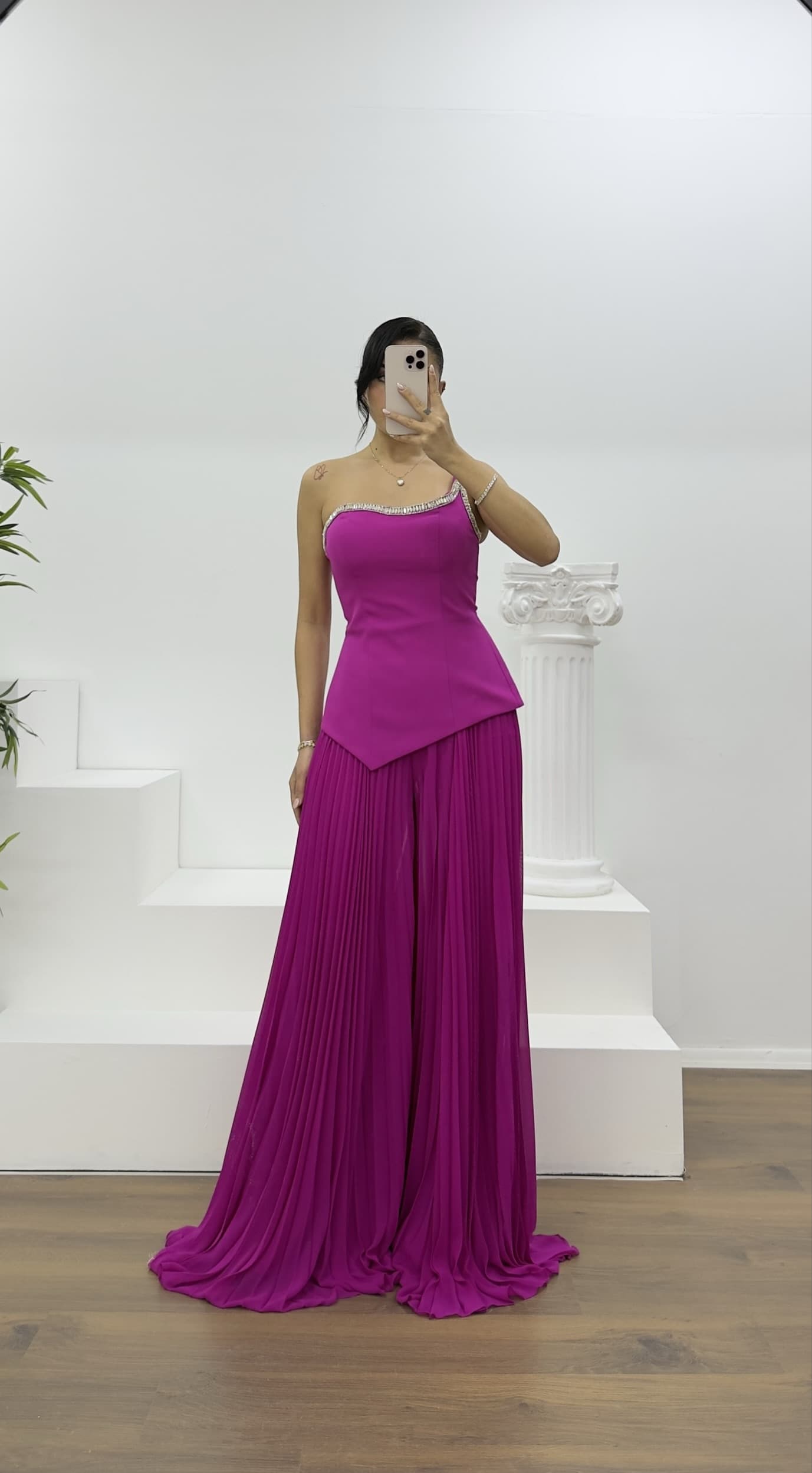 • Fuşya Taş İşlemeli Etek Kısmı Şifon Piliseli Abiye Tulum