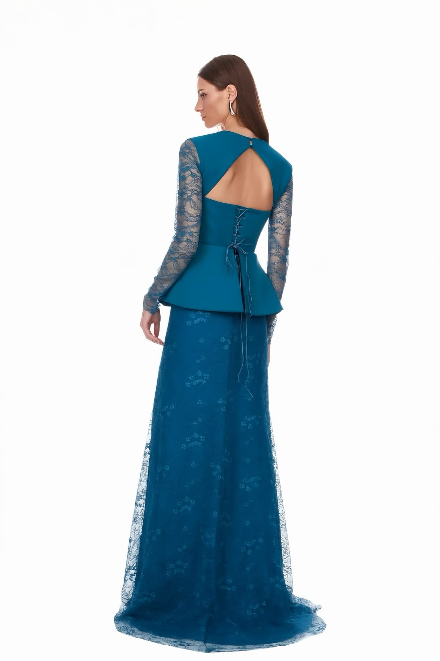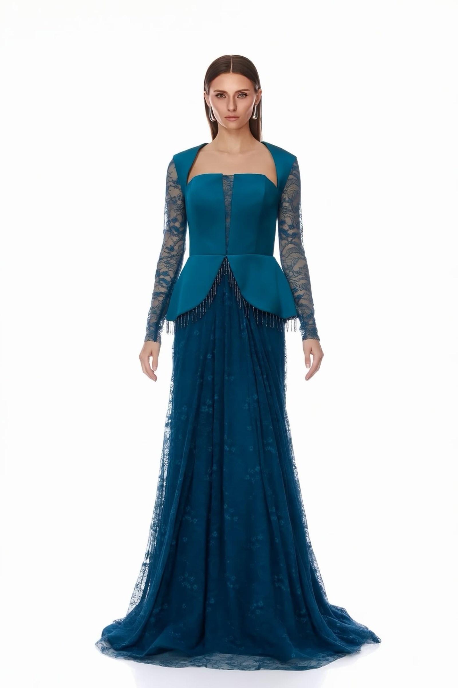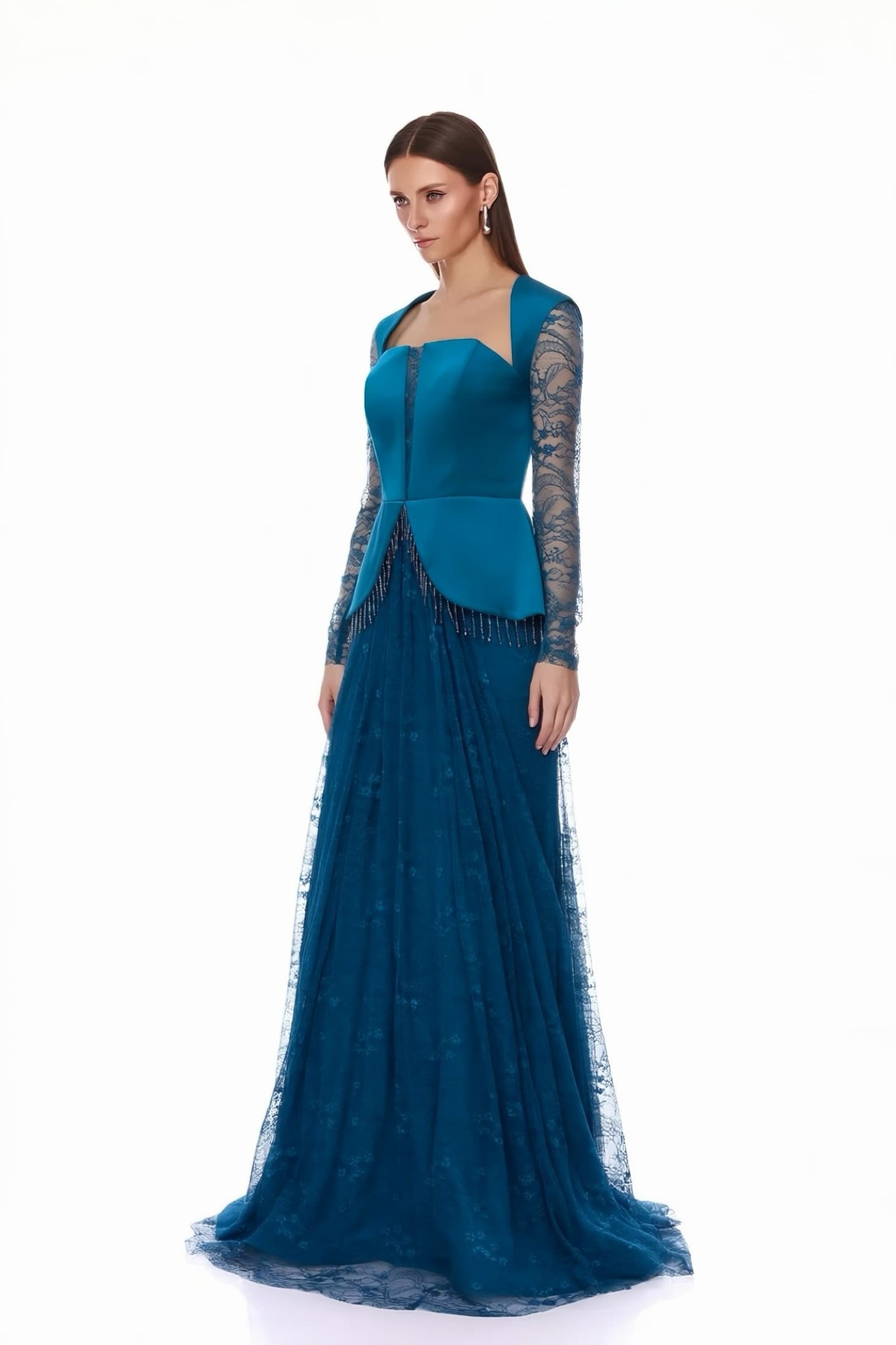 فستان سهرة من الساتان البترولي مع صدرية وتنورة من الدانتيل