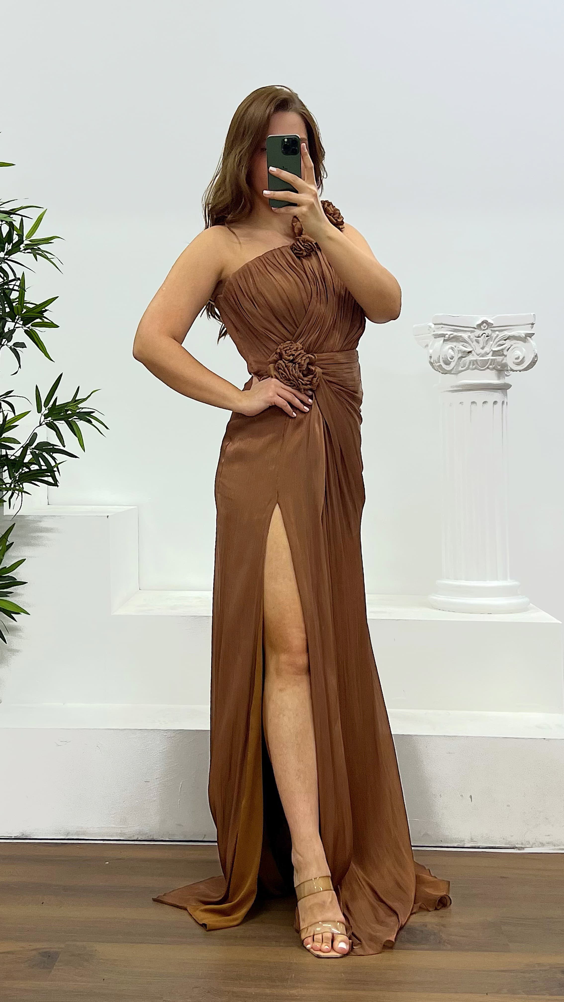 Abendkleid mit Blumenmuster und einem Schulterriemen Das Produkt ist für die Größen 44-48 geeignet, mit eingebauten Brustpolstern, gefüttert, Rückenschluss mit Reißverschluss, mit Schlitz und floralen Details. Die Länge des Produkts kann zwischen 170-175 cm variieren. Stoffart: Chiffon 66%, Viskose 34%, Polyester.