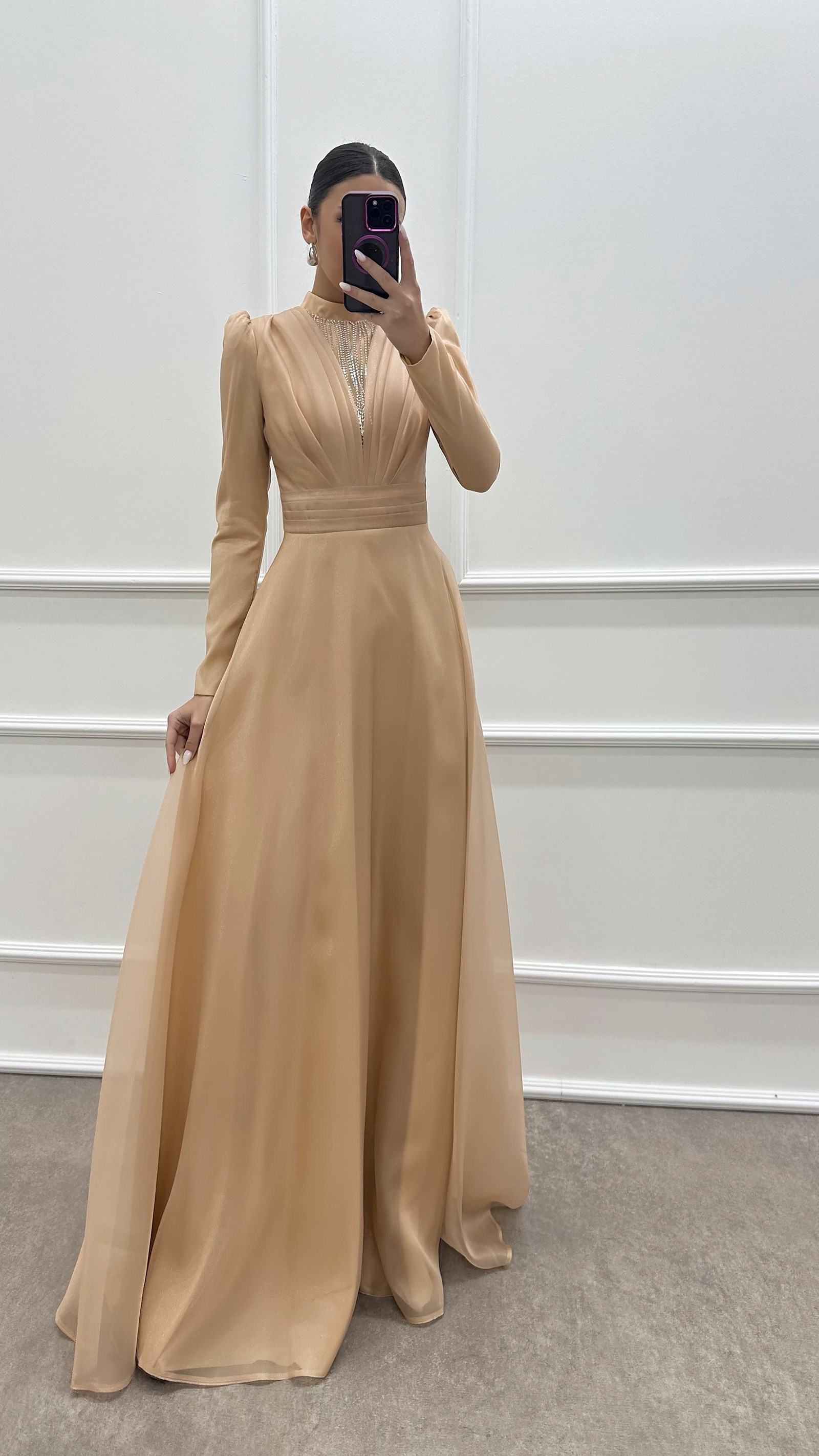 Beigefarbenes Kleid im Hijab-Design mit Plissee-Quastendetail auf der Brust