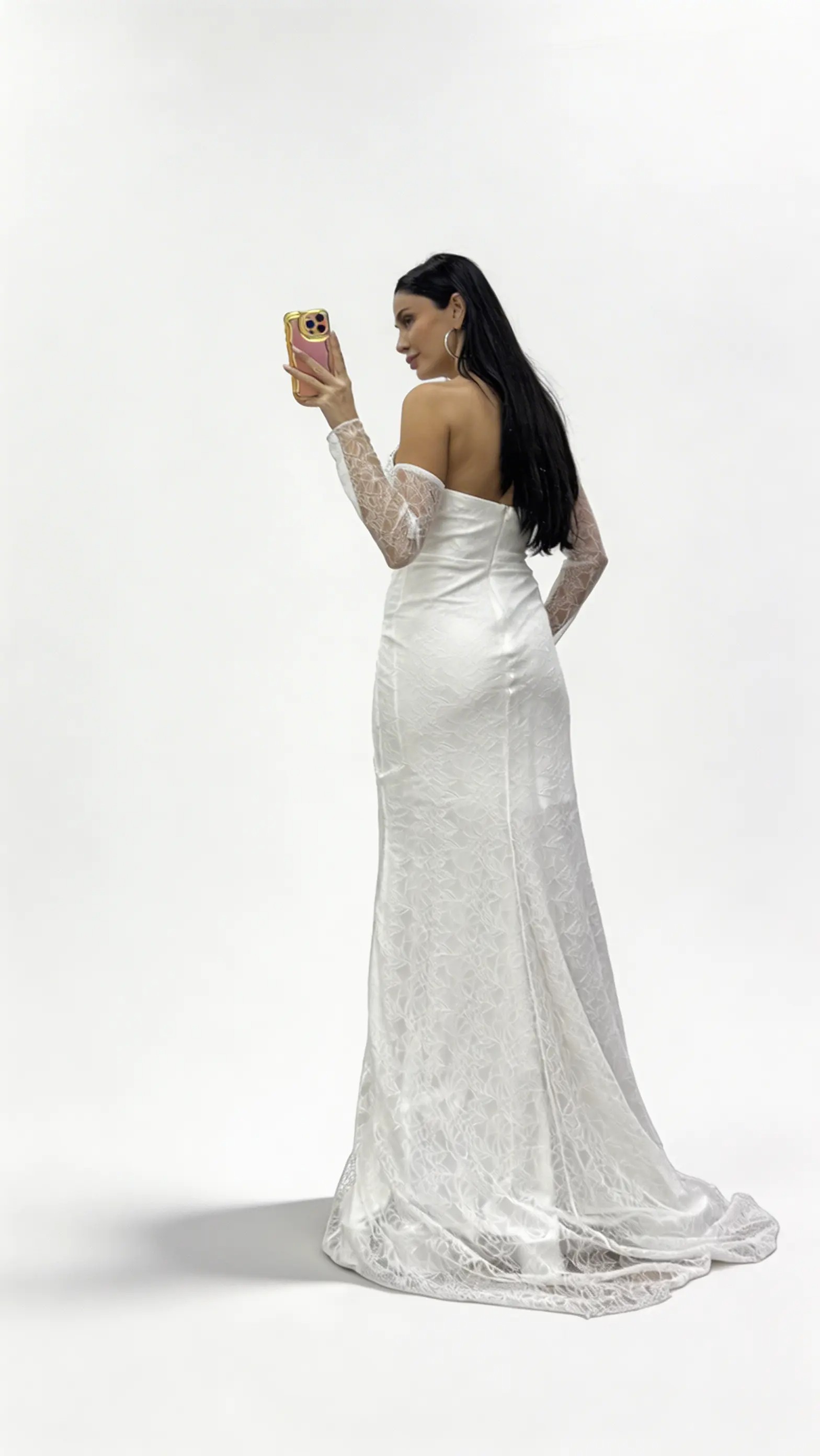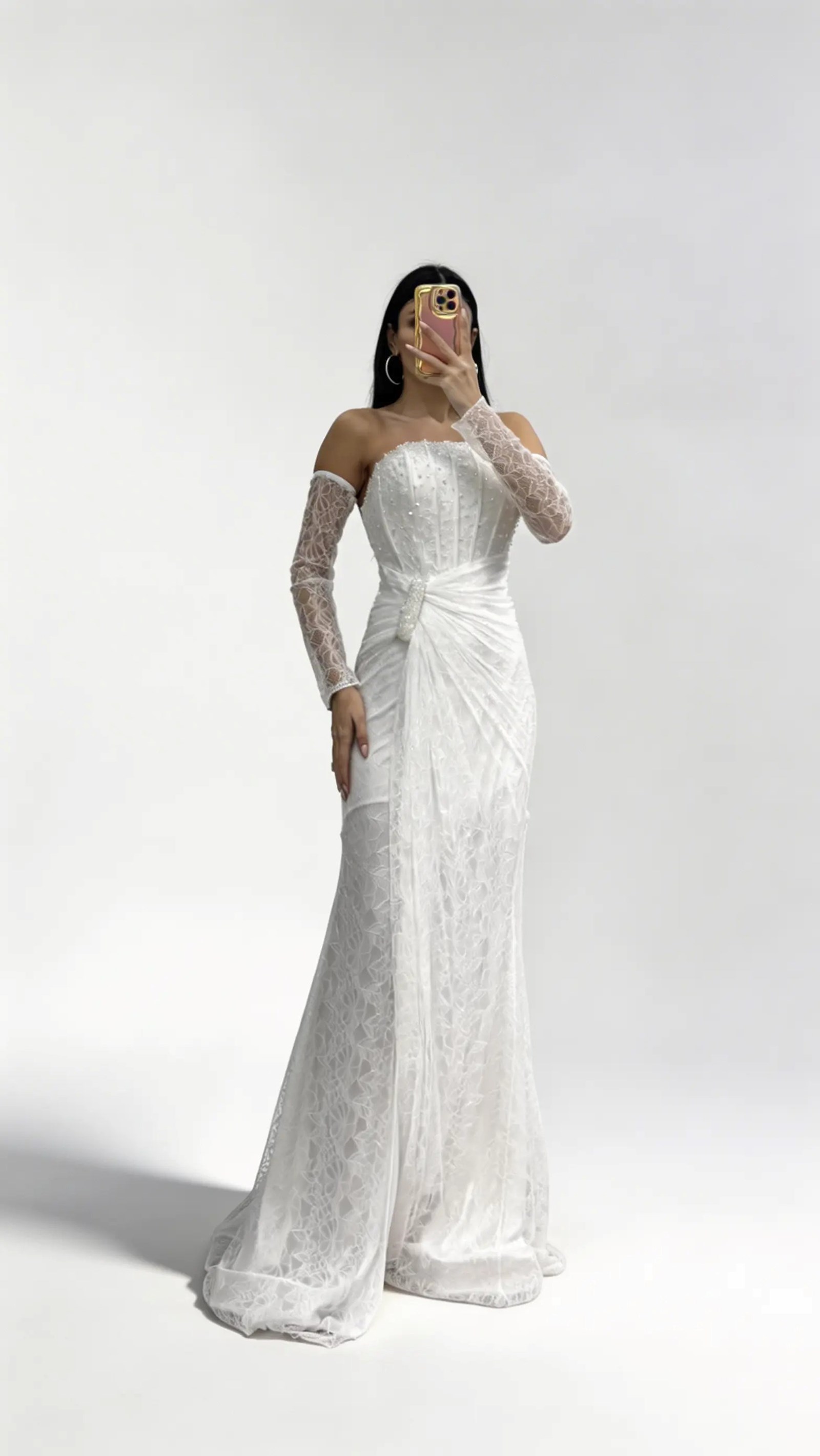• Beyaz Straplez  Taş Tokalı Dantel Abiye Elbise