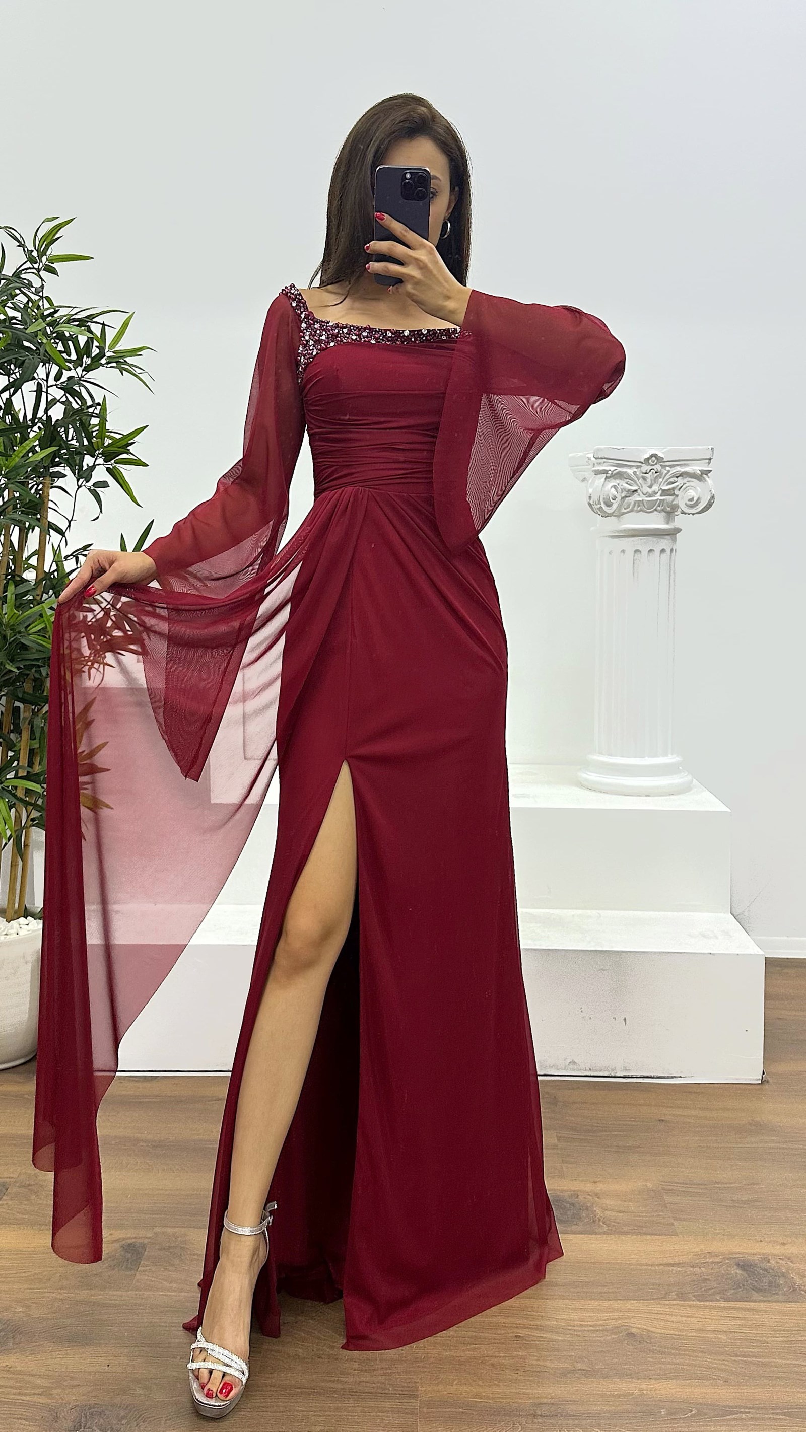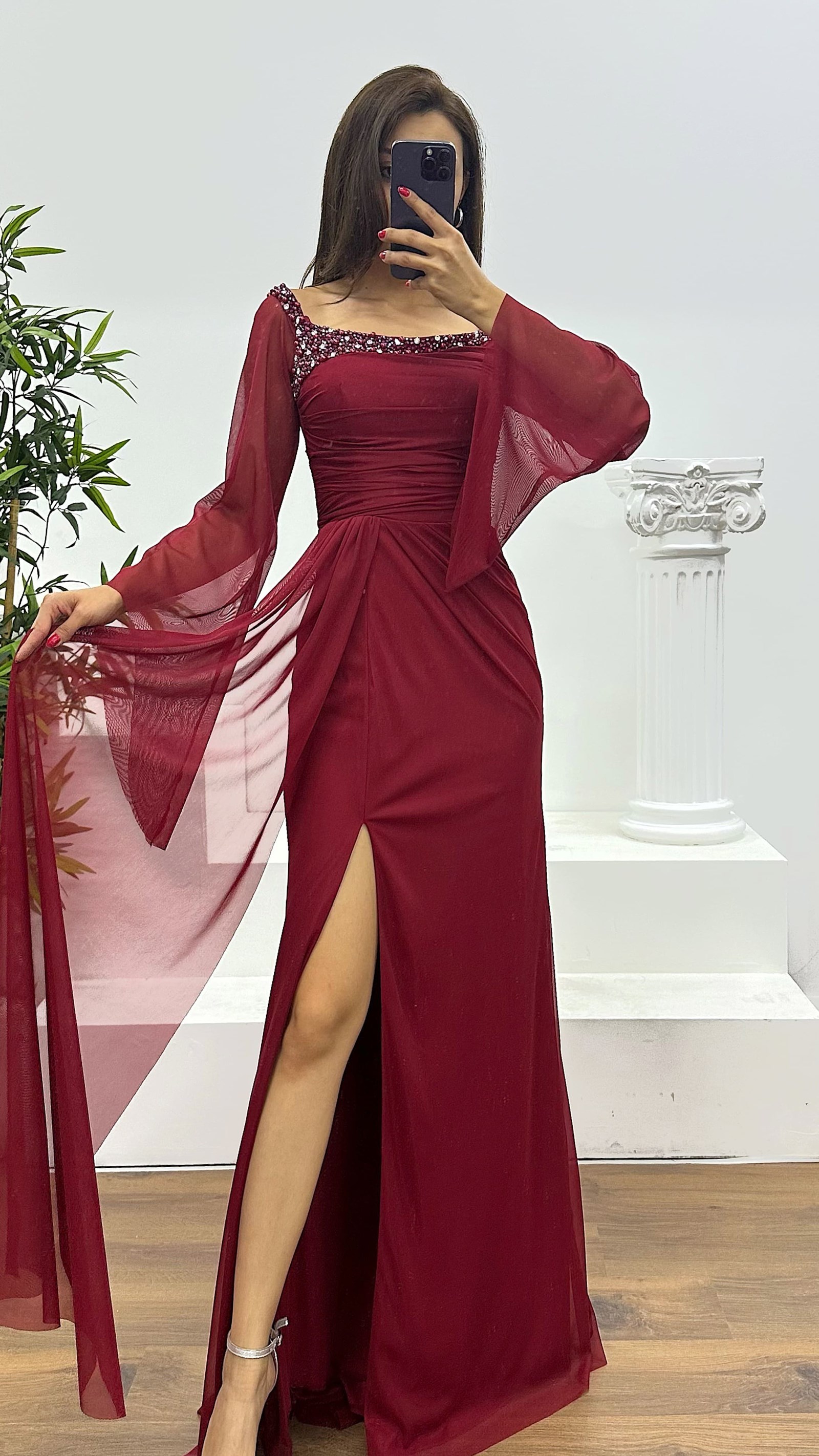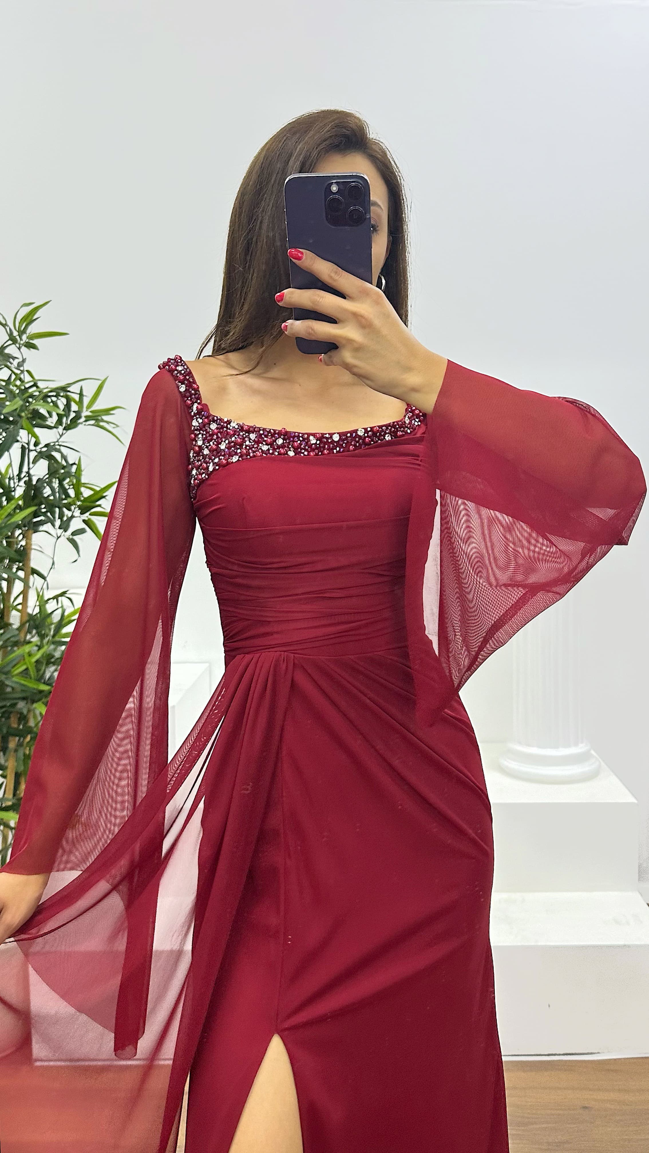 Besticktes Abendkleid mit U-Boot-Ausschnitt Das Produkt passt zu den Größen 36-42, ist mit gepolsterten Brust, gefüttert, hat einen Reißverschluss hinten, Schlitz und ist als besticktes Abendkleid gestaltet. Produktlänge: kann zwischen 170 und 175 cm variieren. Stoffart: Tüll 3 % Lycra 97 % Polyester