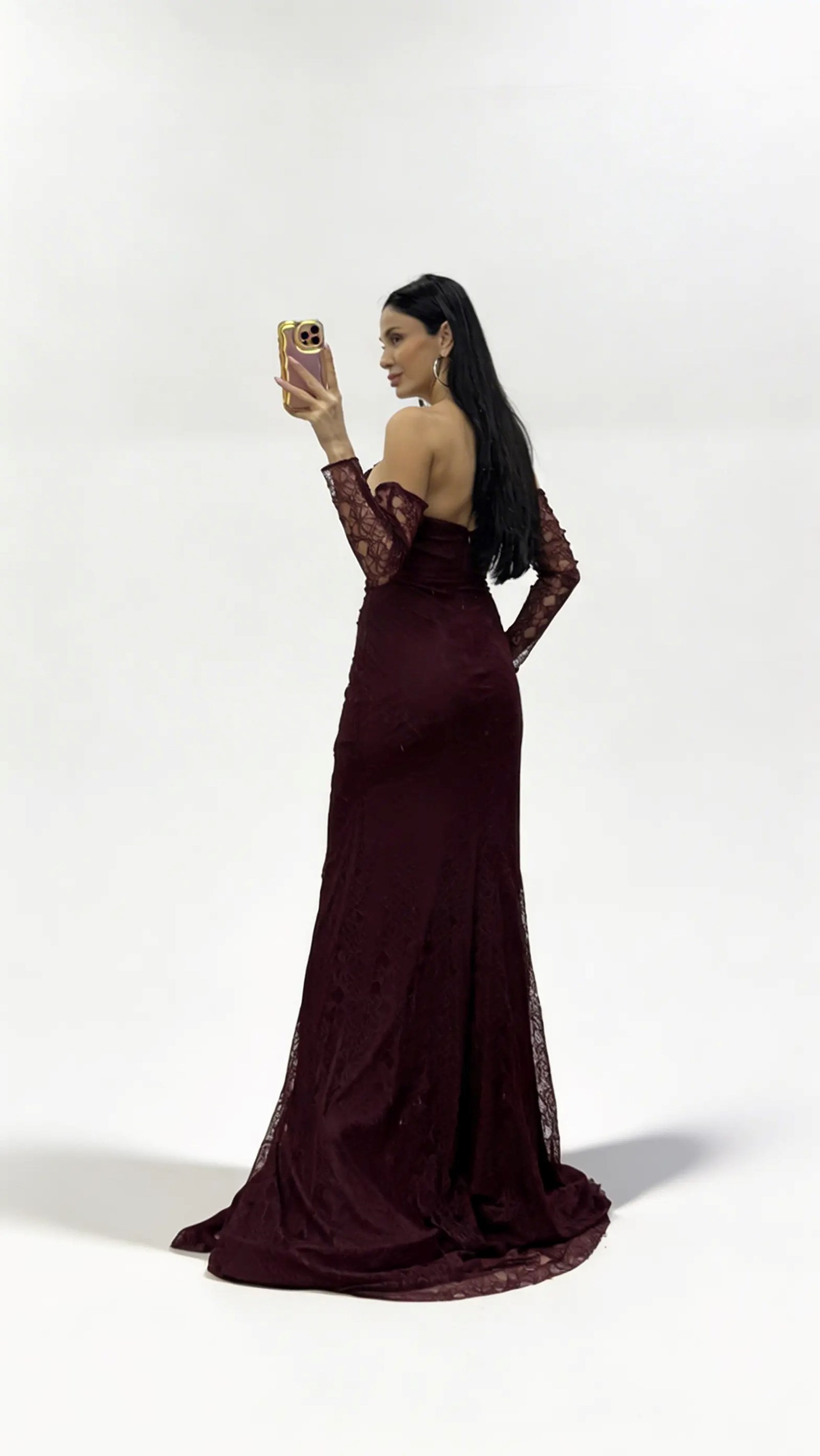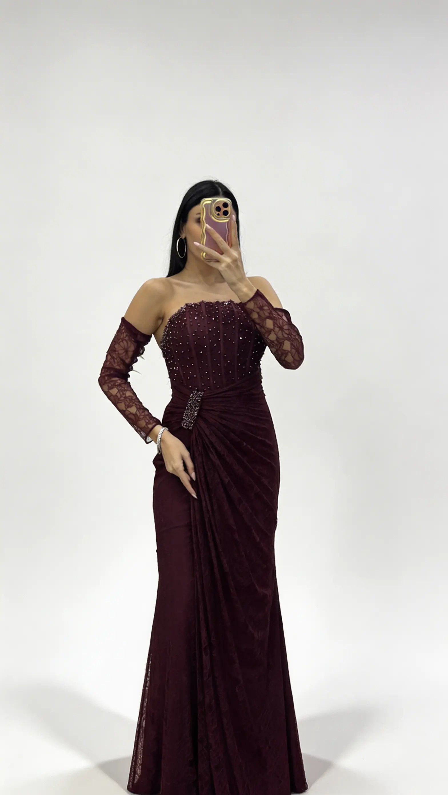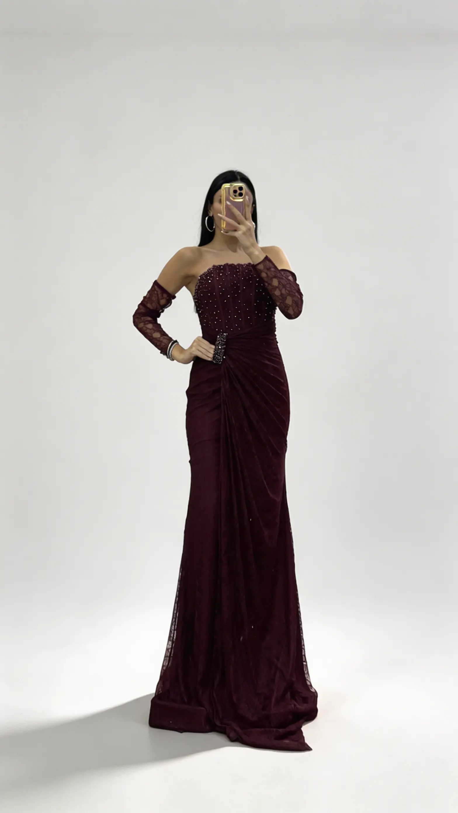 Burgunderfarbenes  trägerloses Abendkleid aus Spitze mit Steinschnalle