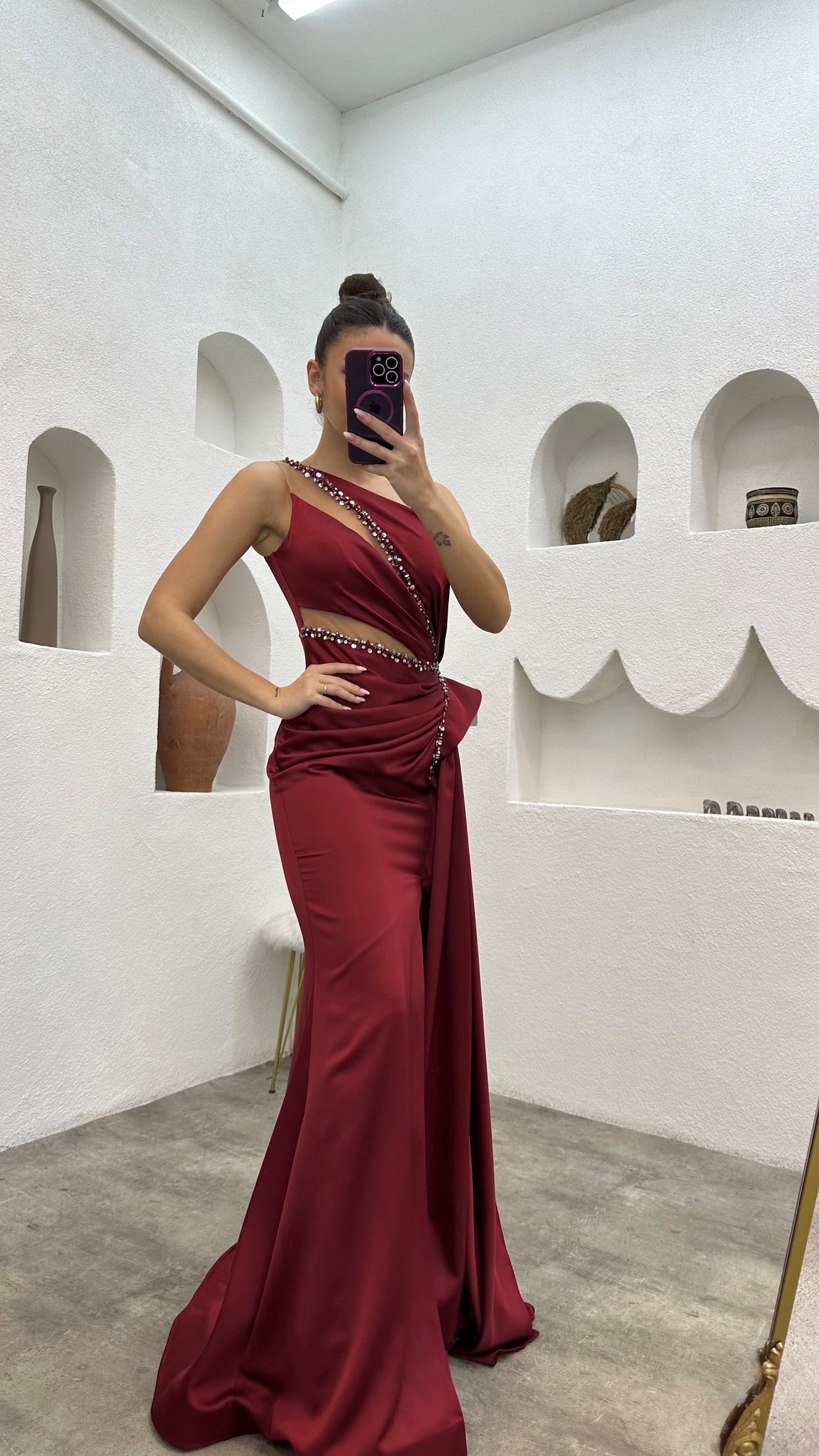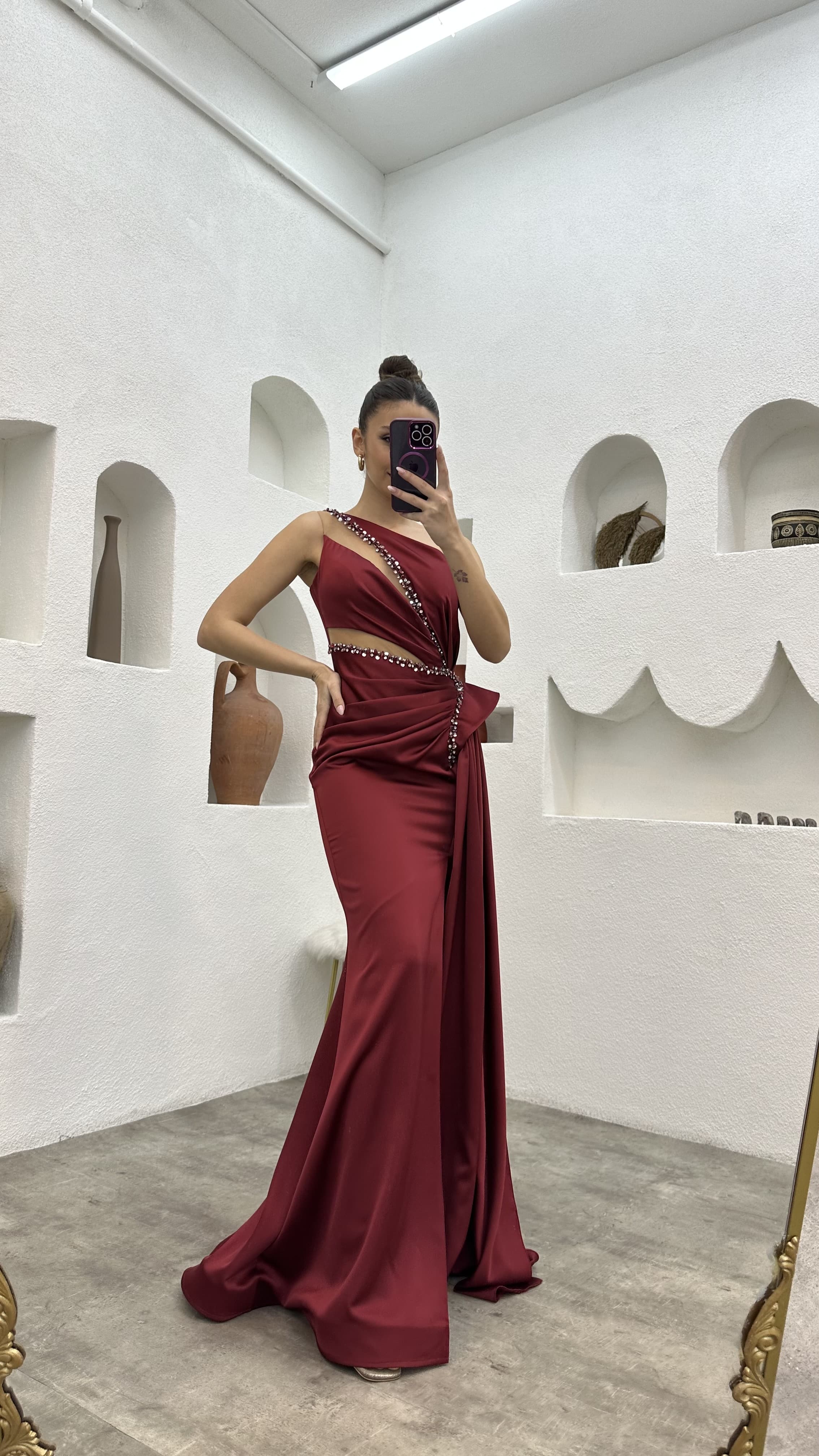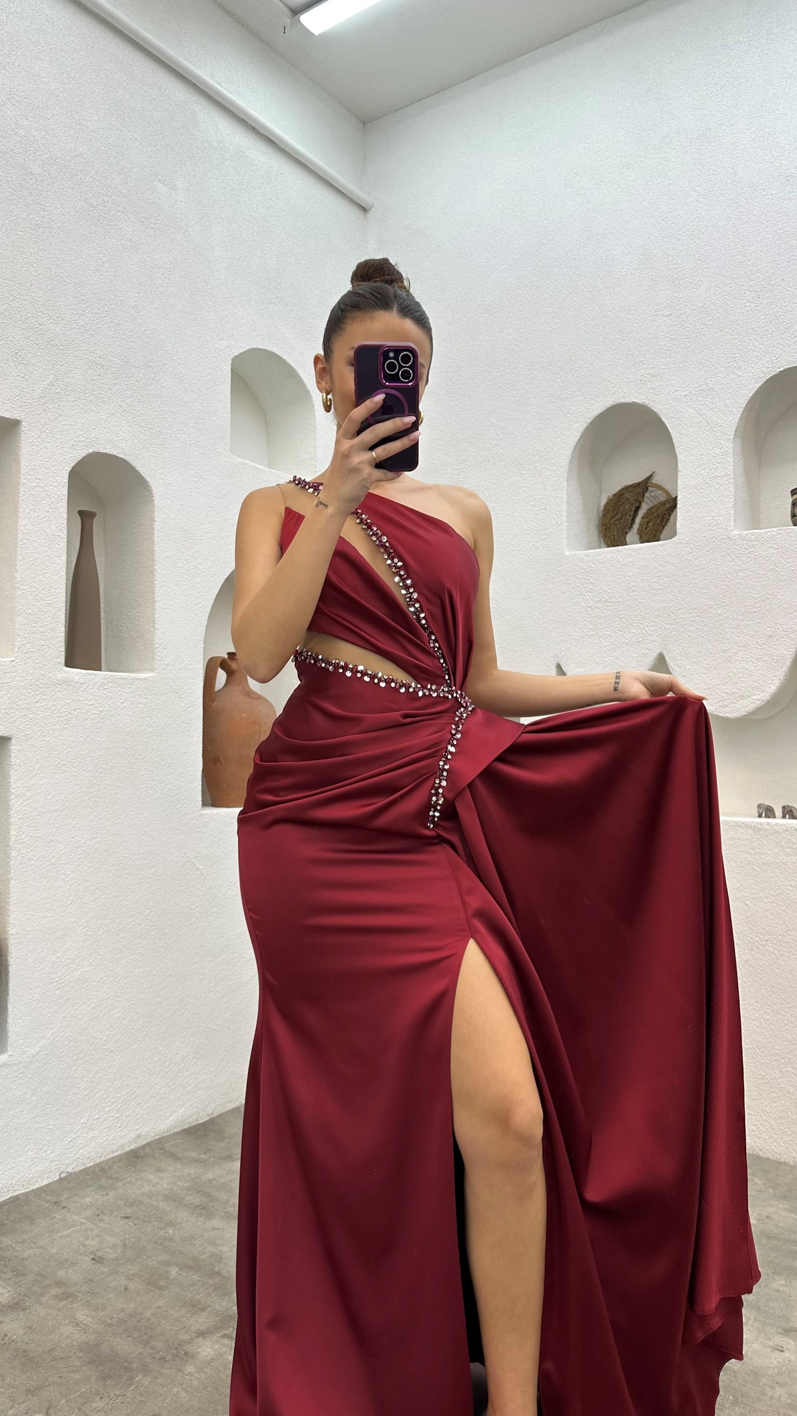• Bordo Tek Omuz İşlemeli Saten Abiye Elbise