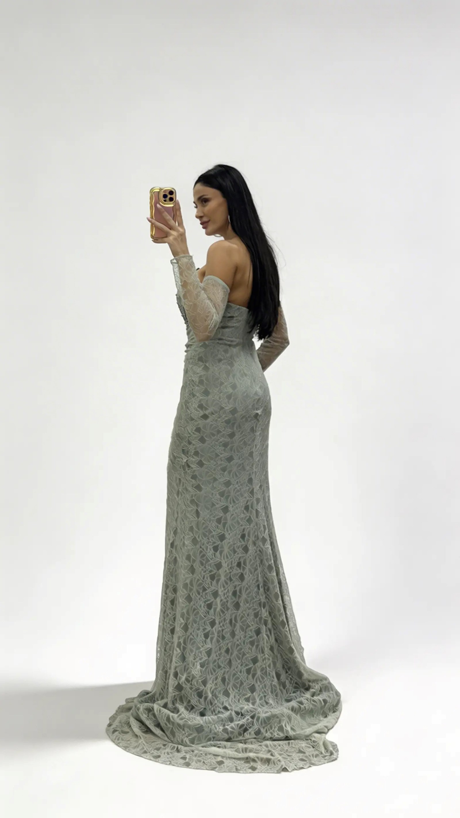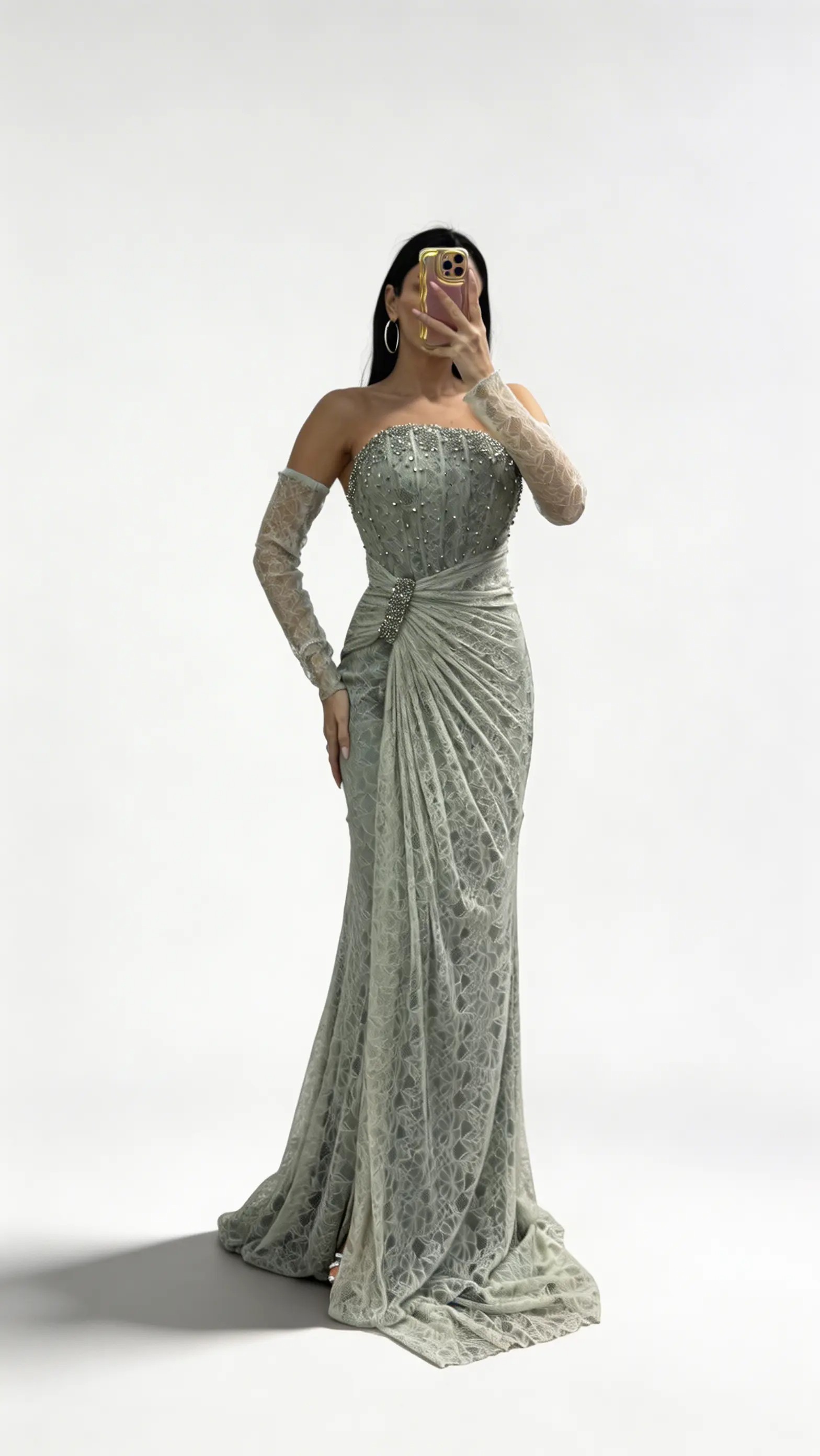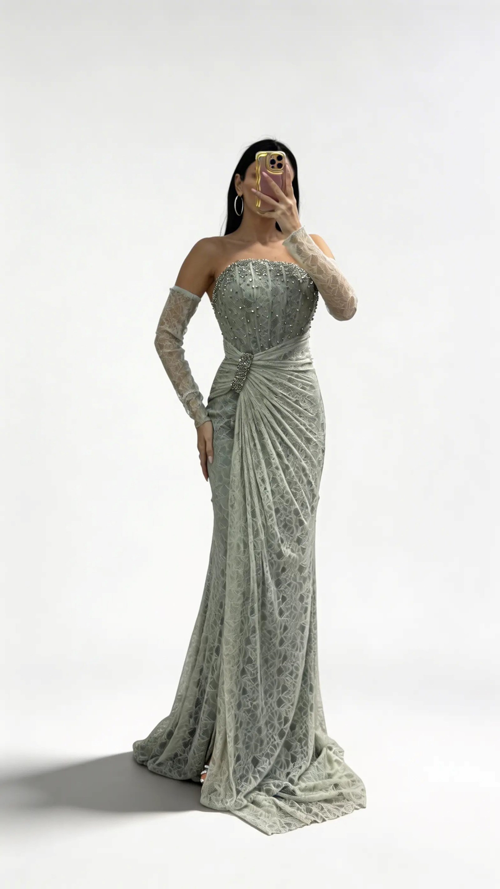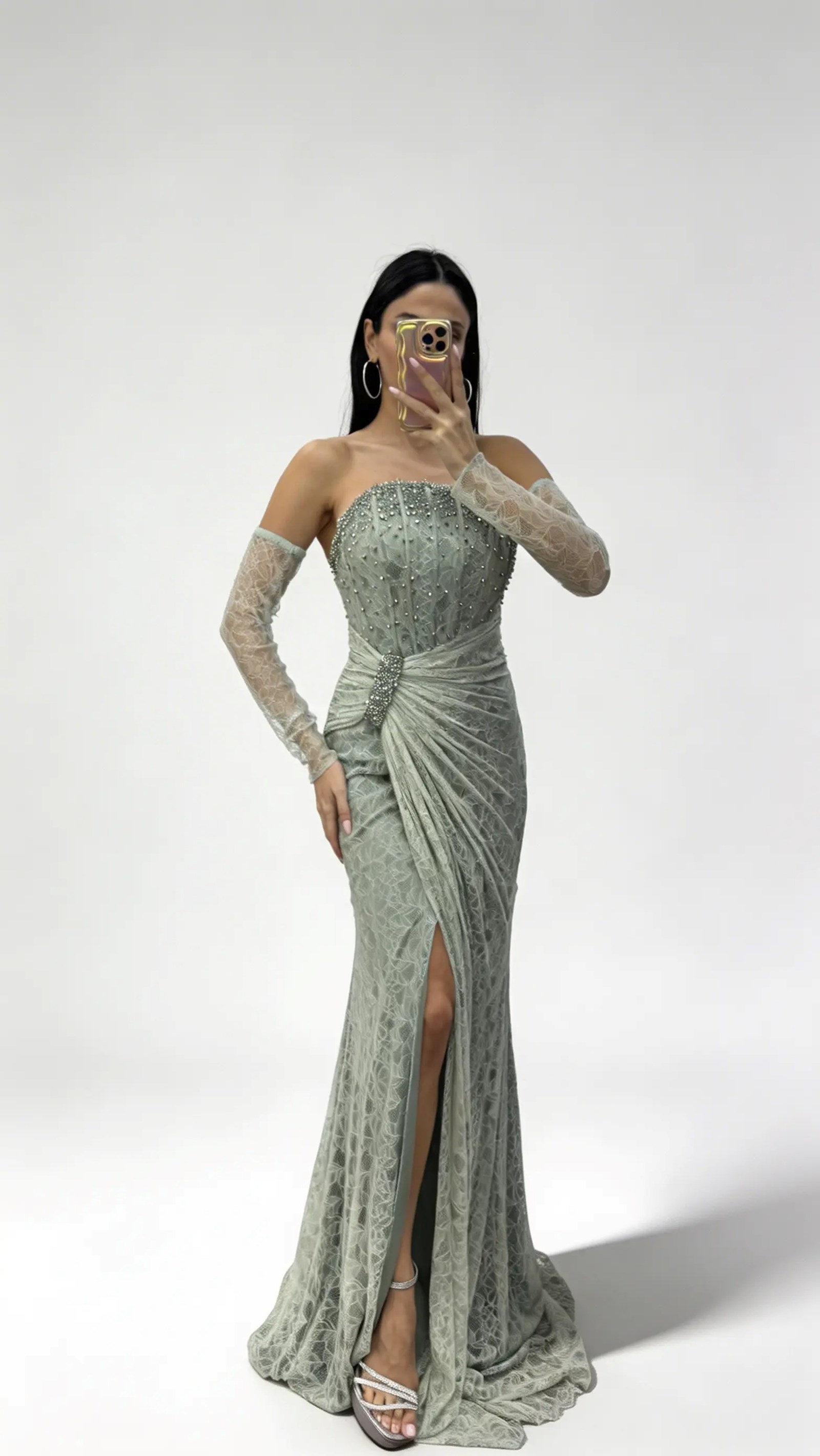 • Olive Straplez  Taş Tokalı Dantel Abiye Elbise