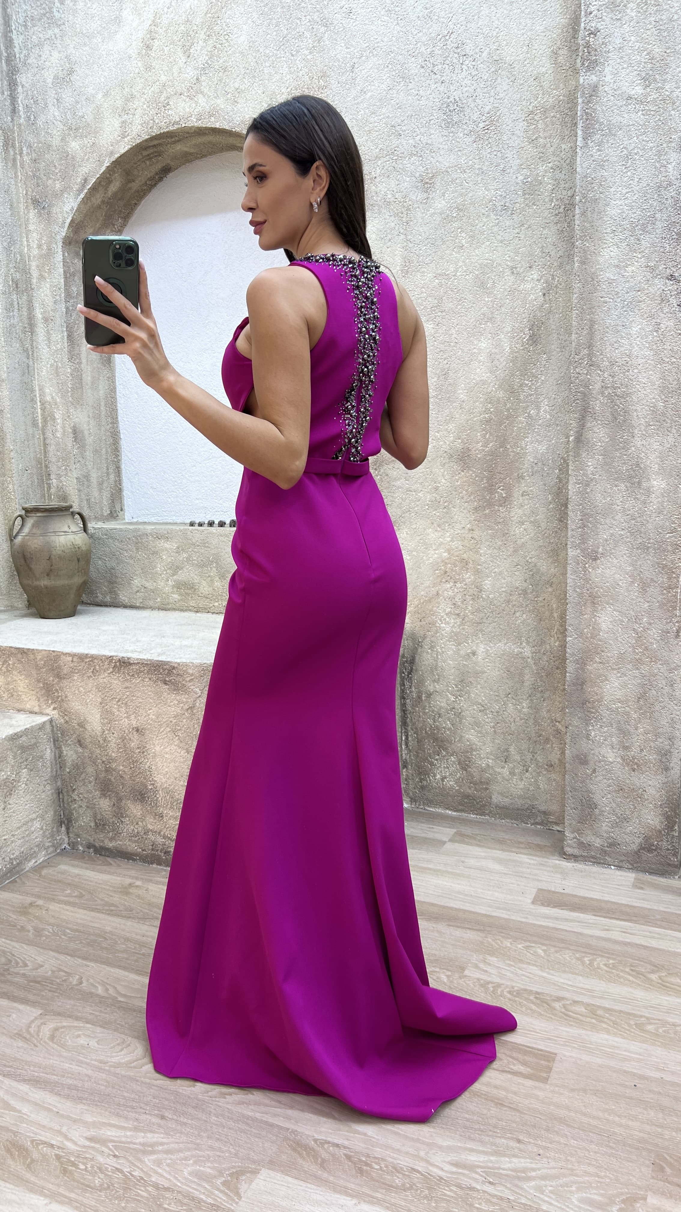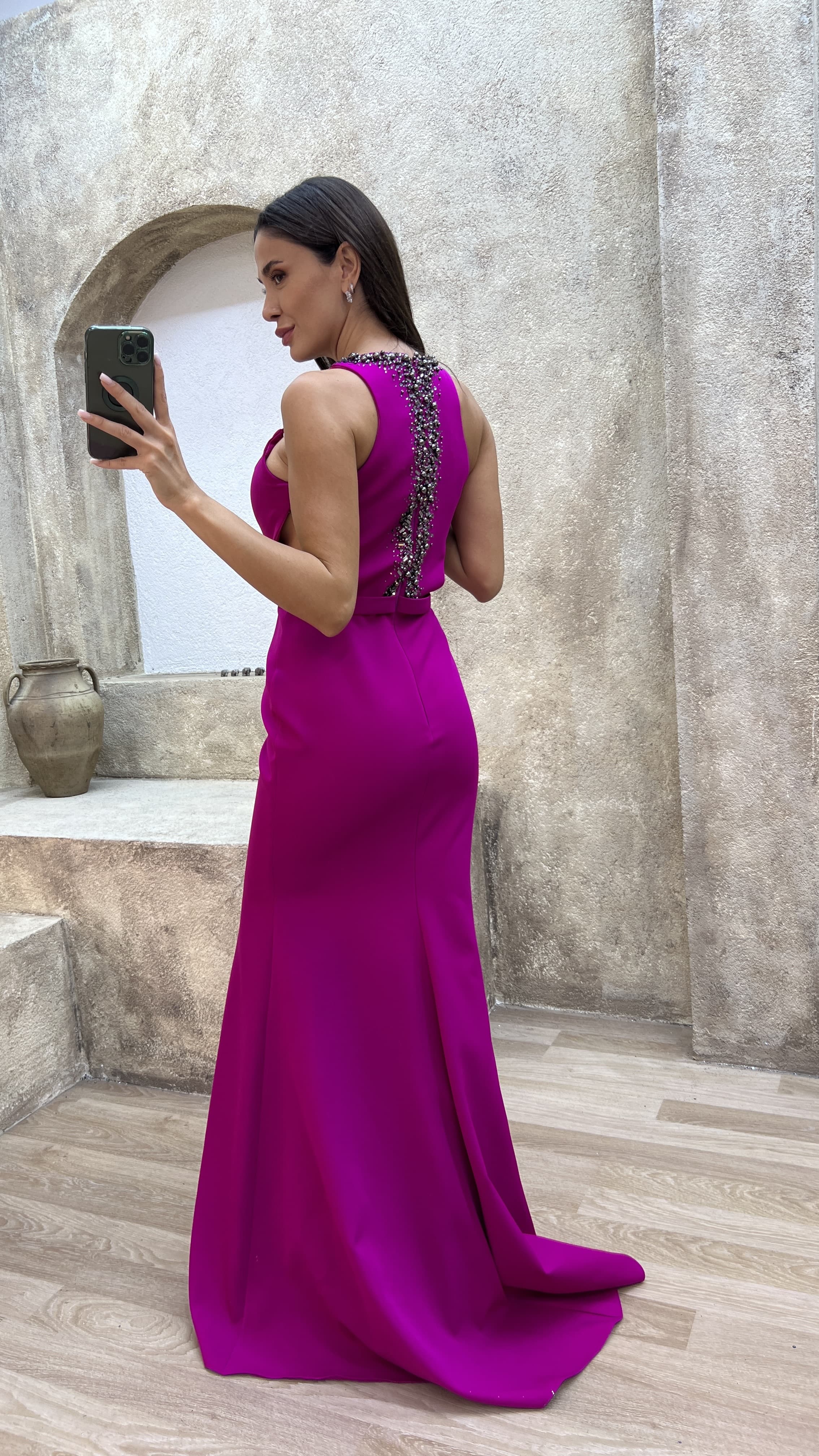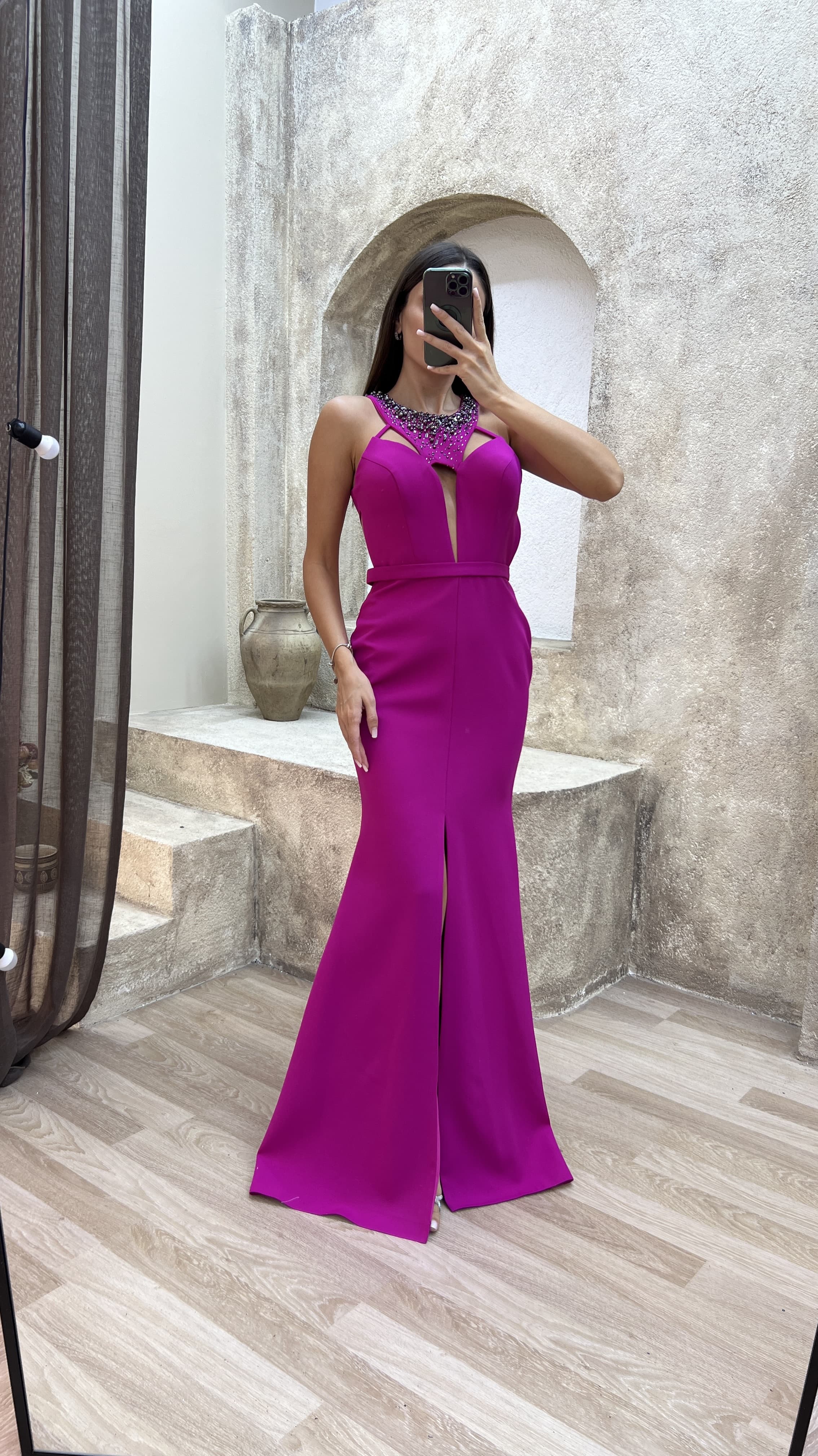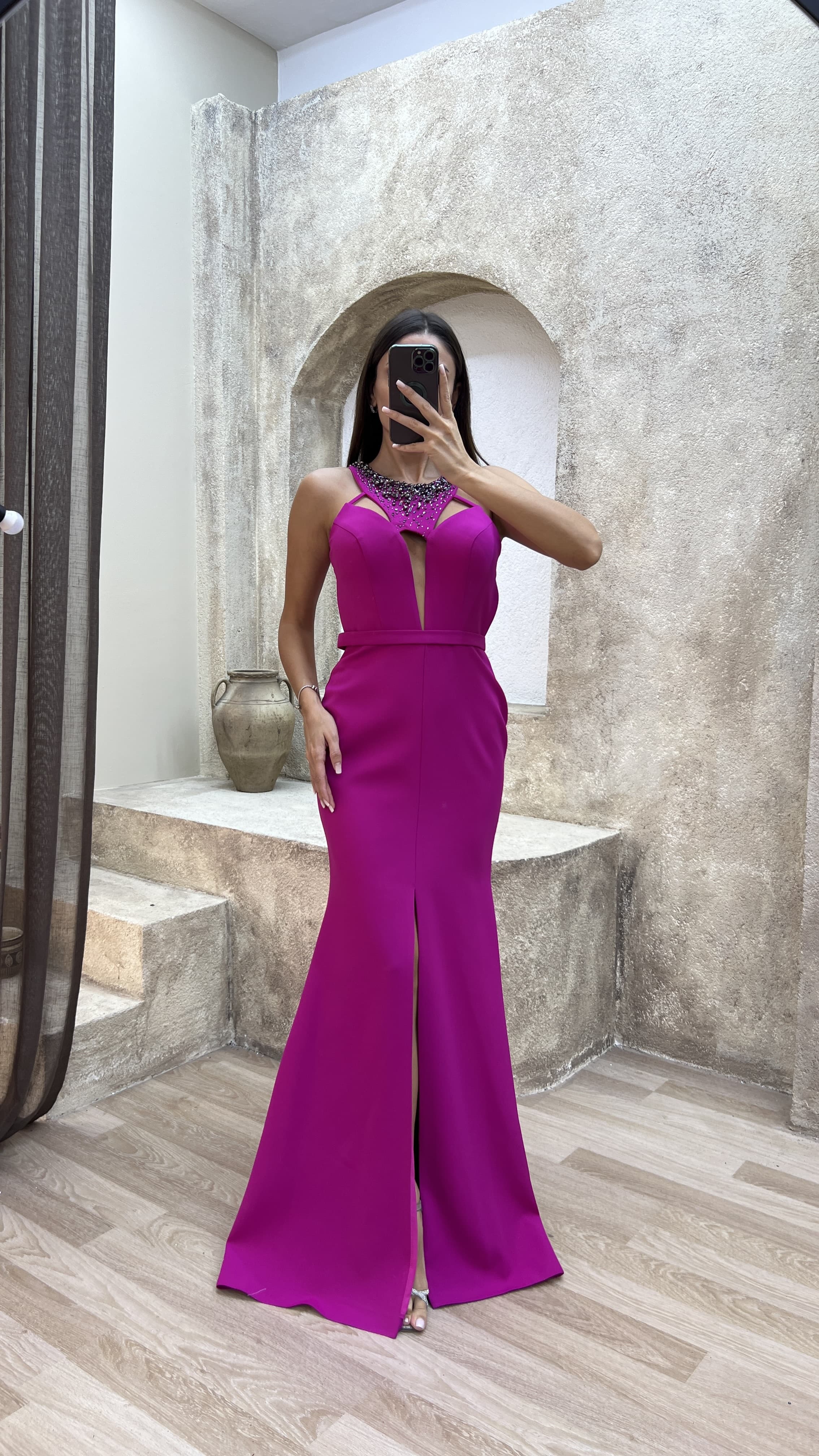 Fuşya Boyun Detay İşlemeli Tasarım Abiye Elbise