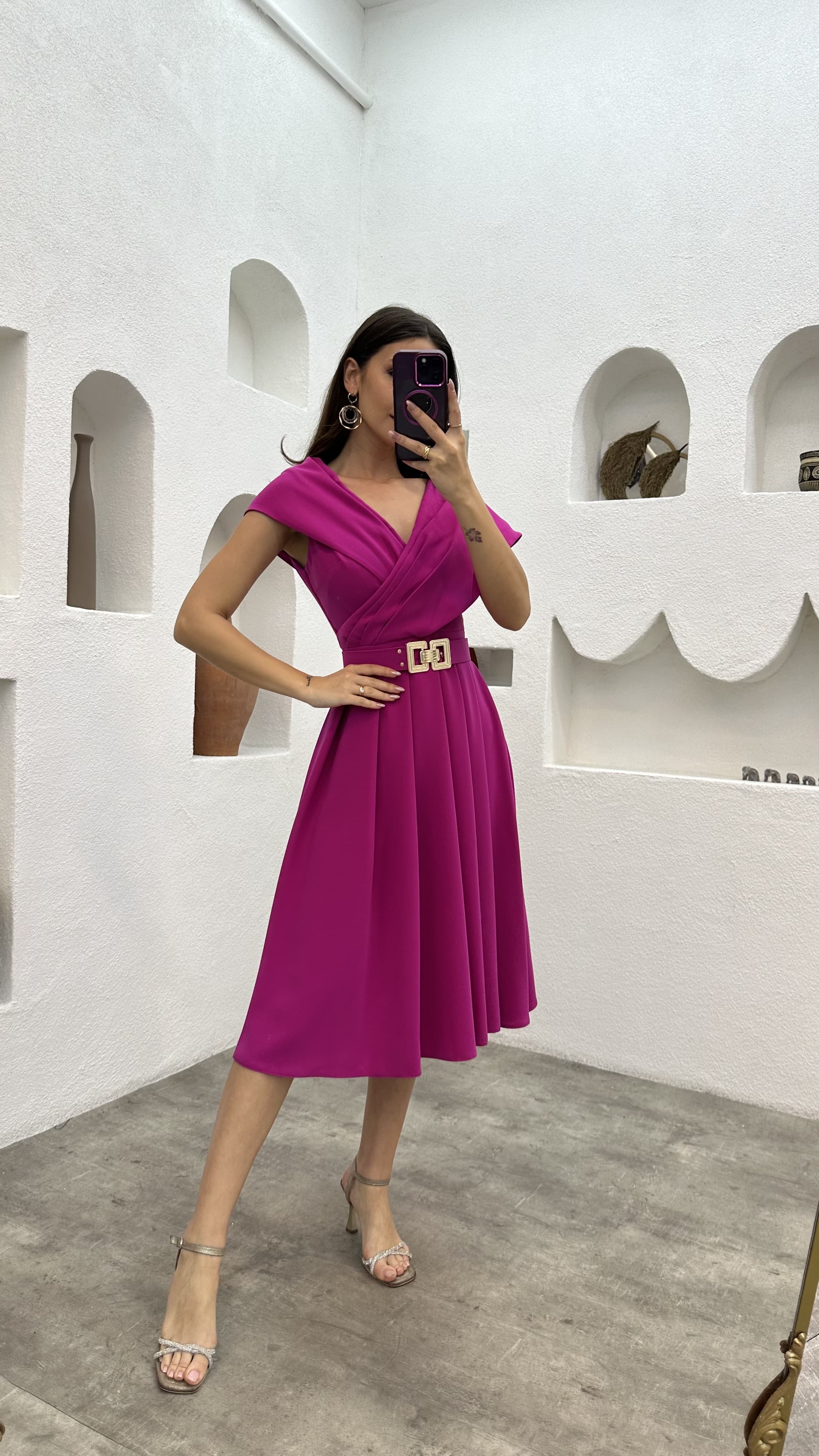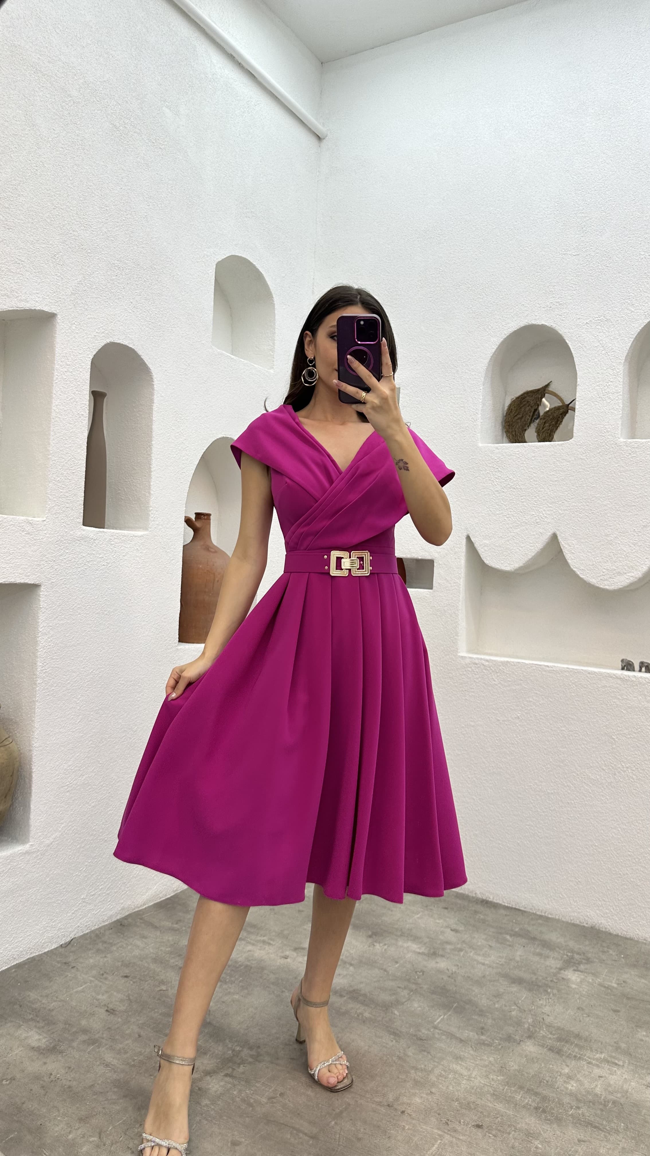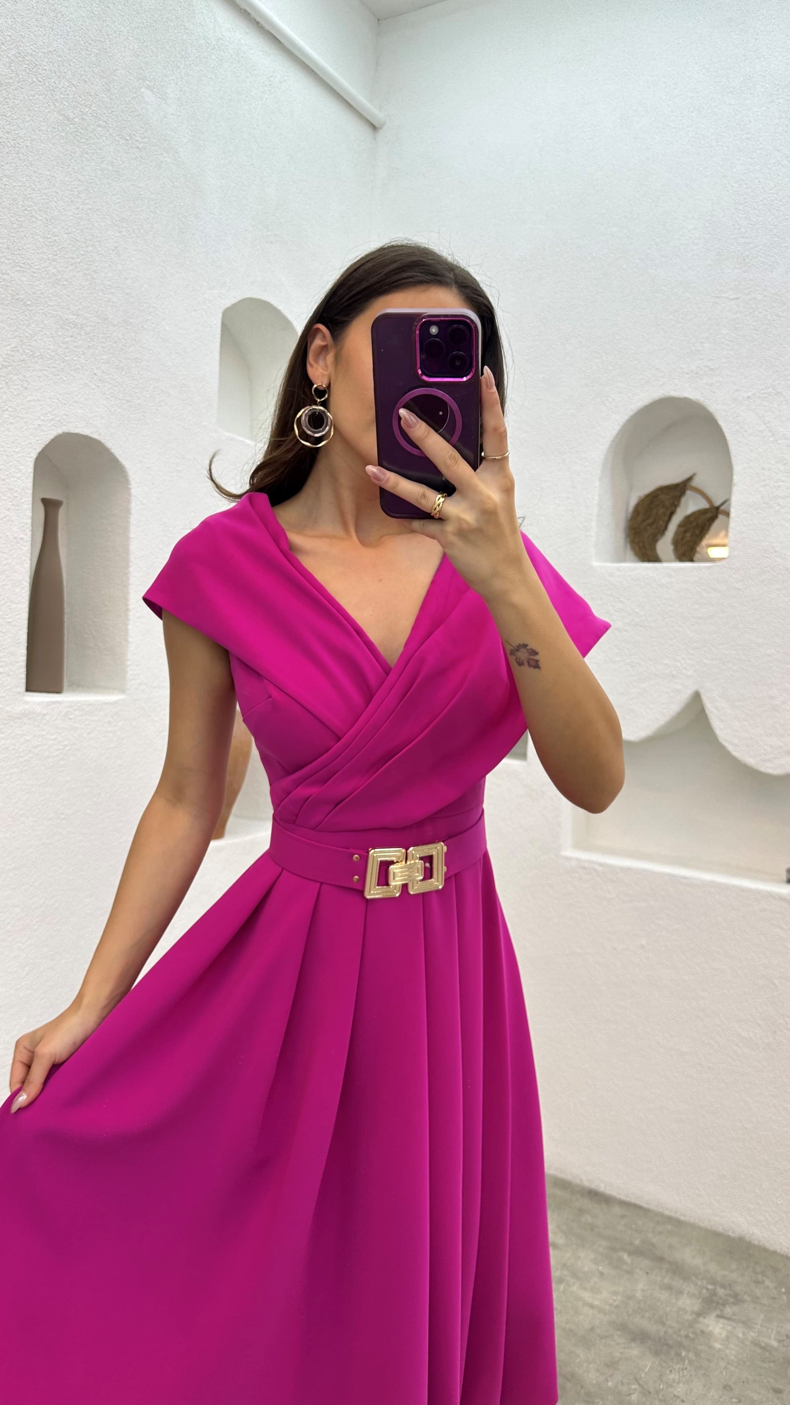 Fuşya Kruvaze Yaka Piliseli Kemerli Abiye Elbise