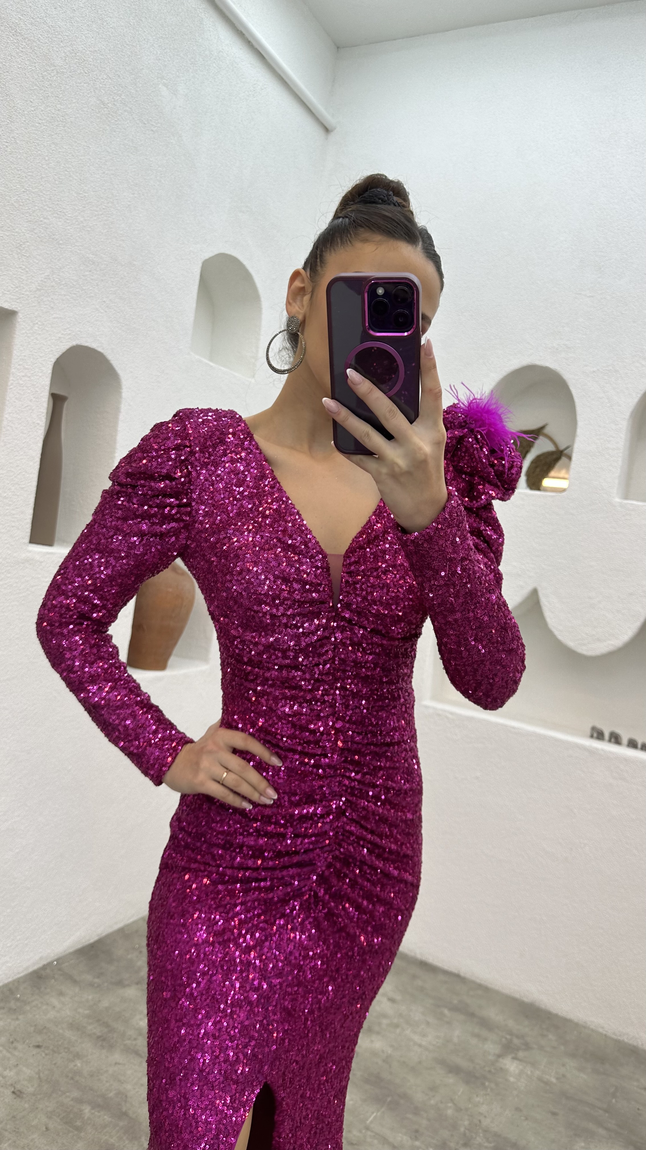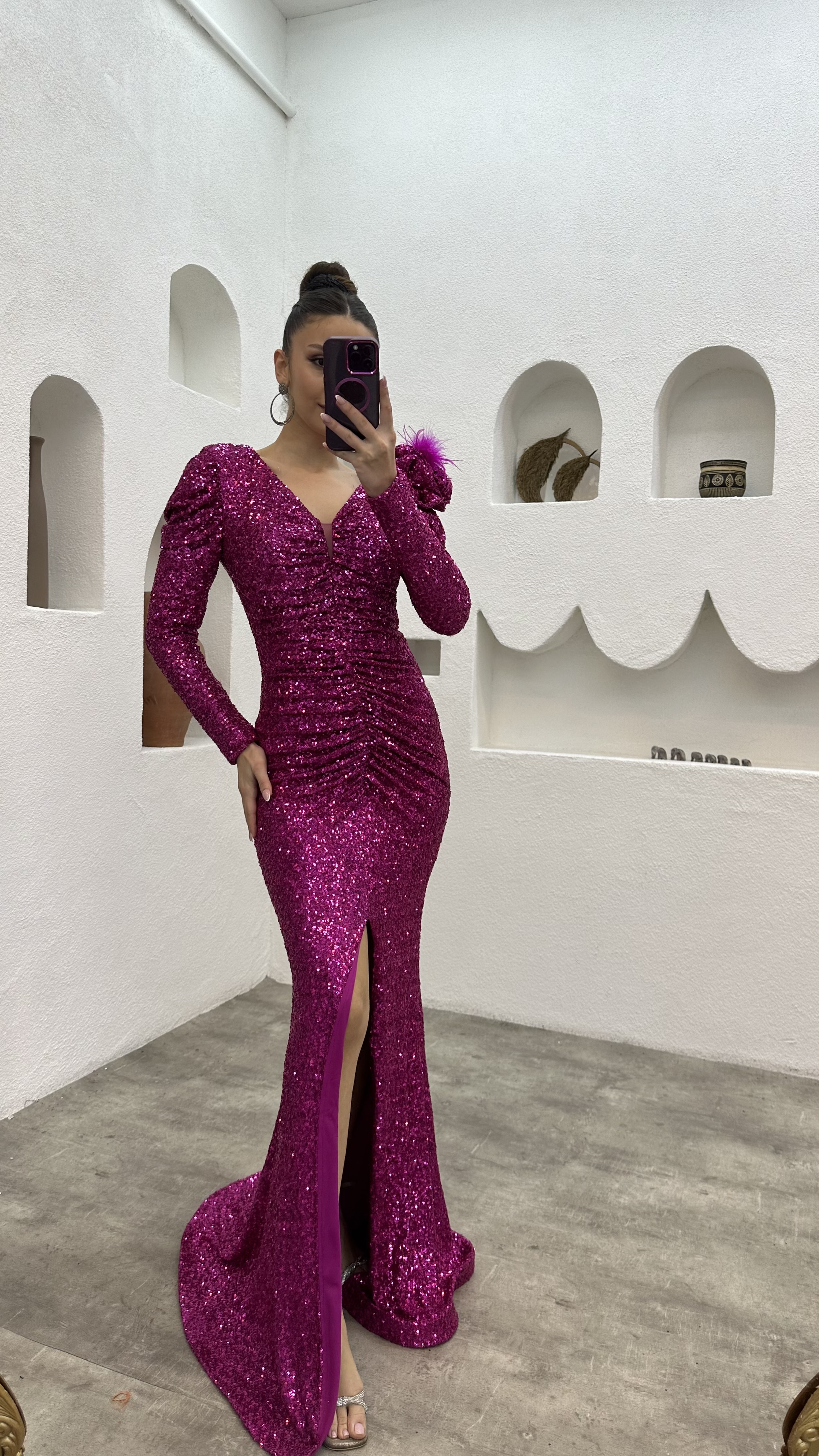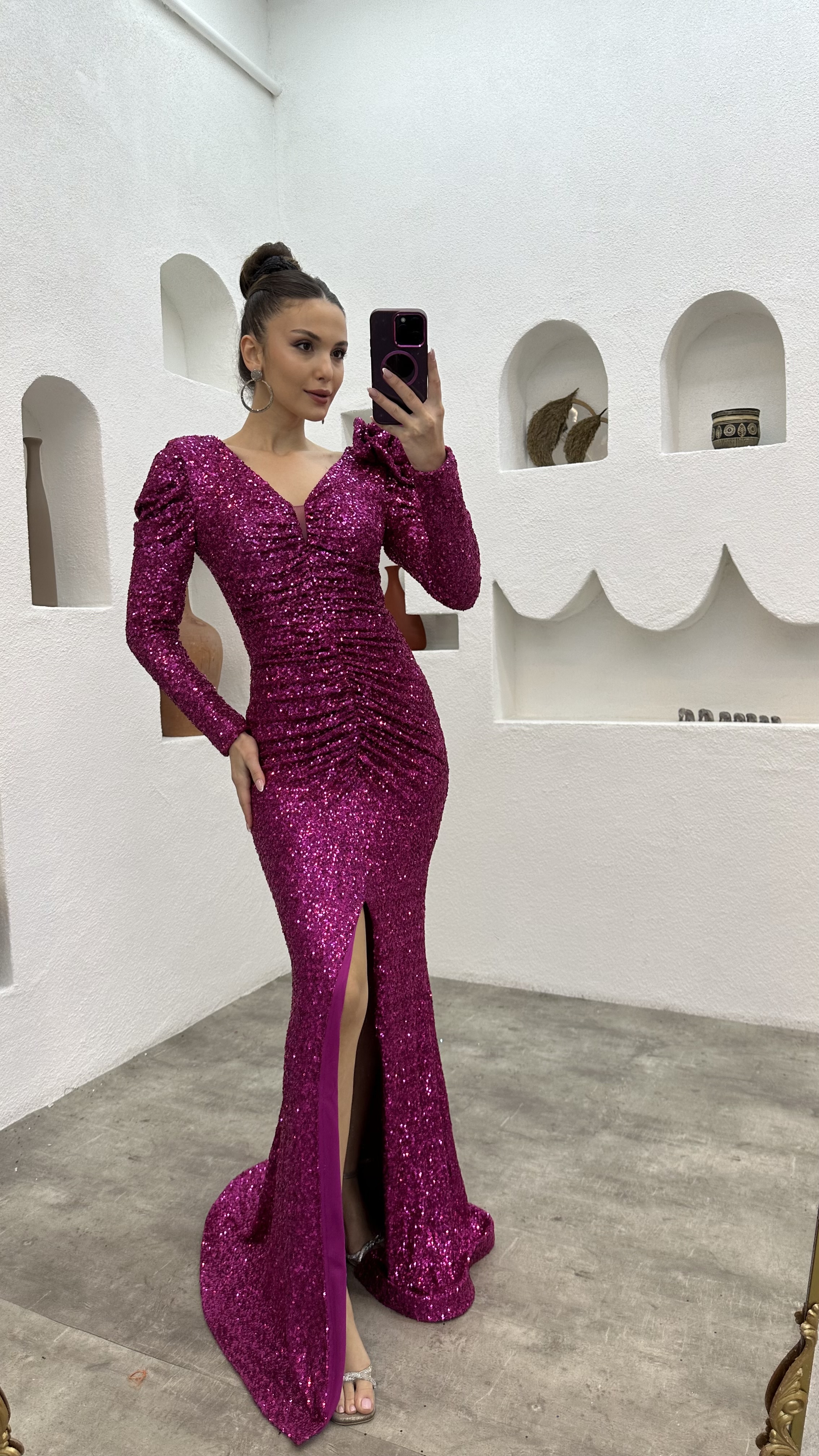 • Fuşya Pul Payet Yırtmaçlı Abiye Elbise