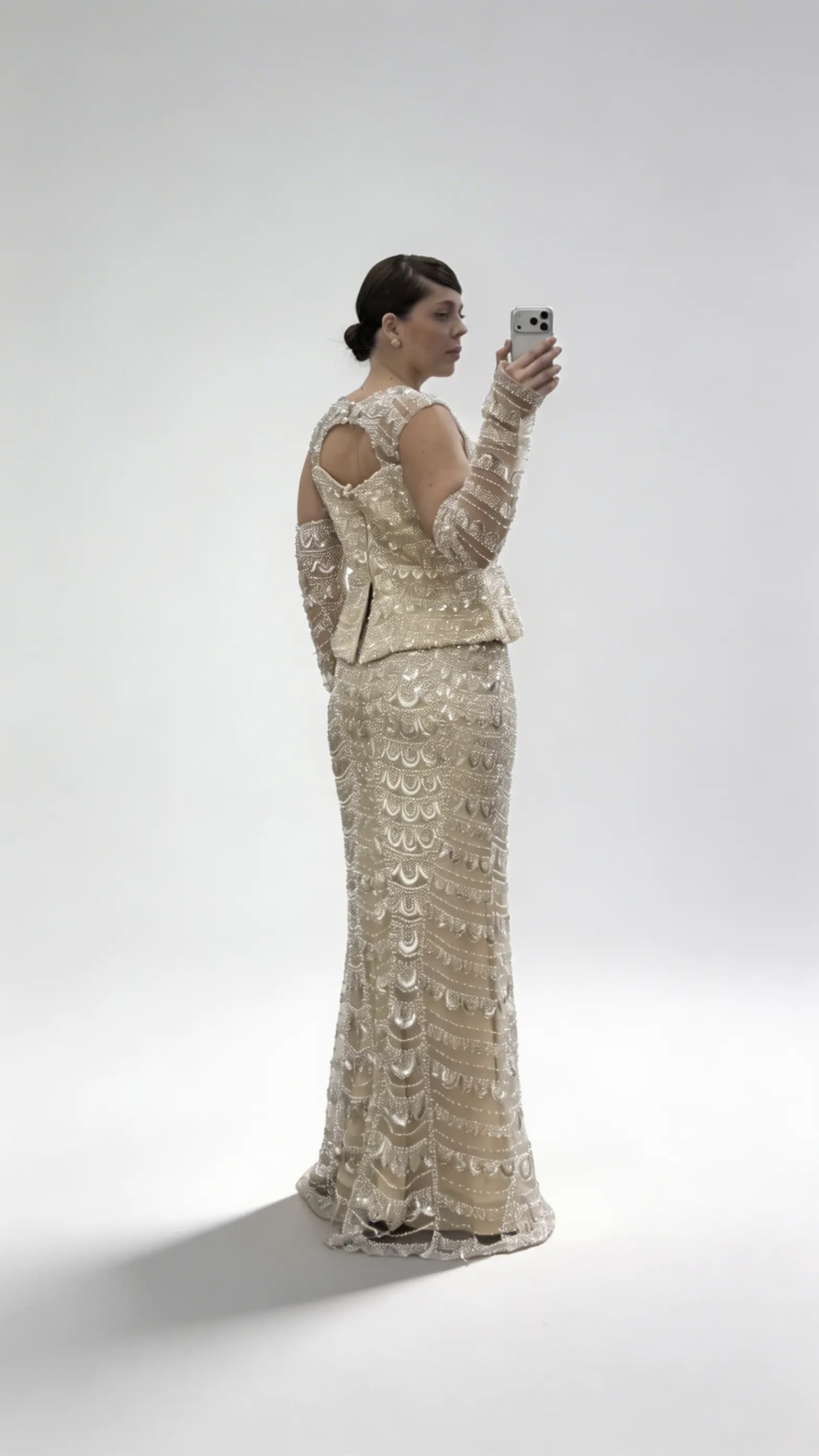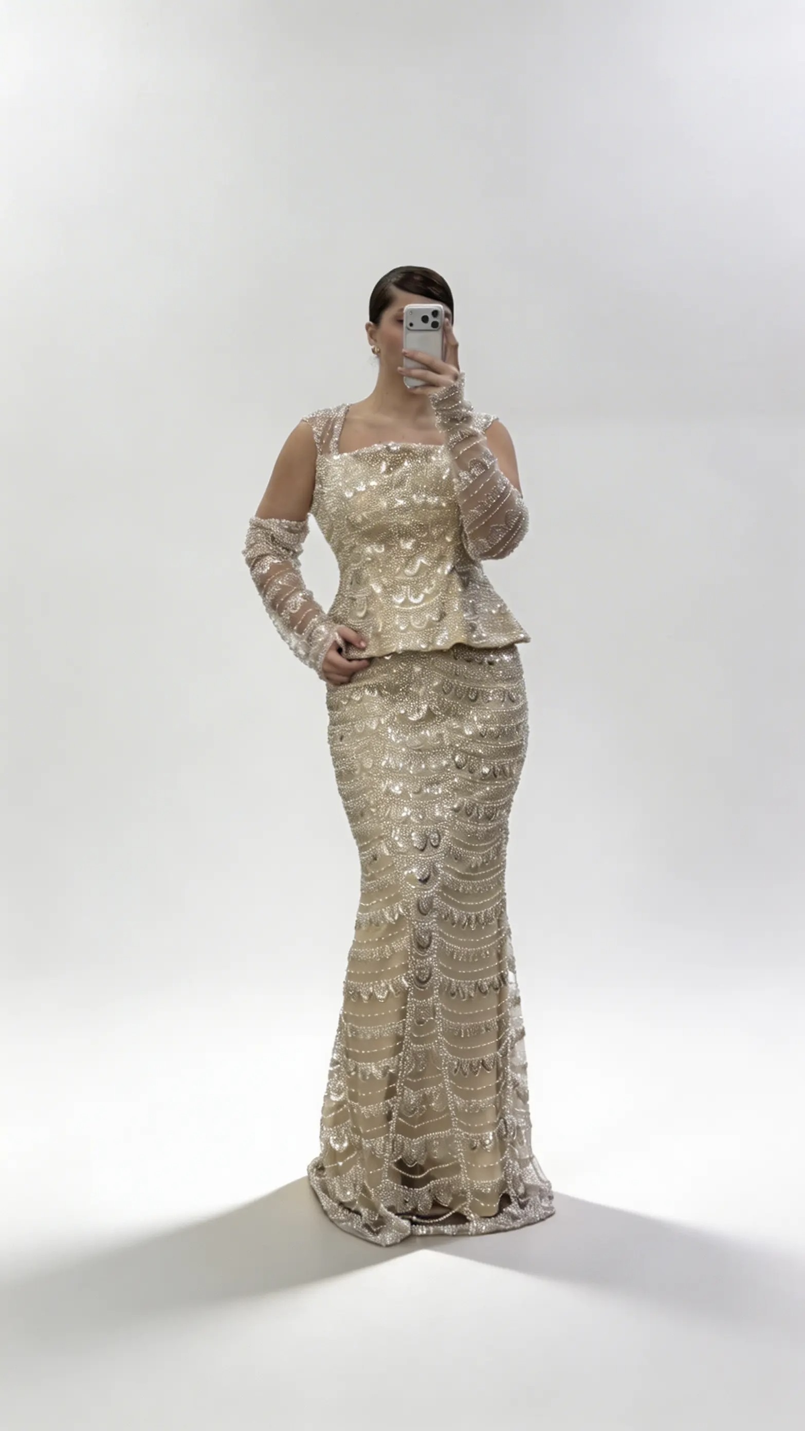 • Gold Omzu Açık Uzun Kollu Pul Payet Büyük Beden Abiye Elbise