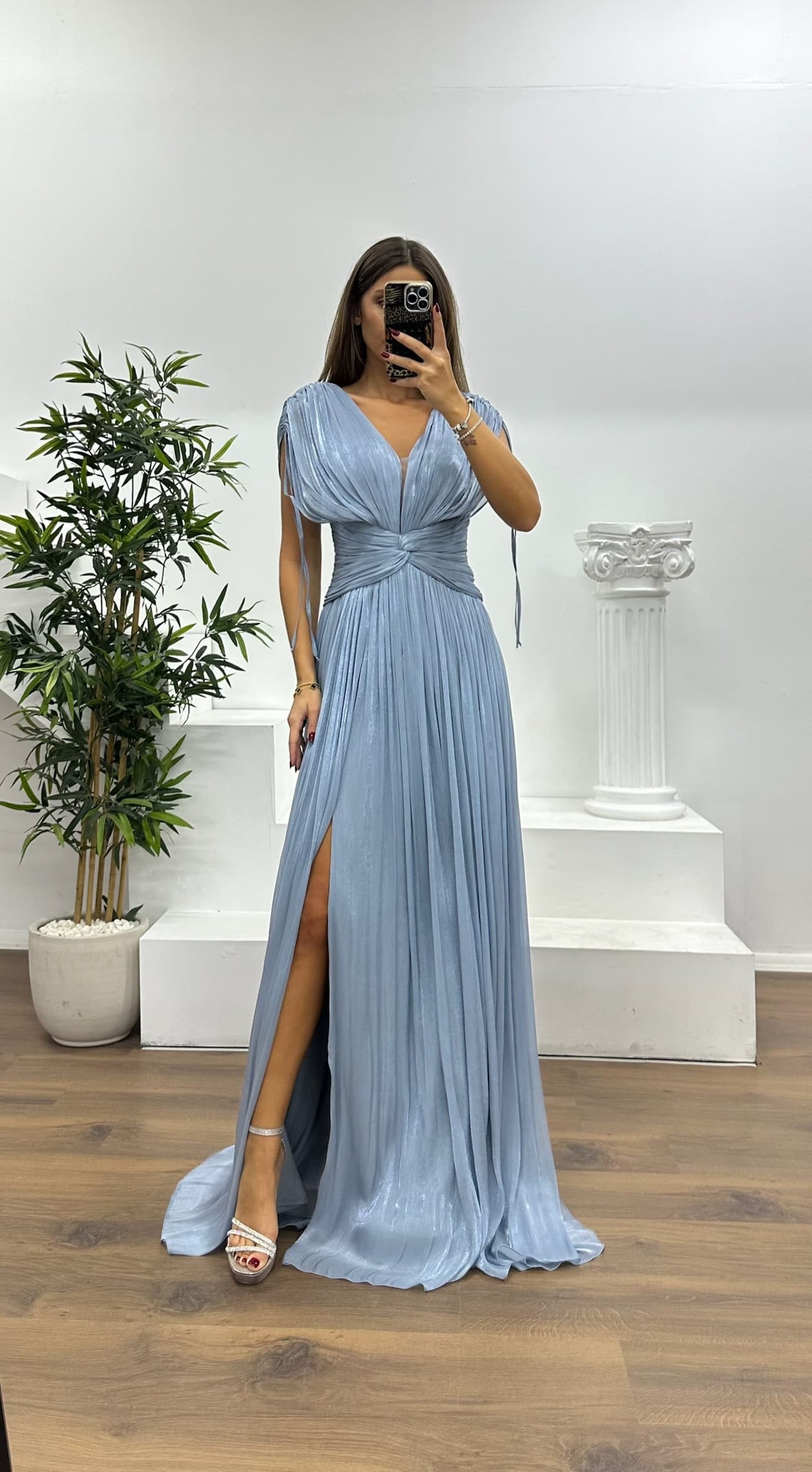 V-Ausschnitt Falten Abendkleid Das Produkt ist für die Größen 36 bis 42 geeignet, mit Brustpolstern, gefüttert, mit Reißverschluss hinten, Schlitz und im Falten-Design. Die Länge des Produkts kann zwischen 175 und 170 cm variieren. Stoffart: Chiffon 66% Viskose 34% Polyester.