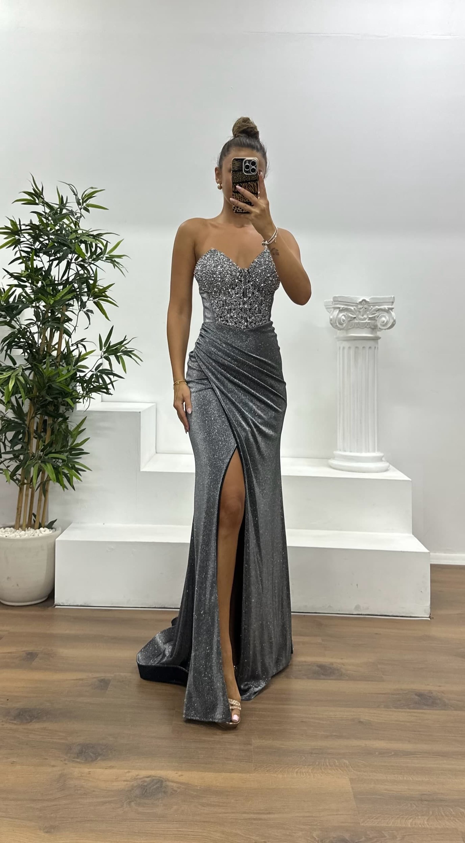 Besticktes glitzerndes Abendkleid Das Produkt passt zu den Größen 36-42, hat gepolsterte Brust, Futter, Schlitz, überkreuzte Rückenriemen und Reißverschluss, entworfen als besticktes Abendkleid. Produktlänge: Kann zwischen 170-175 cm variieren. Stoffart: glitzernd