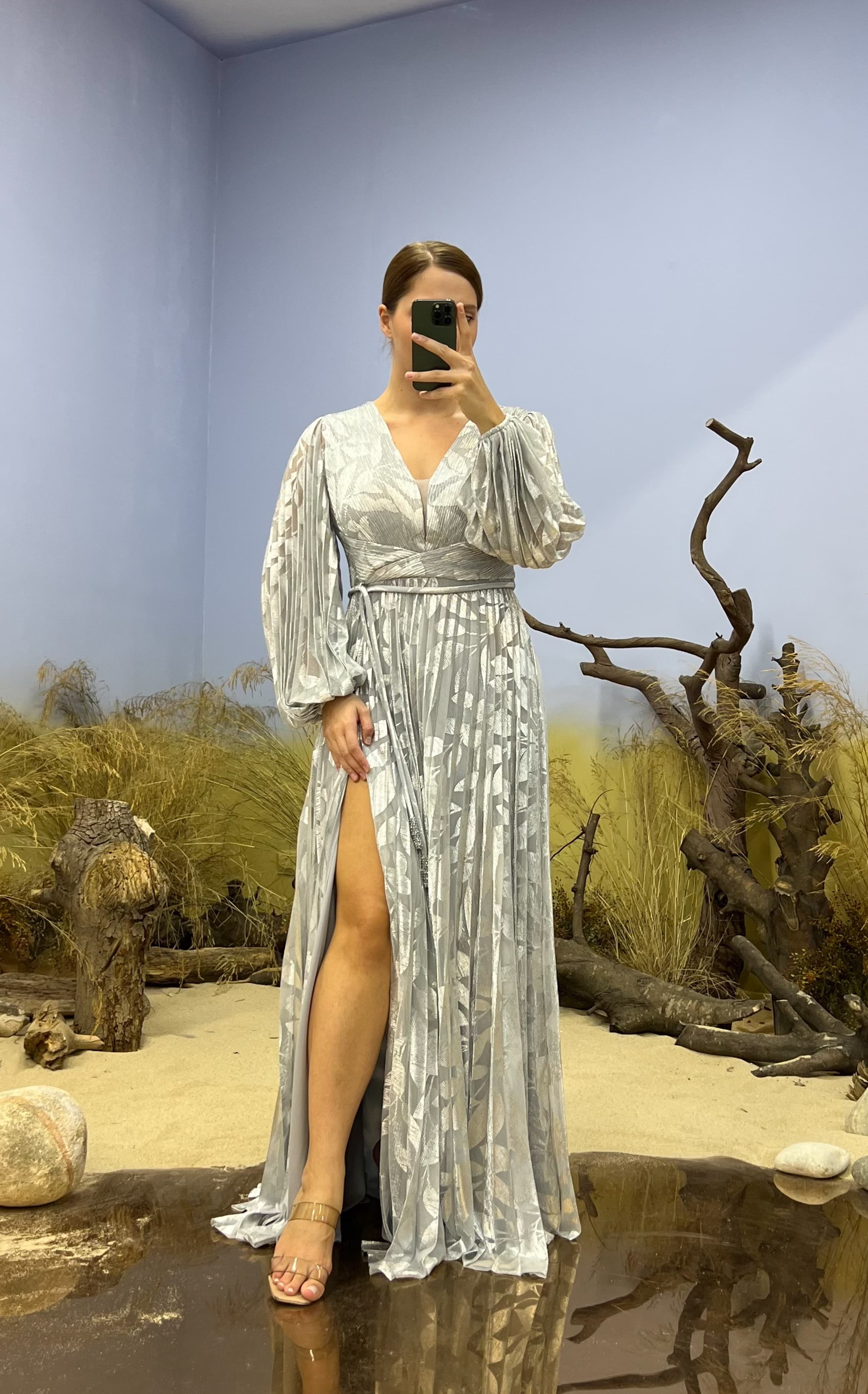 • Gümüş V Yaka Desenli Pliseli Büyük Beden Abiye Elbise