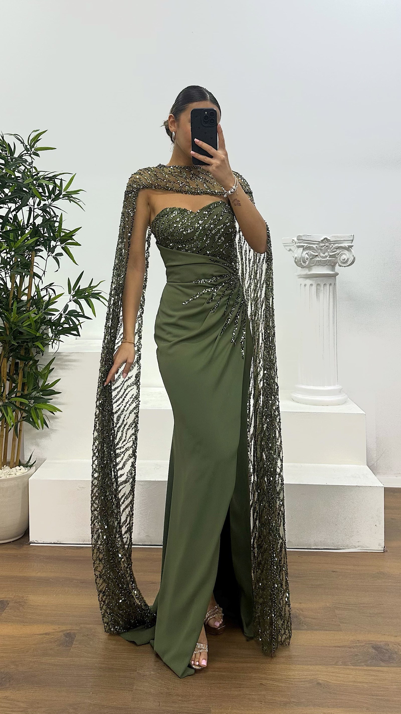 Schulterfreies besticktes Abendkleid mit Umhang Das Kleid ist schulterfrei, bestickt und mit einem Umhang gestaltet. Es passt für Größen 36–42, ist gefüttert, mit Brustpolstern, einem Reißverschluss am Rücken und einem Schlitz. Kleidlänge: Kann zwischen 170–175 cm variieren. Stoffart: Atlas, 100 % Polyester.