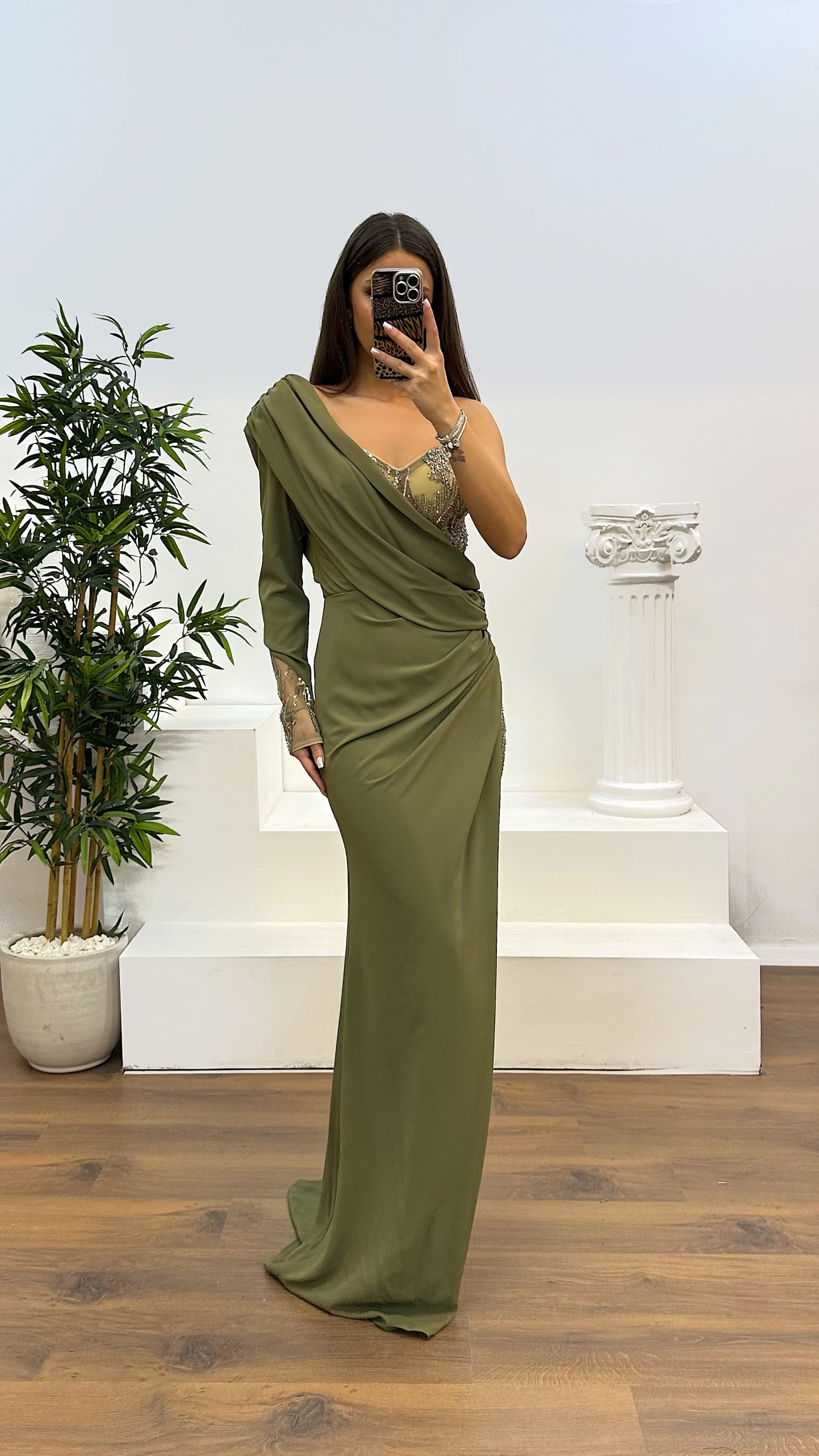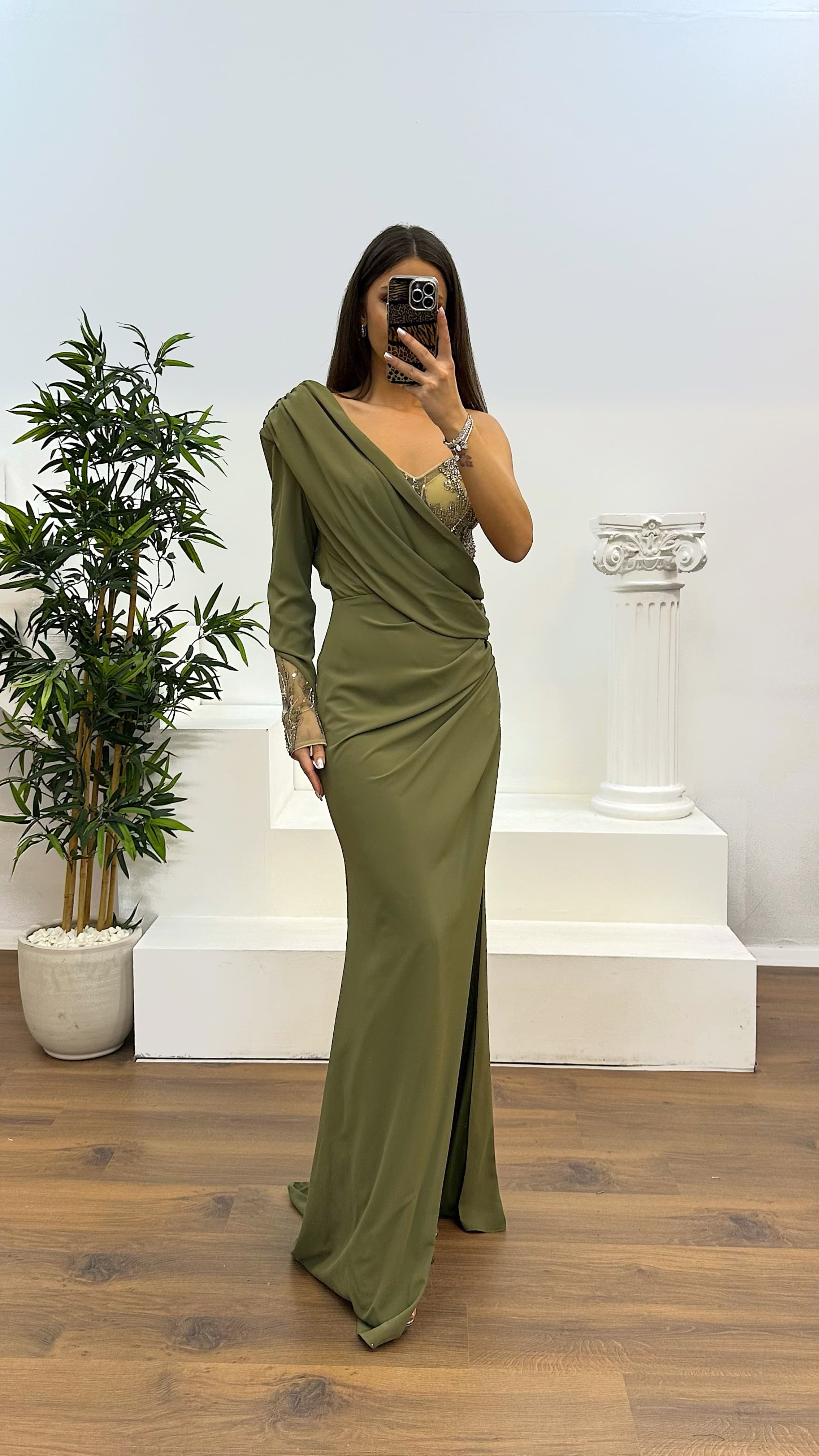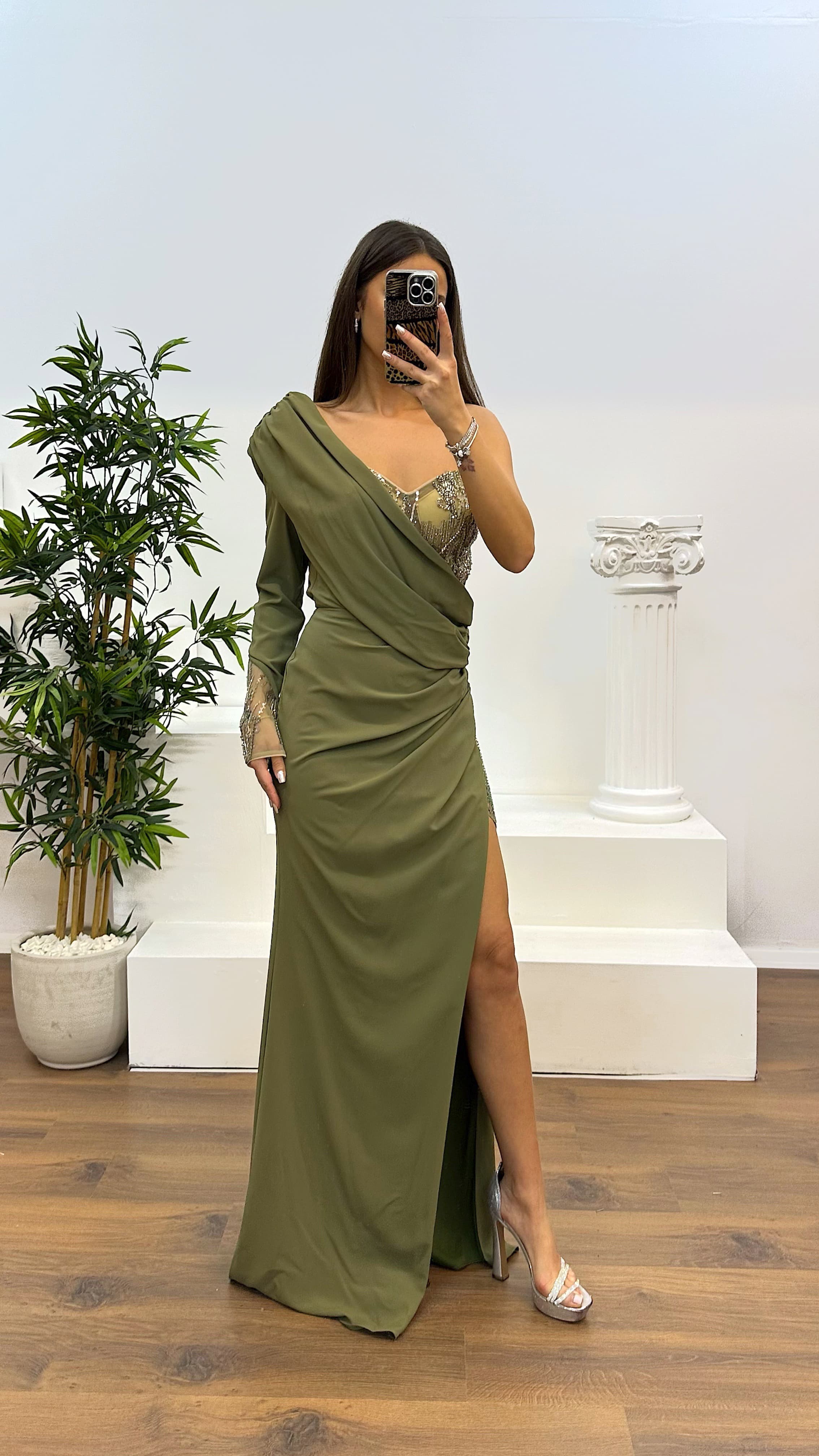 Ein Schulter Abendkleid mit Stickdetails Das Produkt ist in den Größen 36 bis 40 erhältlich, mit Brustpolster, gefüttert, Reißverschluss auf der Rückseite, Schlitz, und wurde mit Stickdetails als Abendkleid entworfen. Länge des Produkts: Kann zwischen 165-170 cm variieren. Stoffart: Atlas 100% Polyester.