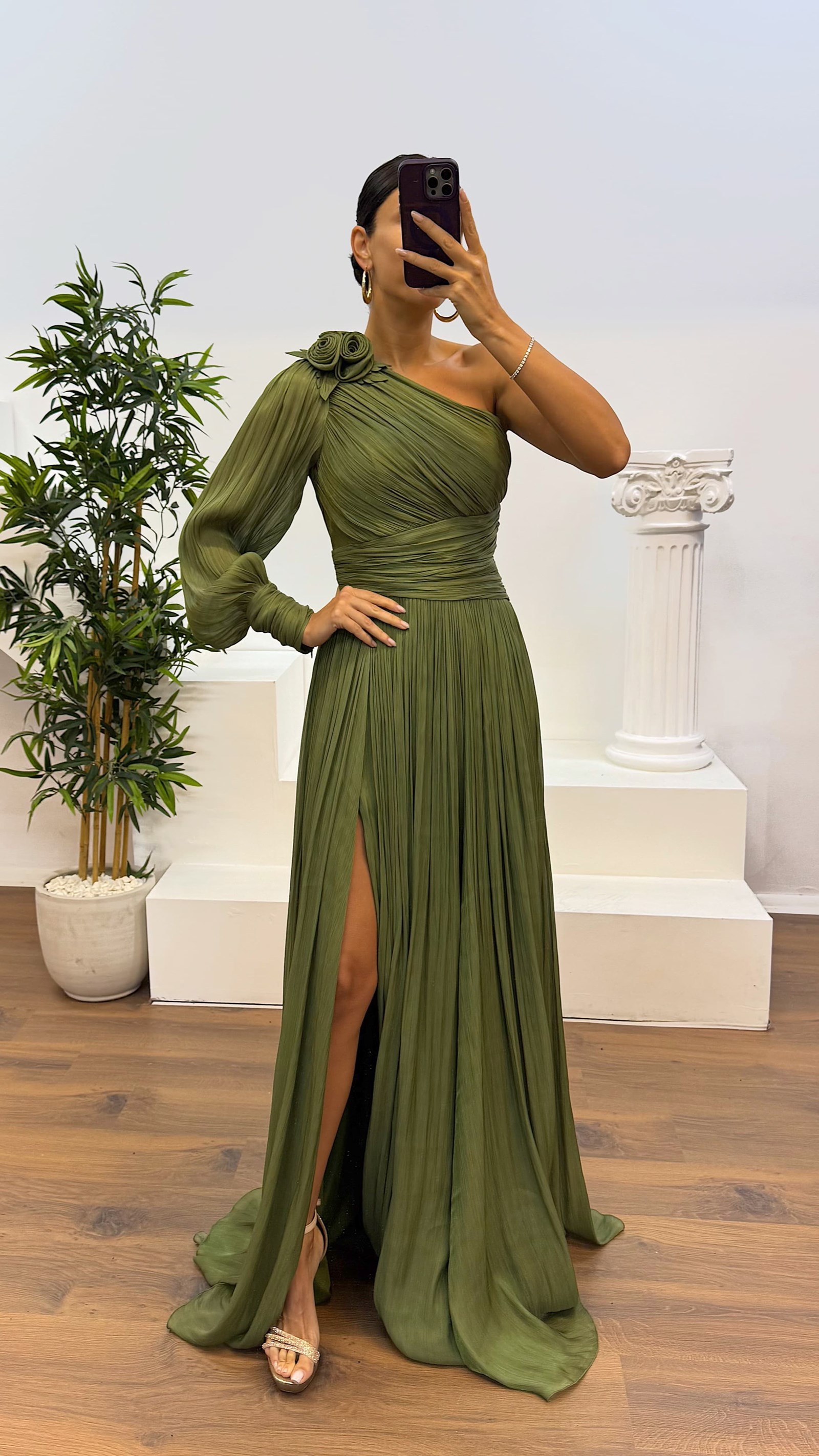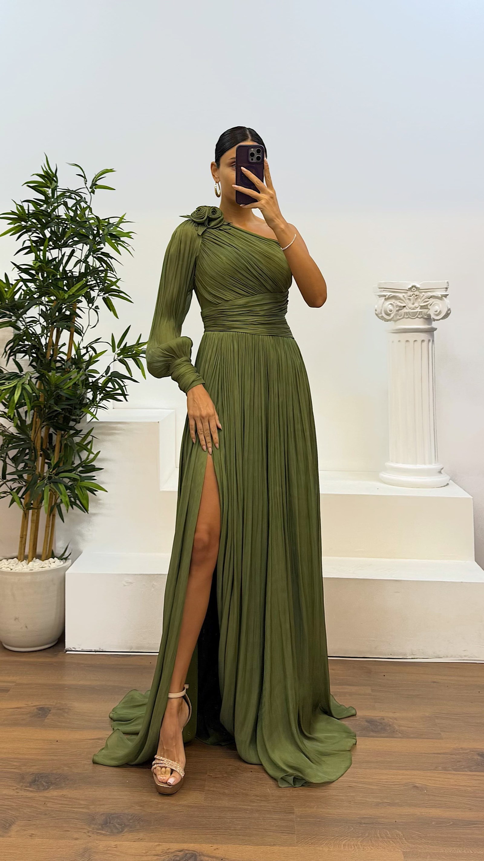 Abendkleid mit Plissee und einem Ärmel Das Kleid ist für Größen von 36 bis 42 geeignet und wurde als Abendkleid mit Brustpolstern, Futter, Reißverschluss, Schlitz, Plissee und Schulterdetails entworfen. Kleidlänge: kann zwischen 165 und 170 cm variieren. Stoffart: Chiffon – 66 % Viskose, 34 % Polyester.