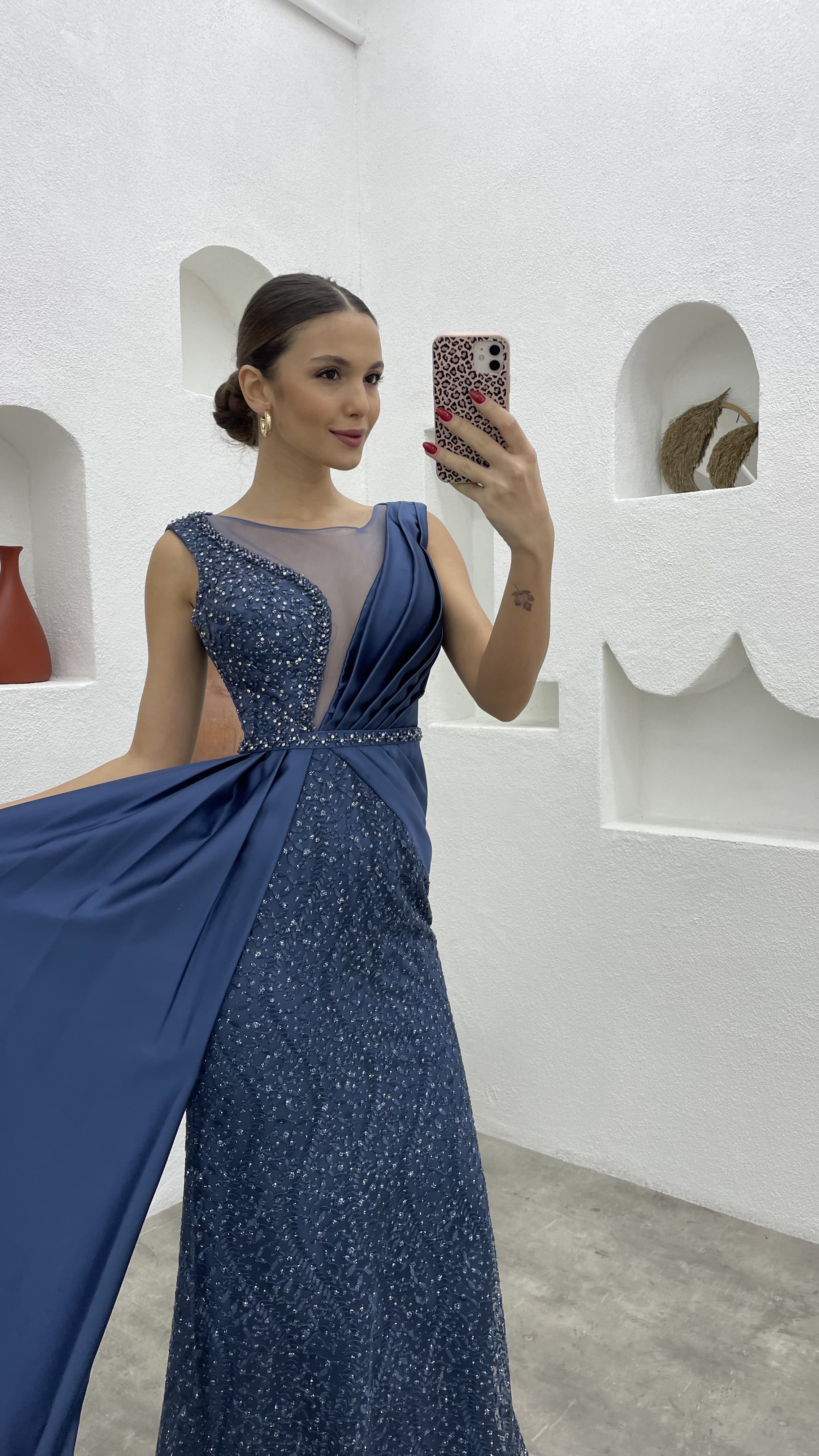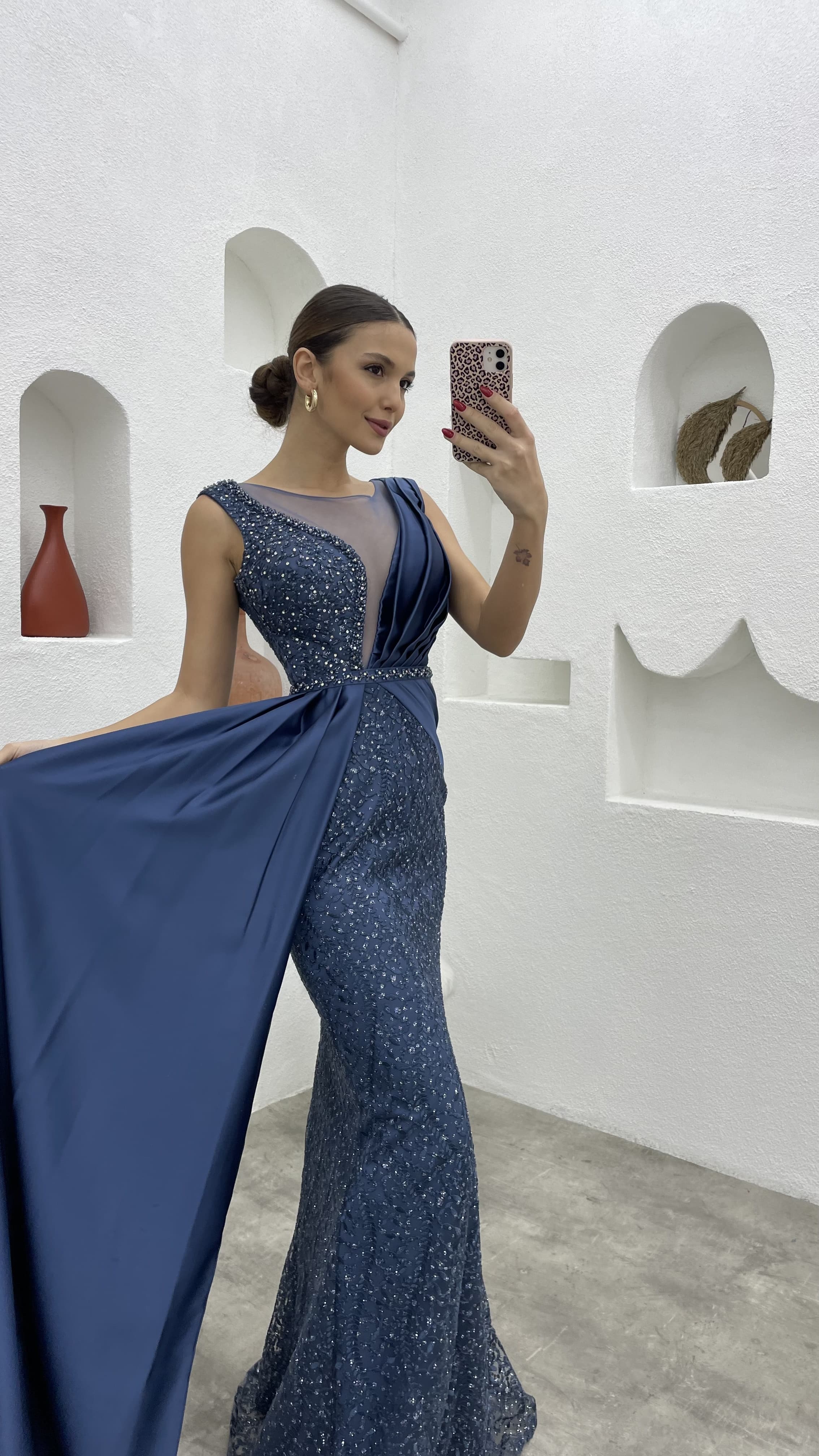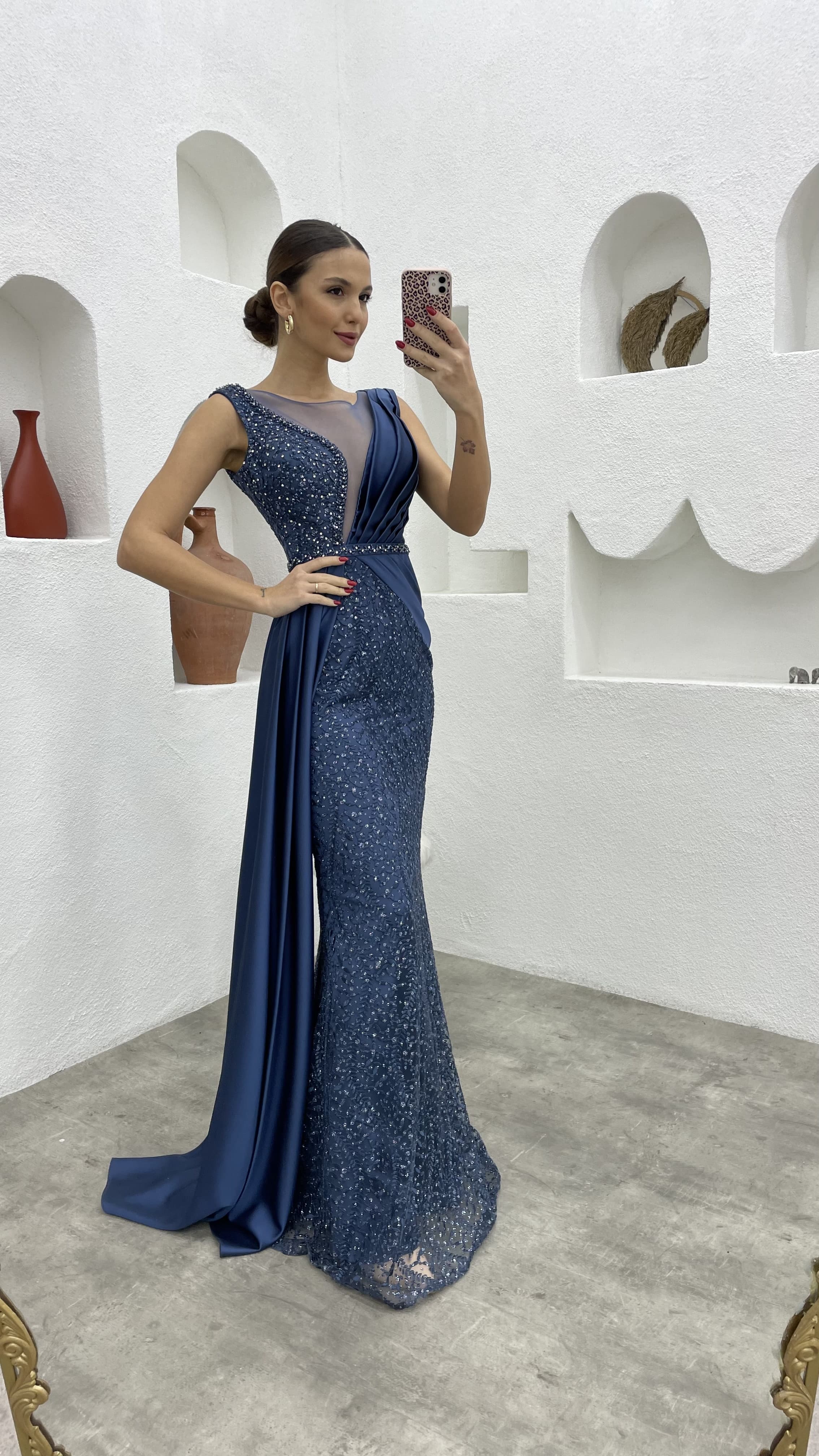 Indigo besticktes, drapiertes Satin-Abendkleid