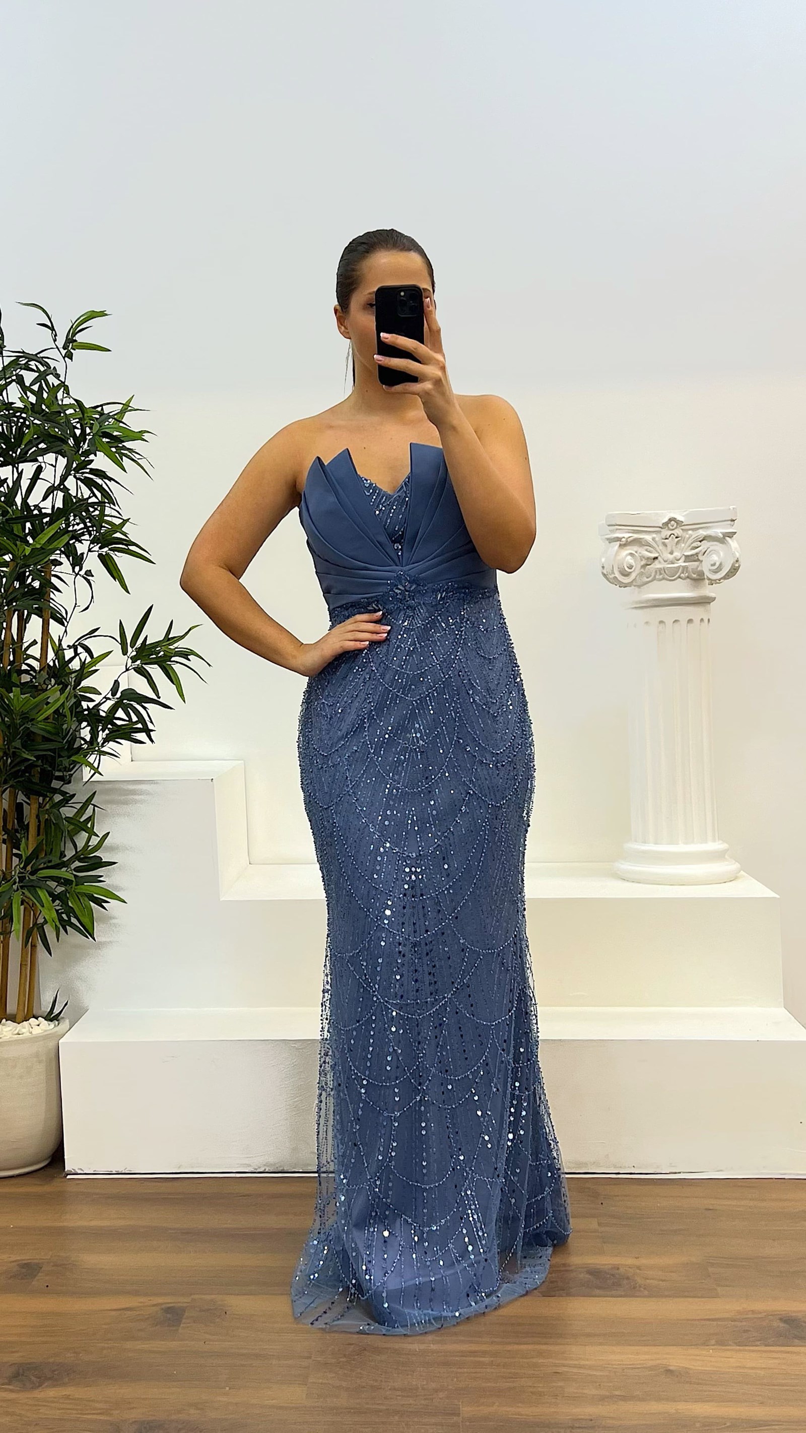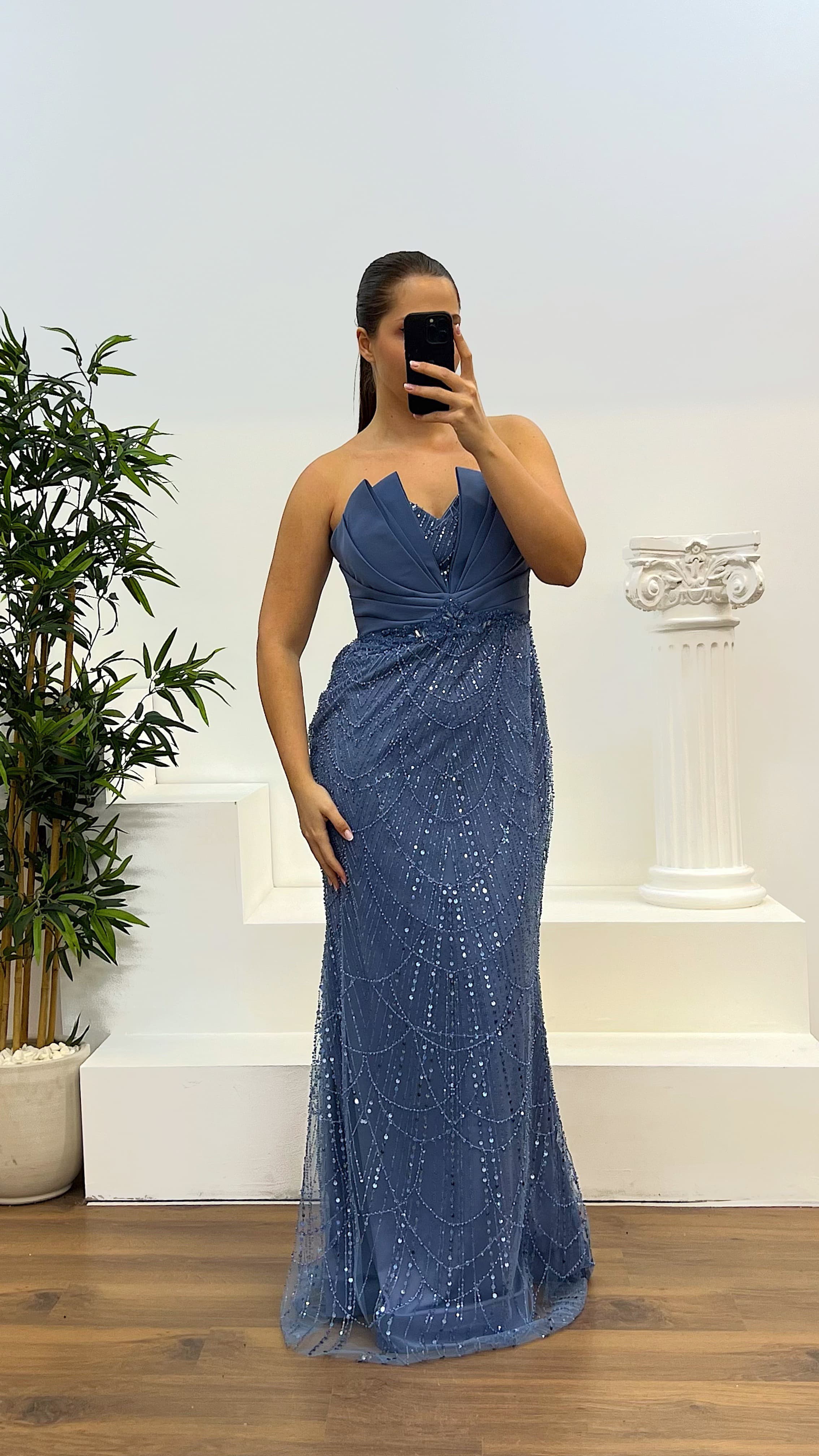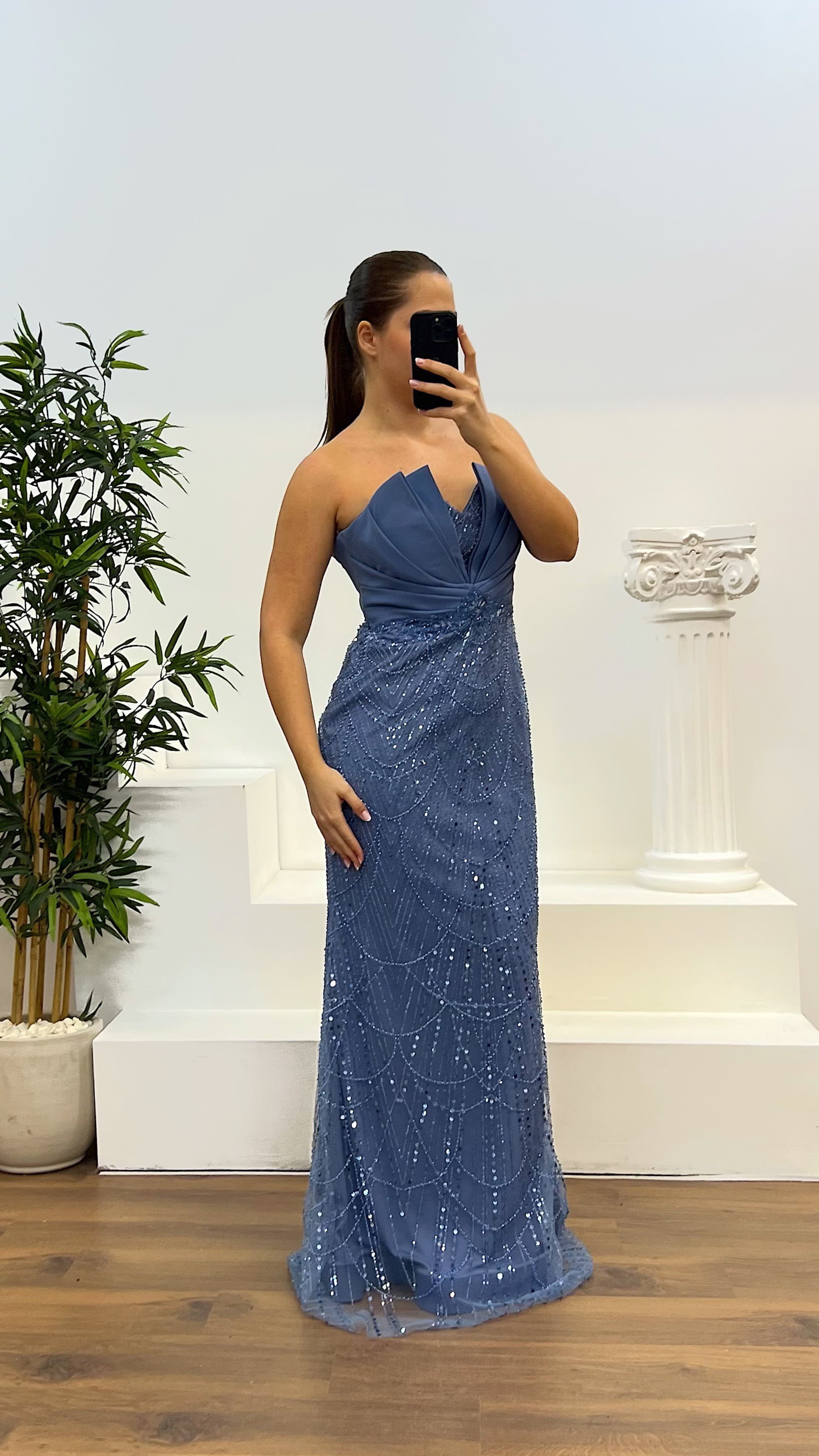 Strapless Abendkleid mit besticktem Design Das Produkt ist für die Größen 46 bis 50 geeignet, mit eingebautem Brustpolster, gefüttert, mit Reißverschluss auf der Rückseite, und wurde als besticktes Abendkleid entworfen. Die Länge des Produkts beträgt 160 cm. Stoffart: besticktes Tüll, 3% Lycra, 97% Polyester.
