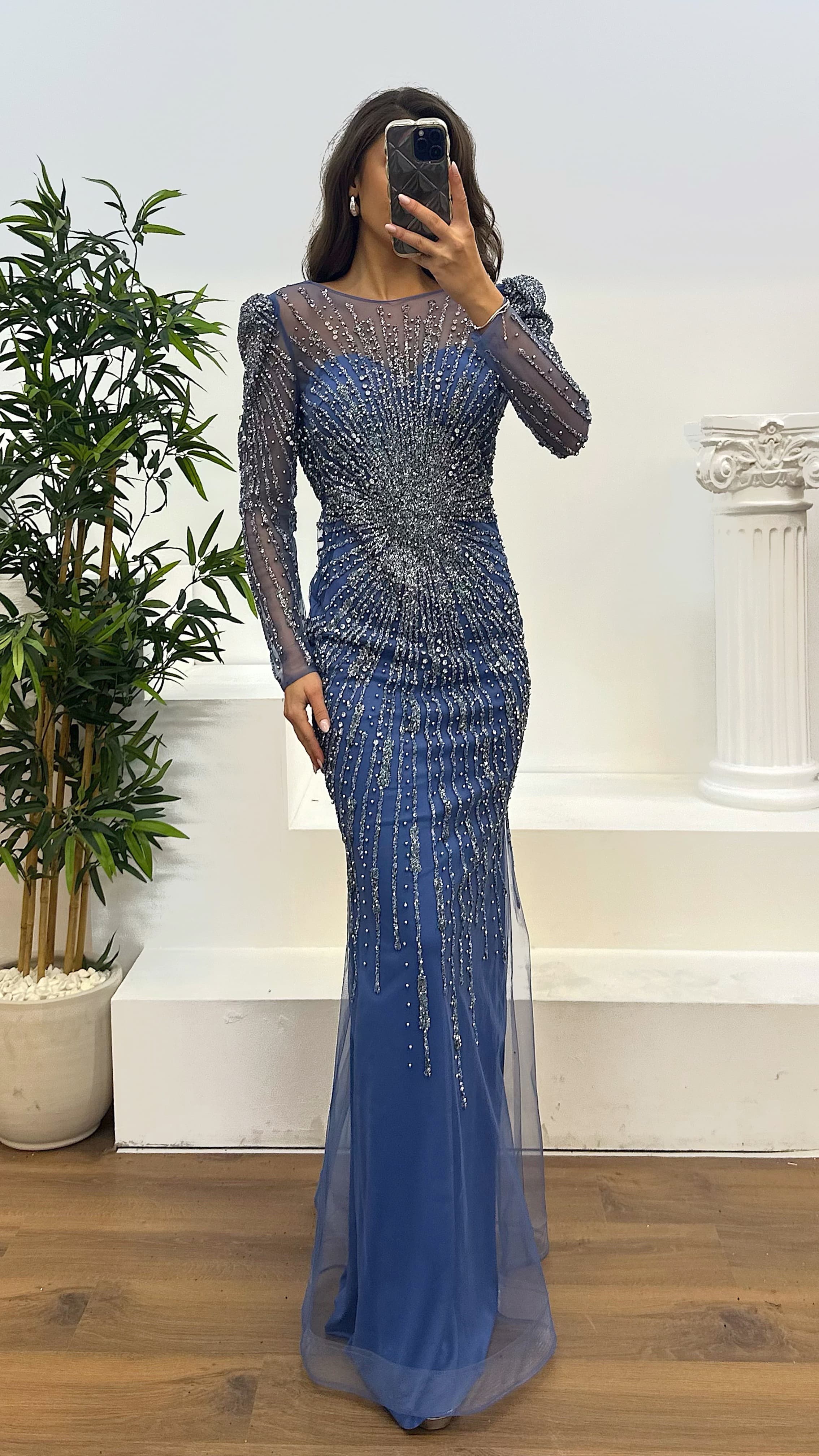 Besticktes Abendkleid Das Produkt ist für Größen von 36 bis 44 geeignet, mit Brustpolster, gefüttert, mit Reißverschluss hinten, und als besticktes Abendkleid designt. Die Länge des Produkts kann zwischen 165-170 cm variieren. Die Ärmellänge des Produkts beträgt 60 cm. Stoffart: Tüll mit 3% Lycra und 97% Polyester.