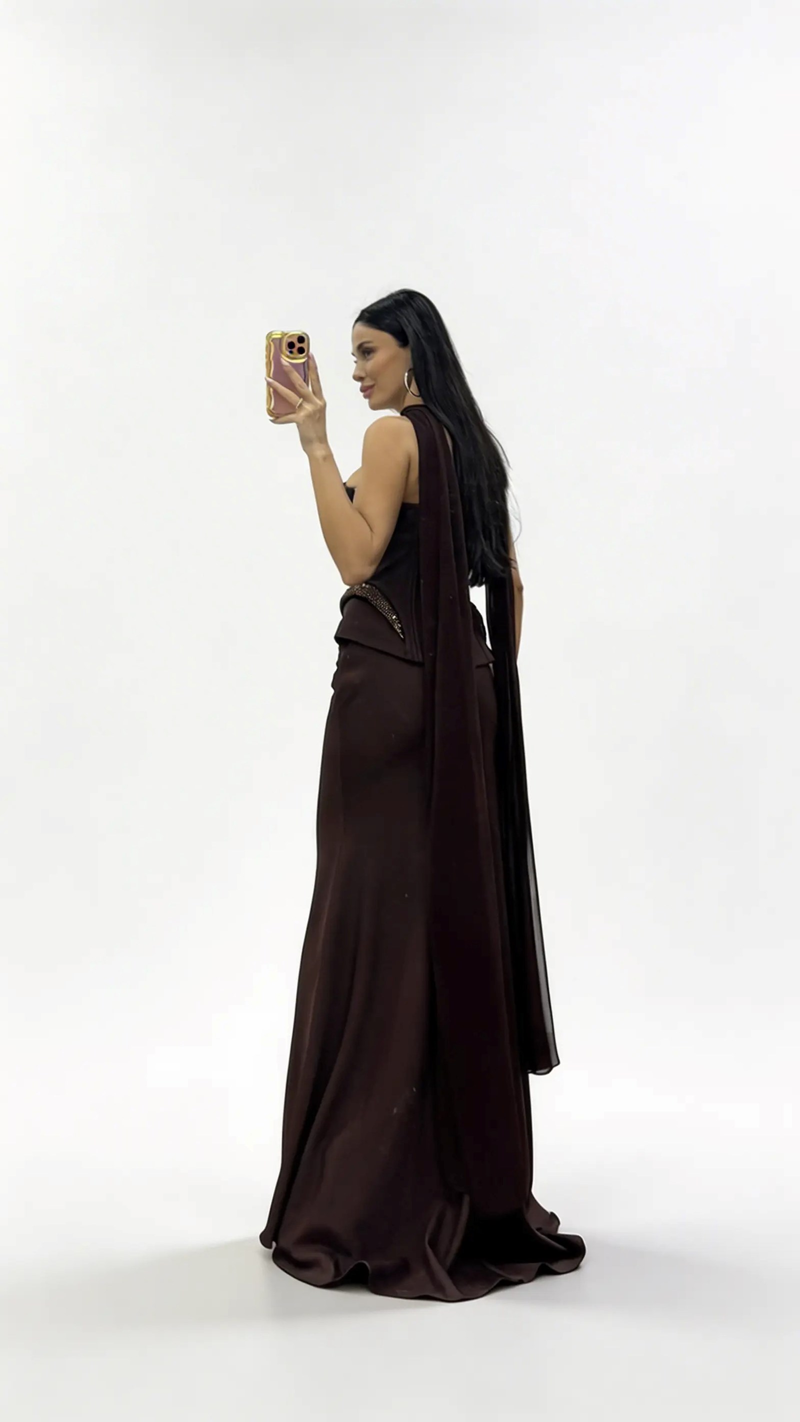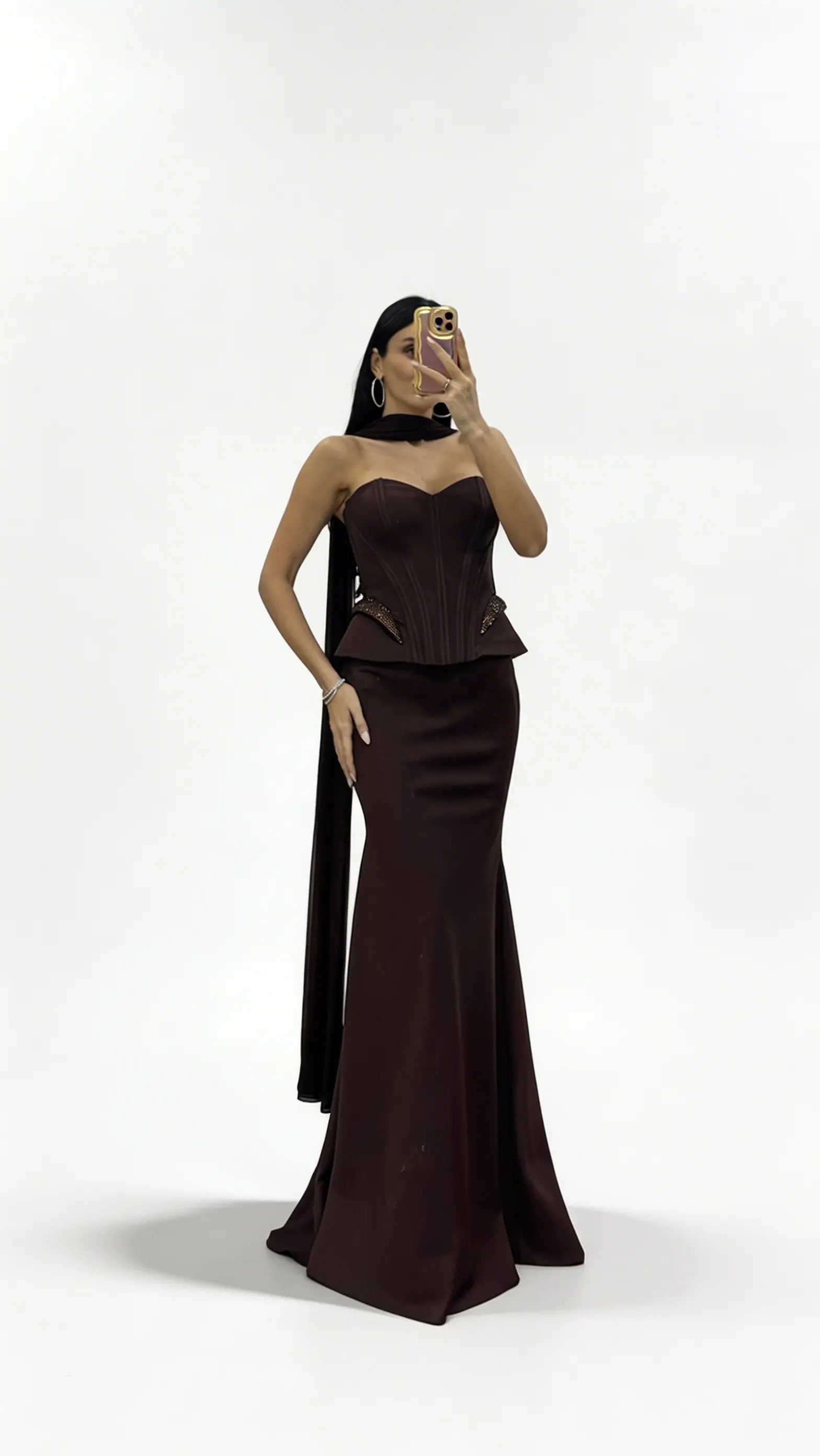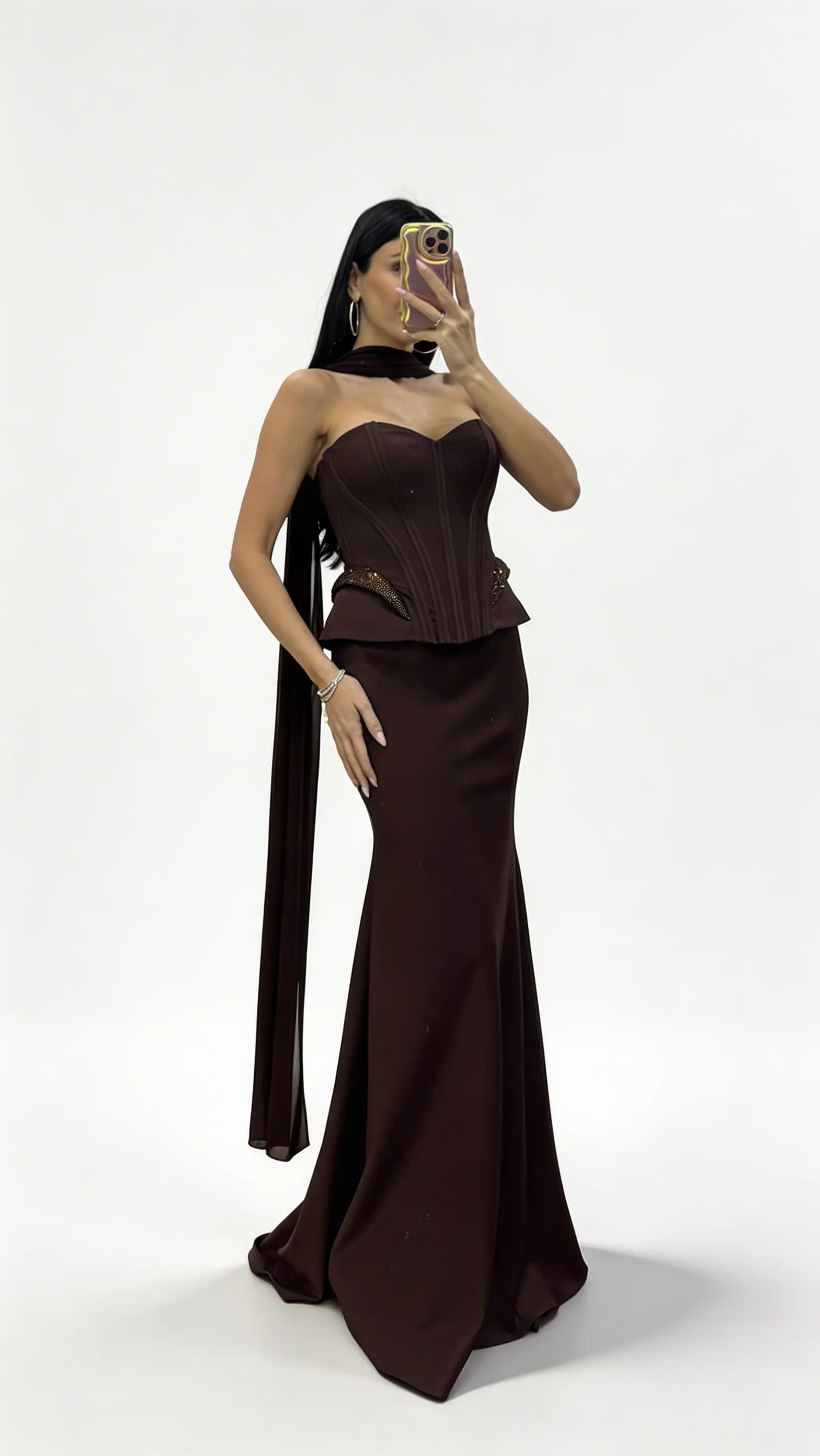• Langes Abendkleid in Braun mit Korsettnähten und taillierter Schößchenform