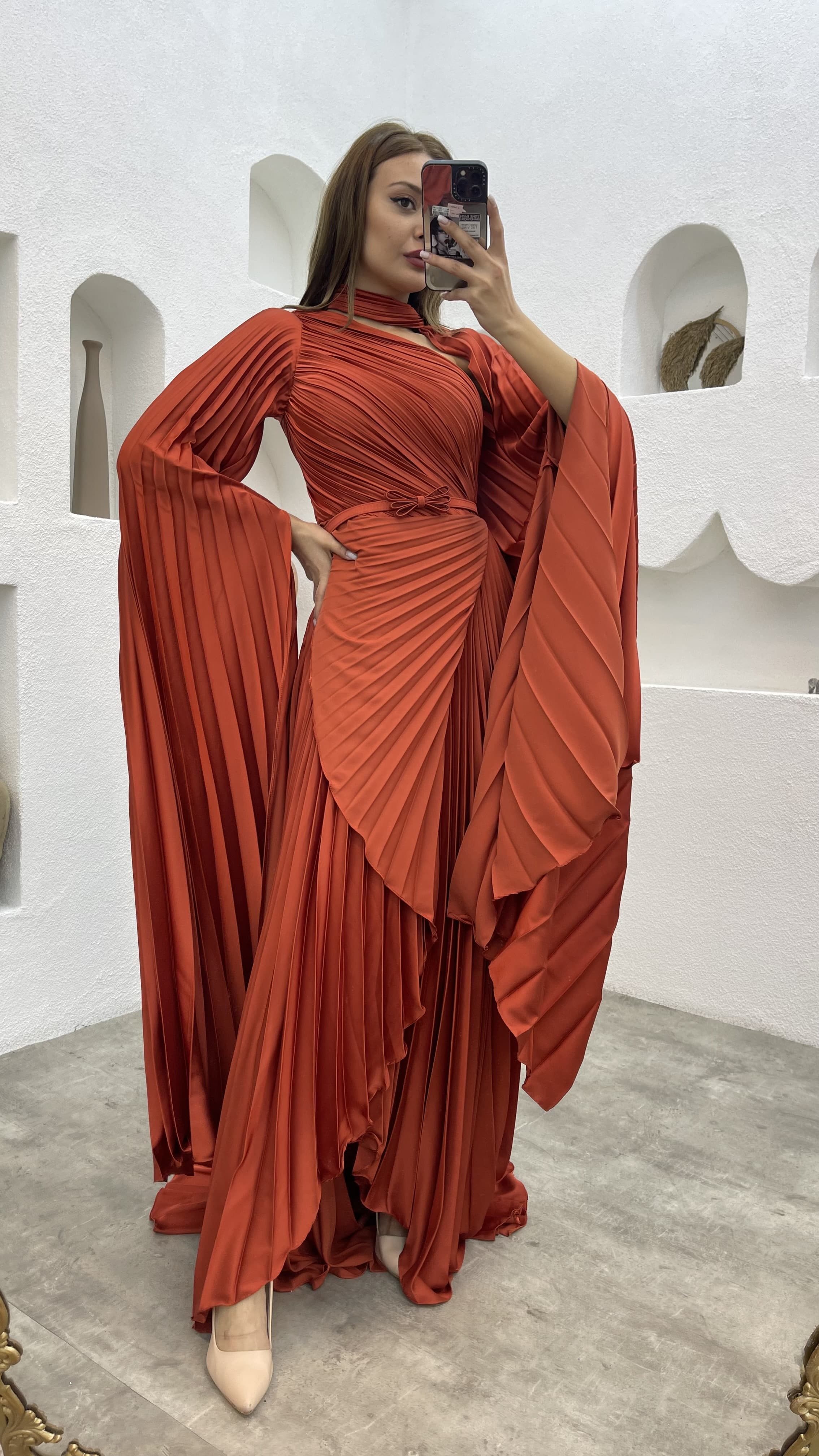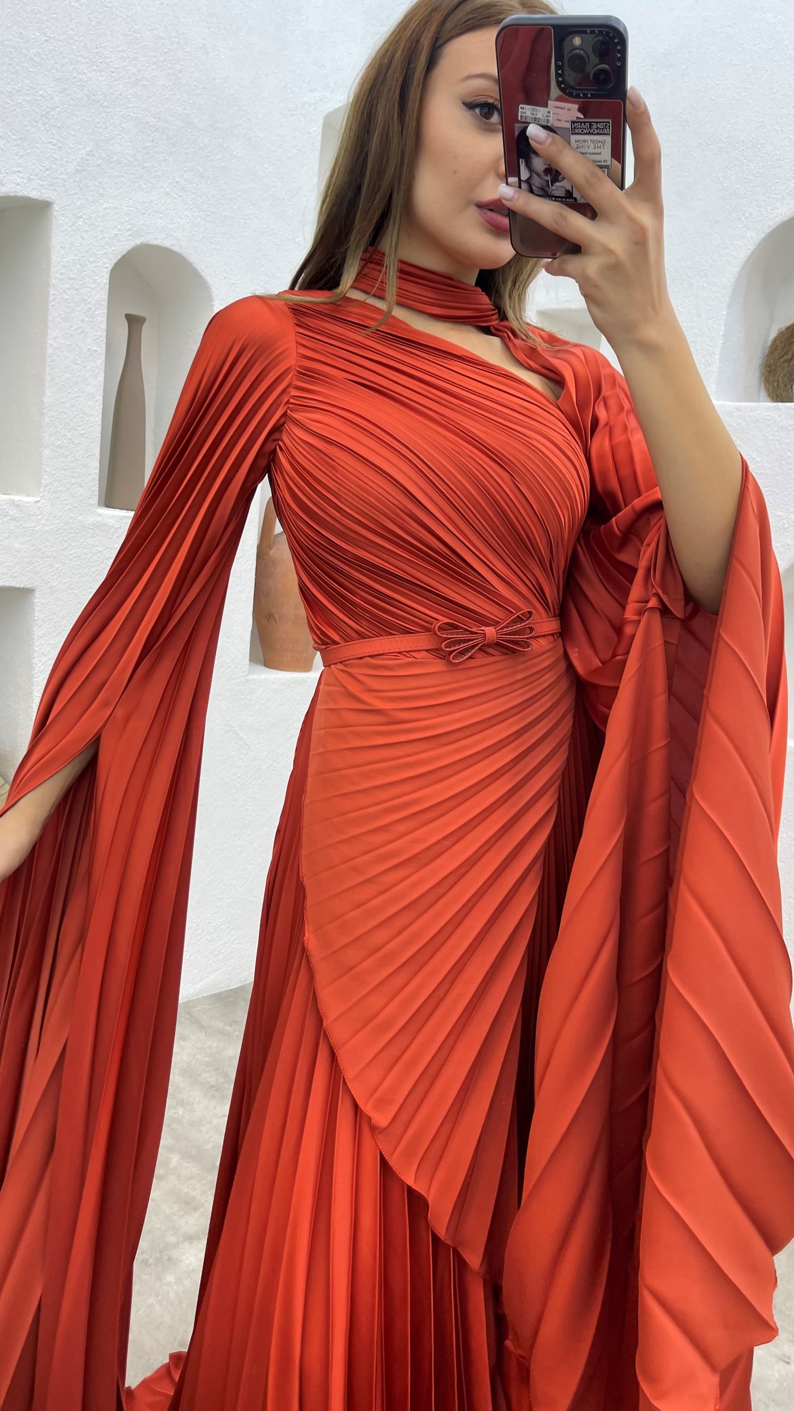 • Kiremit Piliseli Tek Omuz Saten Abiye Elbise