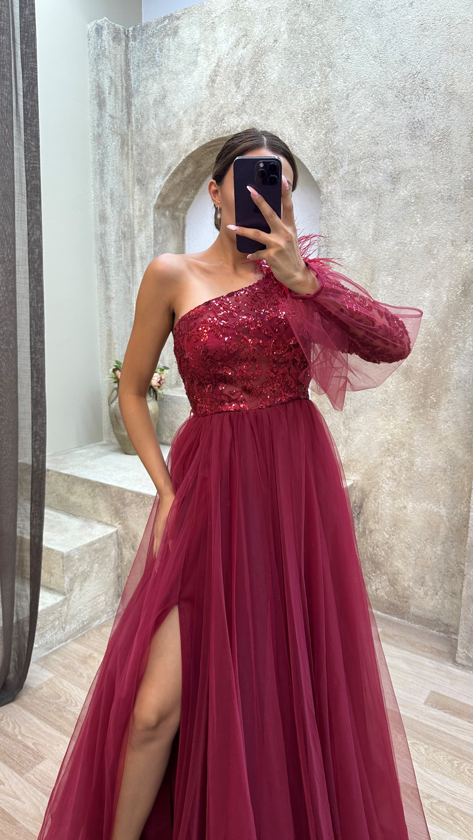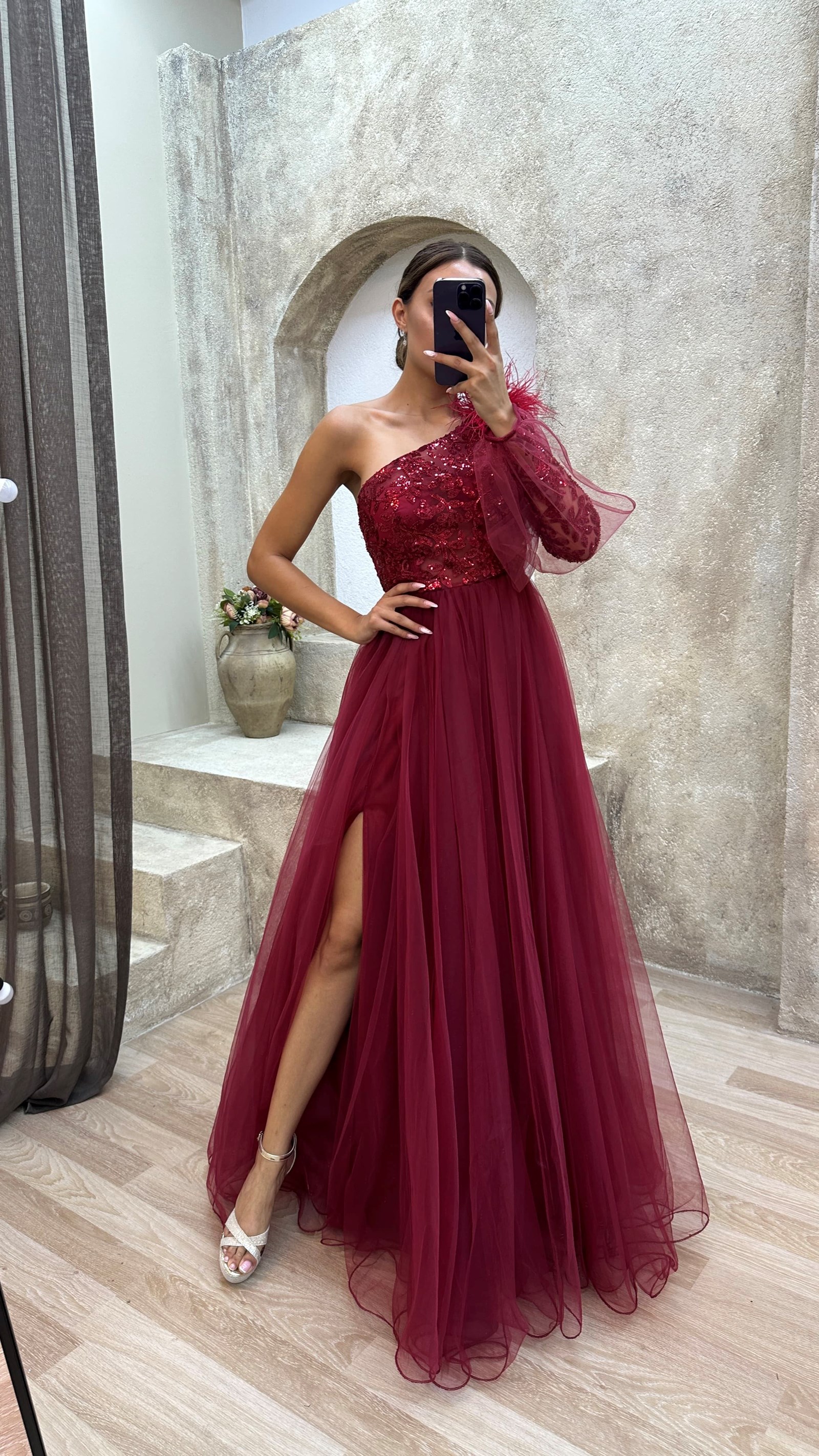 • Kırmızı Balon Kol Omuzu Tüy Detay Tül Abiye Elbise