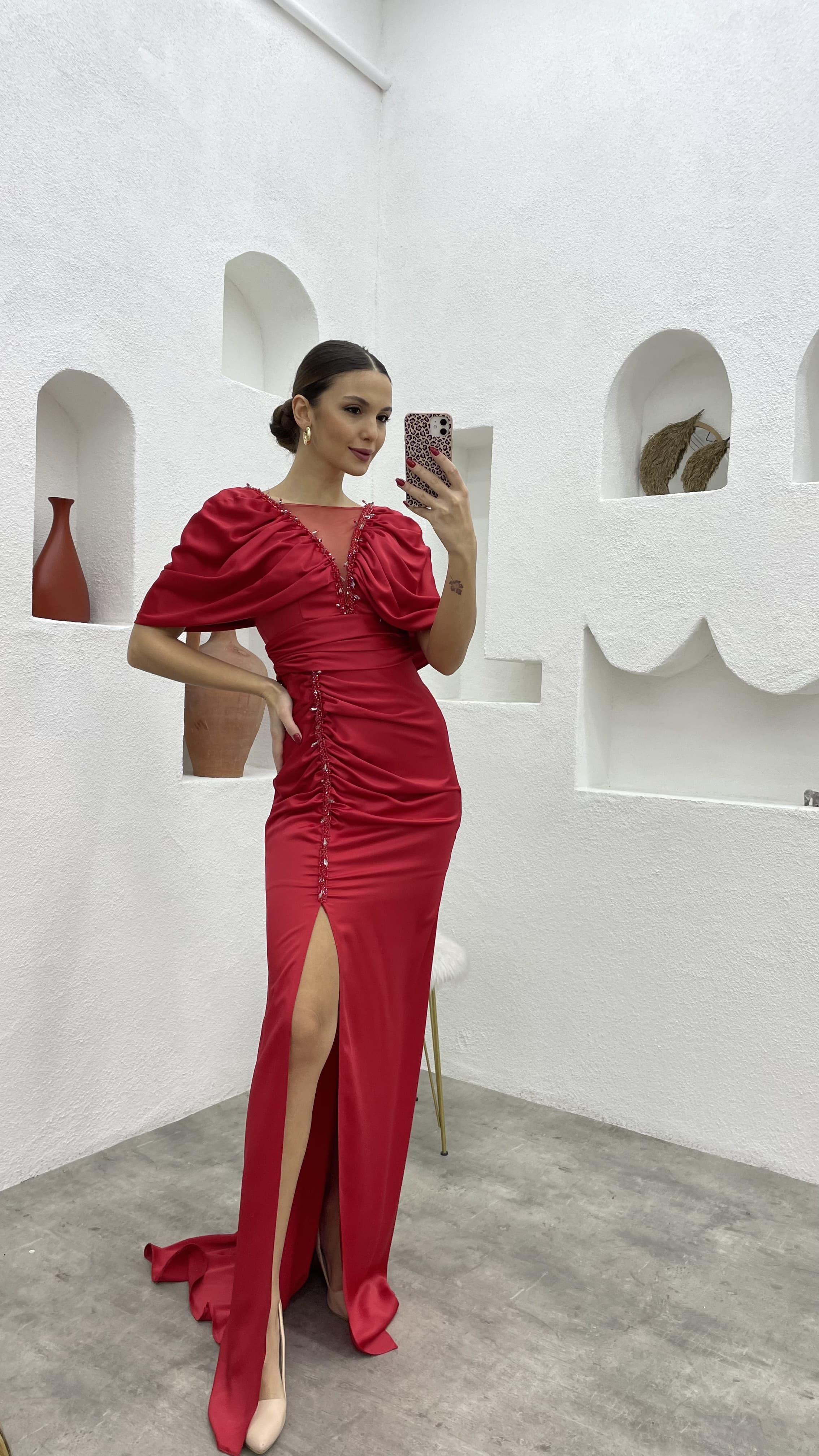 • Kırmızı İşlemeli Balon Kol Büzgülü Saten Abiye Elbise