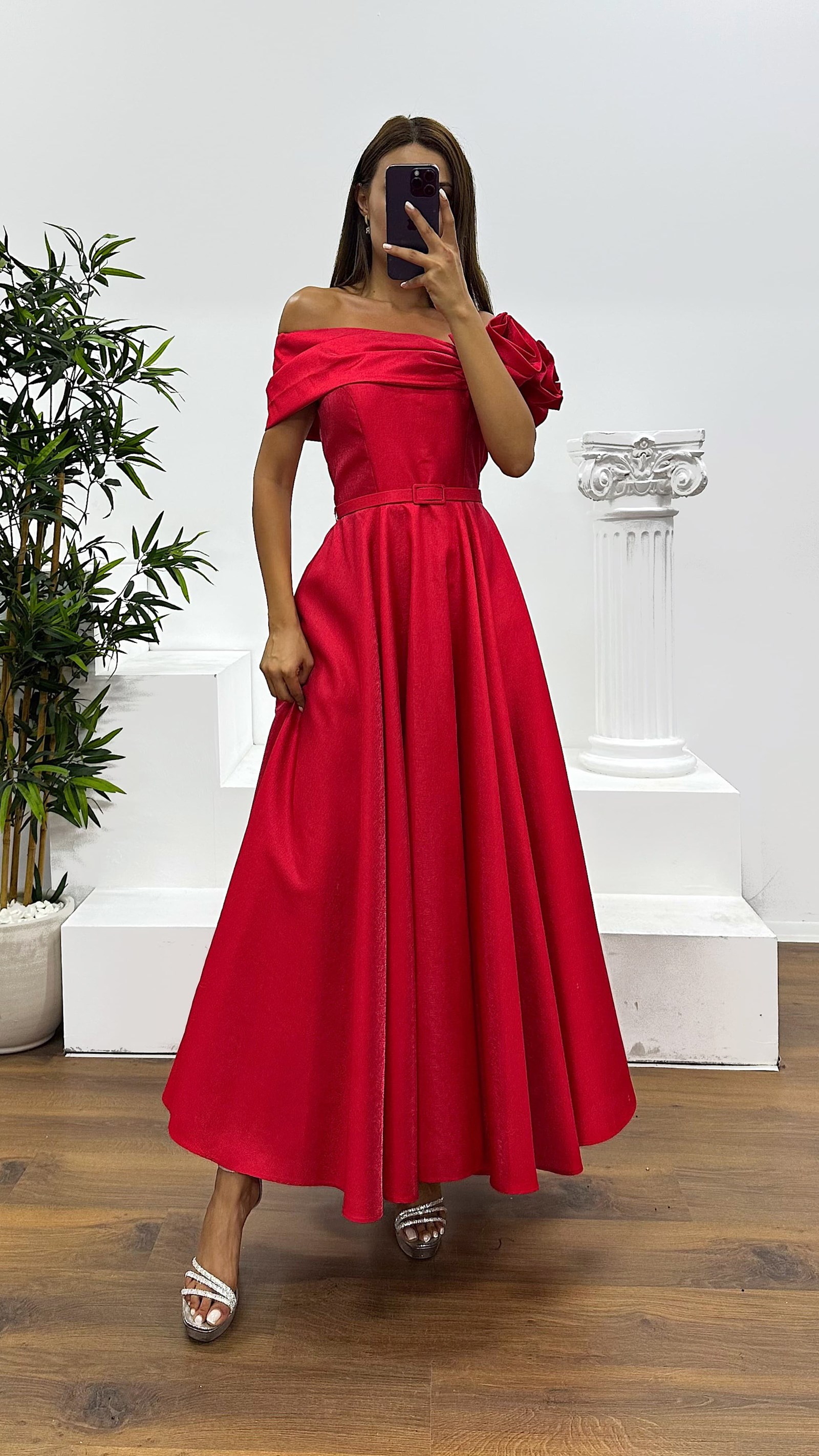 • Kırmızı Omuz Çiçek Detay Midi Abiye Elbise