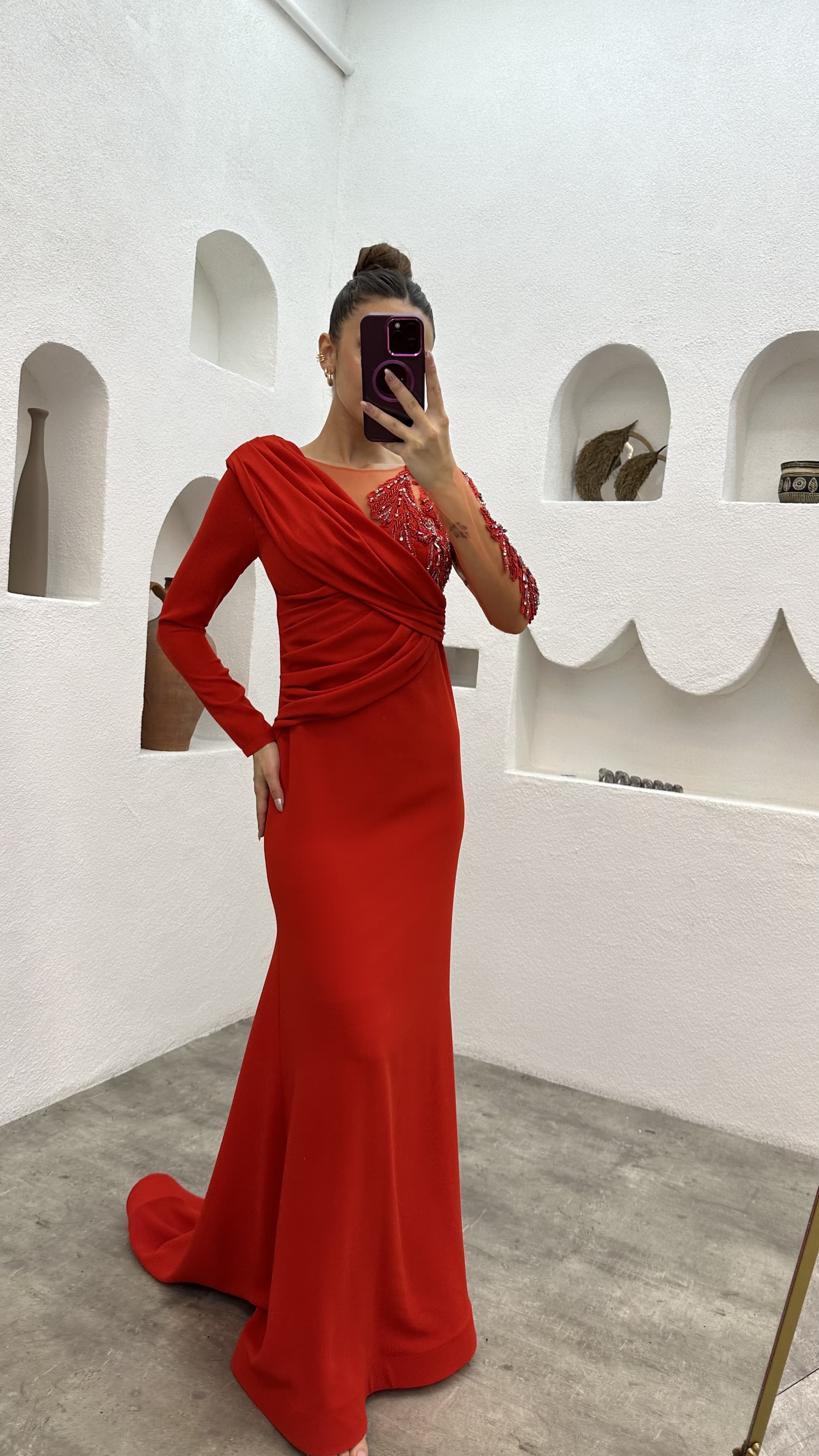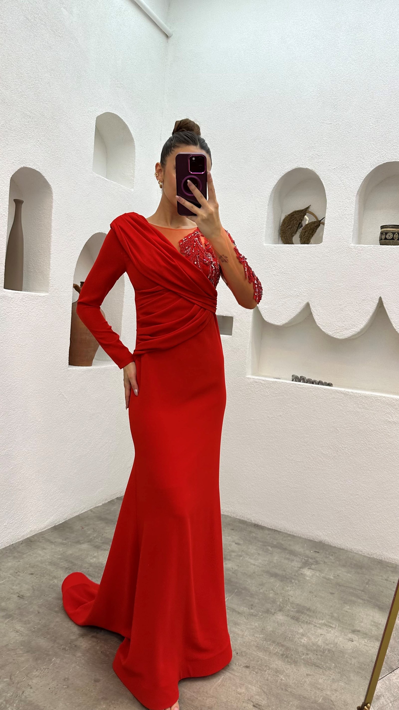 • Kırmızı Tül Detay İşlemeli Drapeli Abiye Elbise