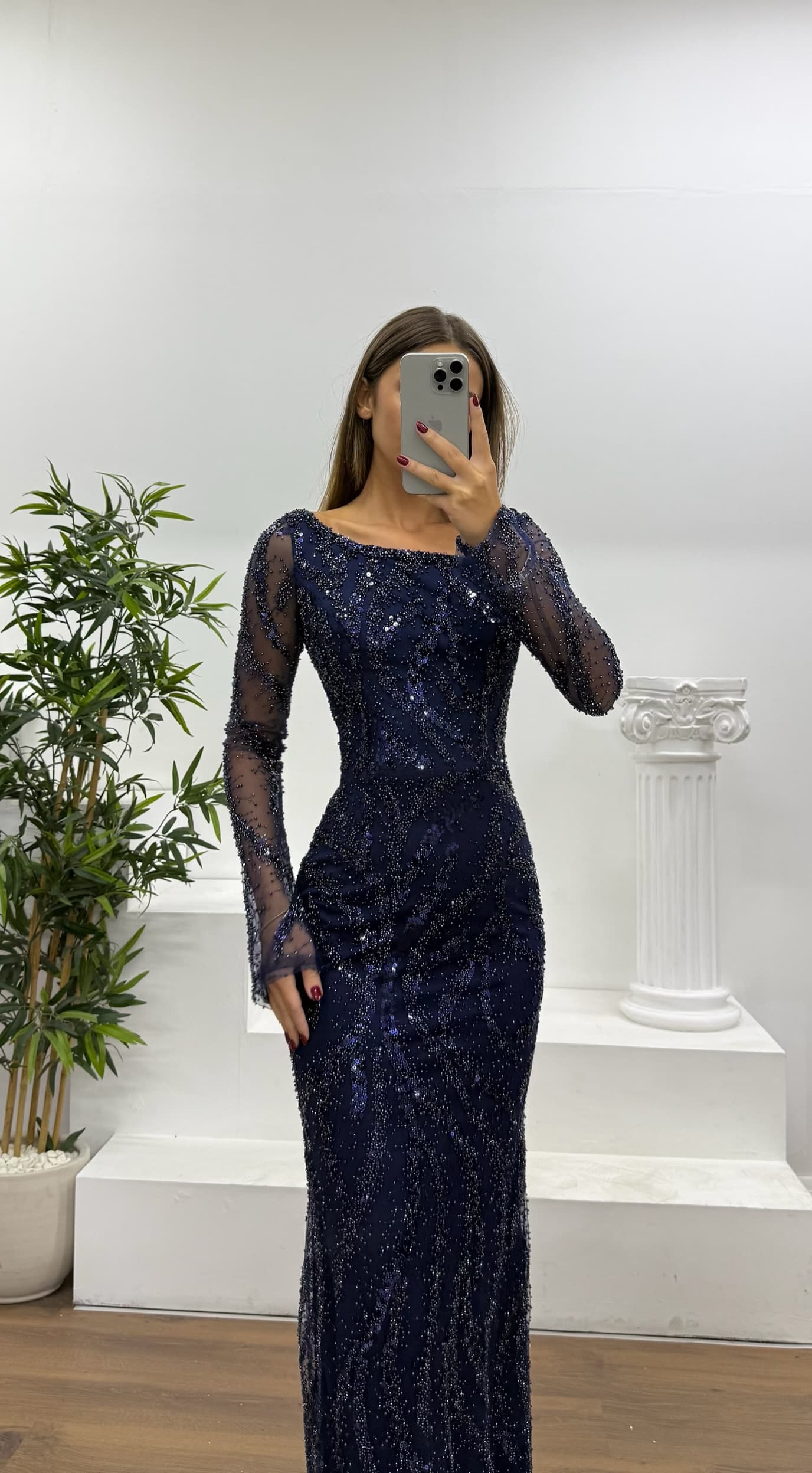 5 BewertungLacivert Asimetrik Yaka İşlemeli Abiye Elbise Ürün Yorumları