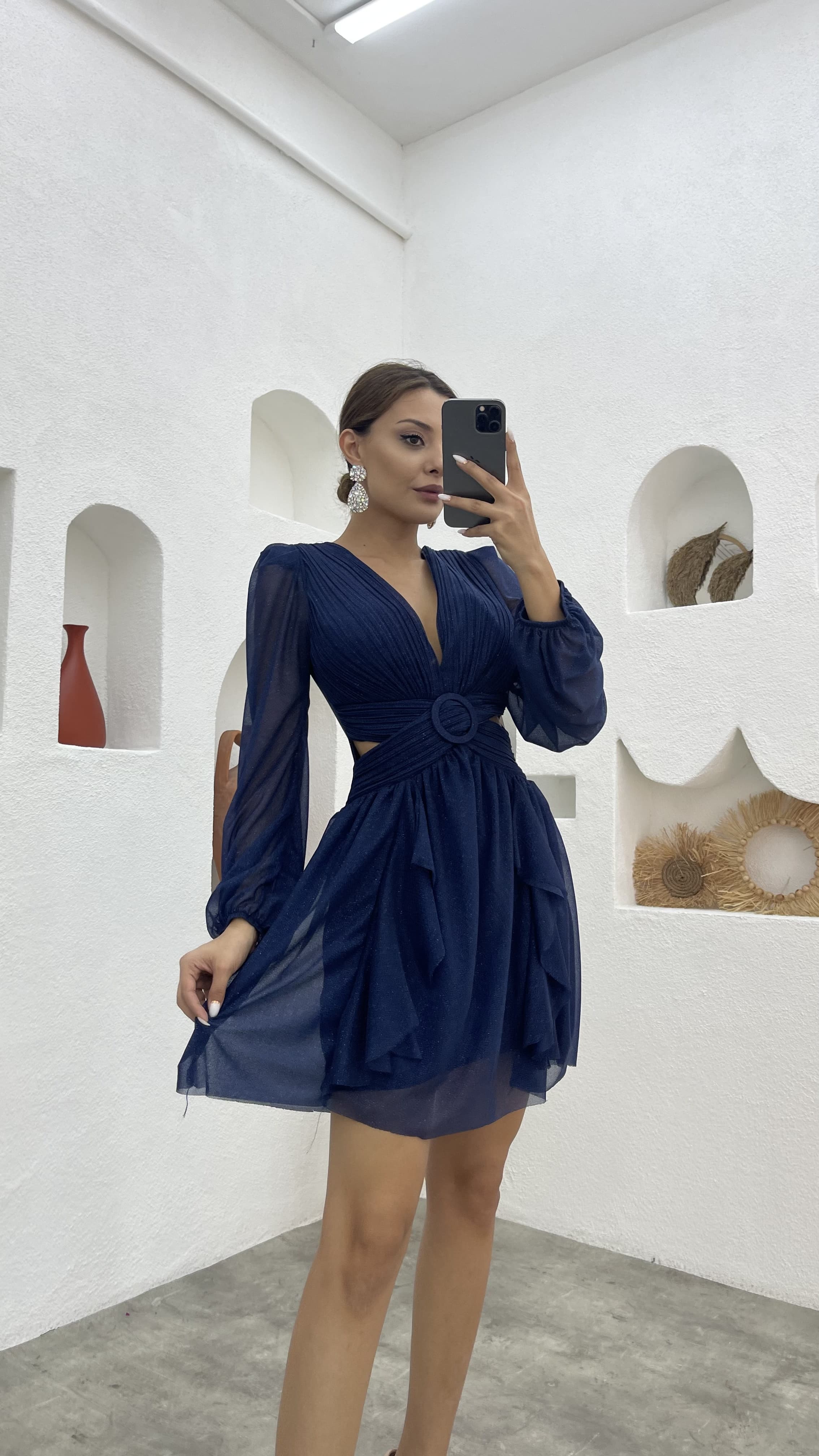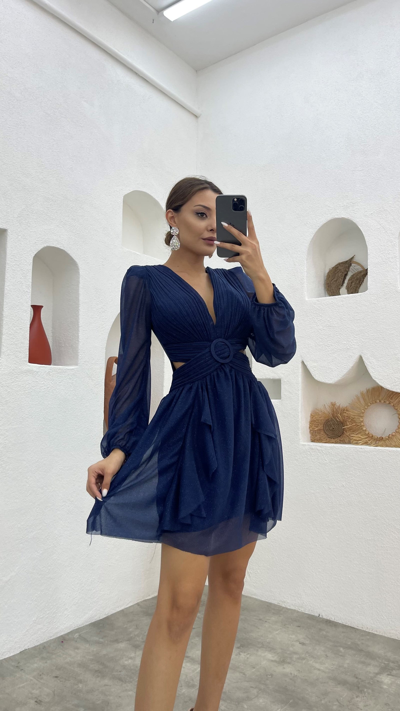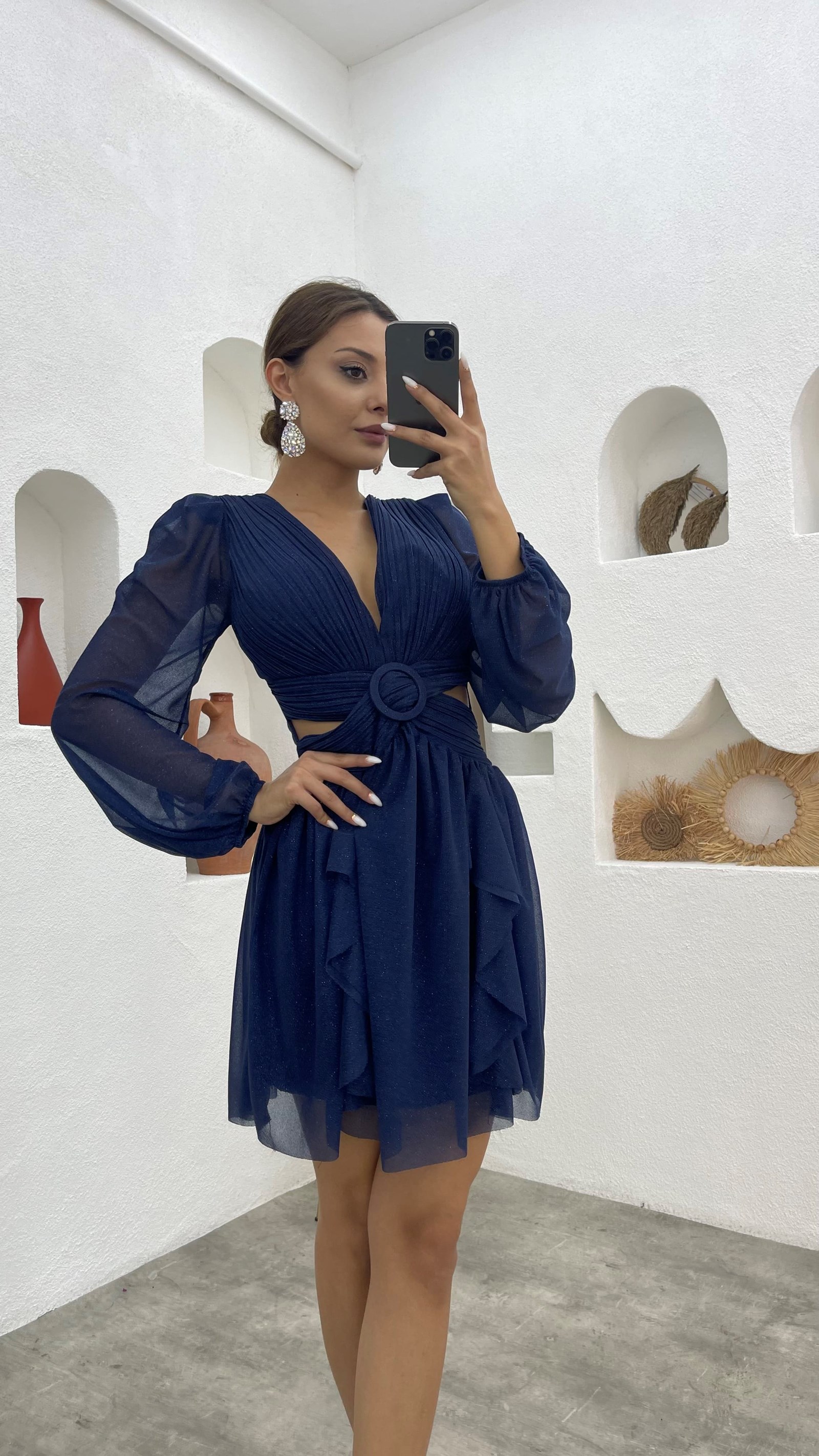 Lacivert Kemerli Bel Detay Simli Abiye Elbise