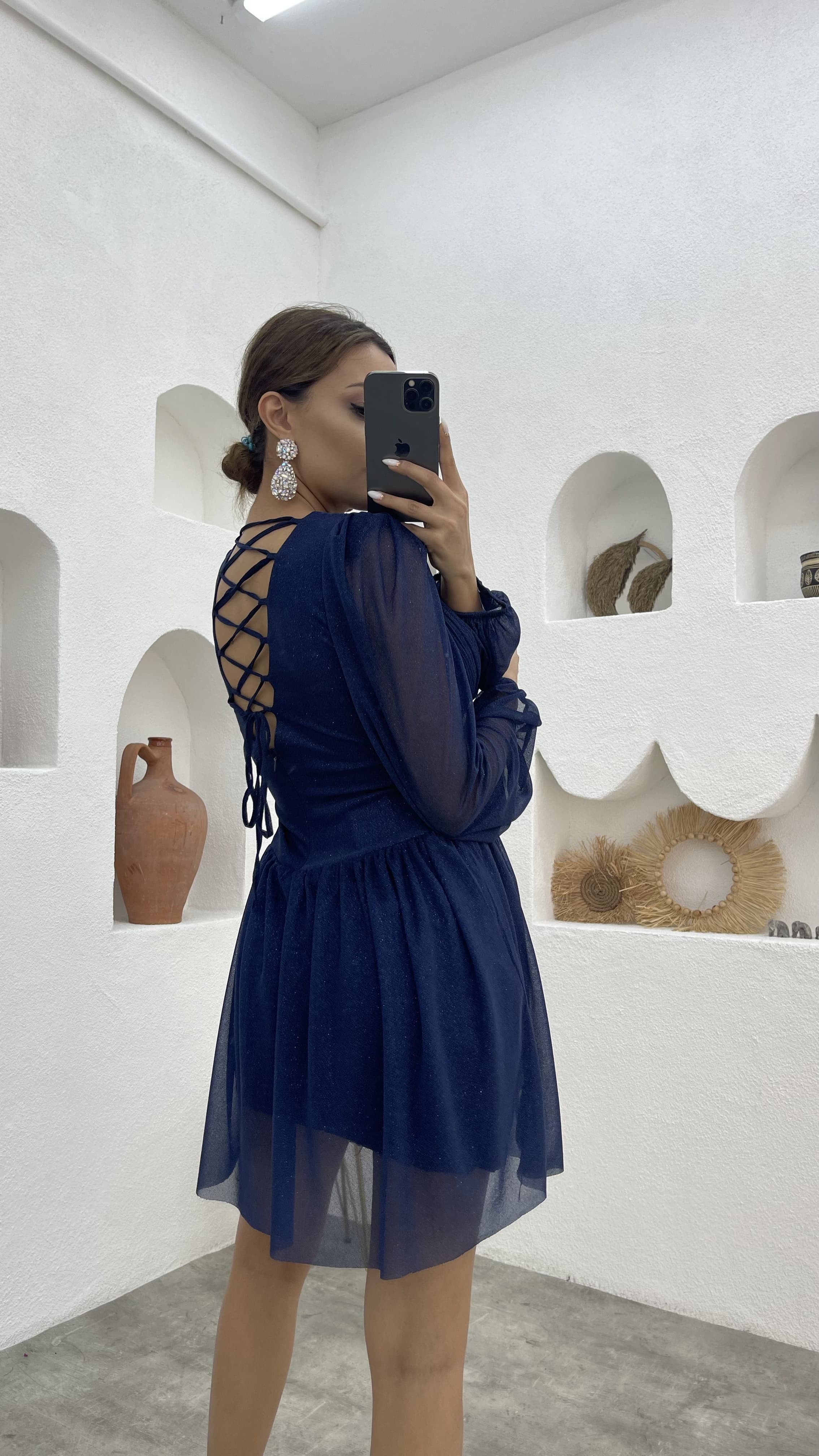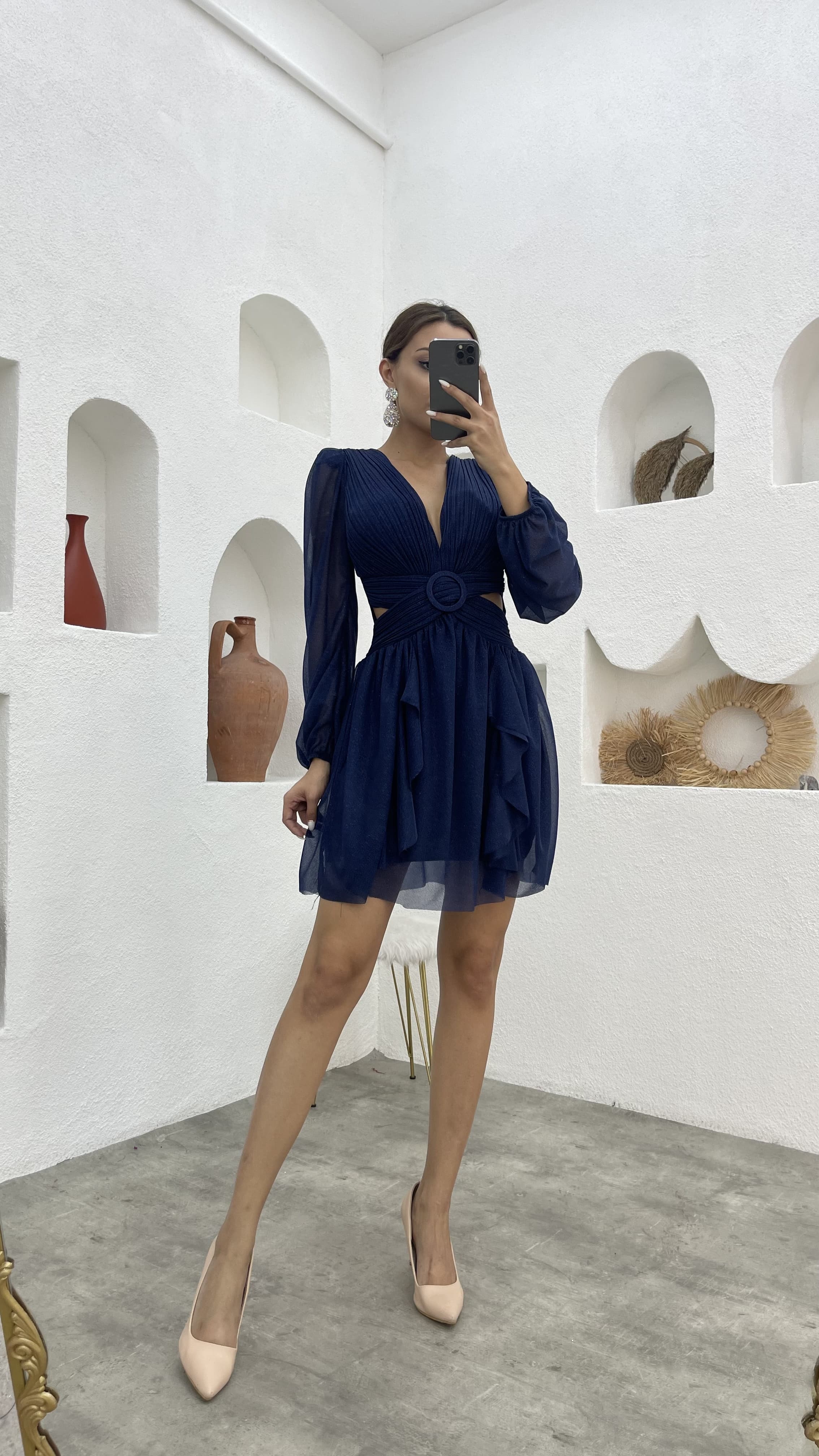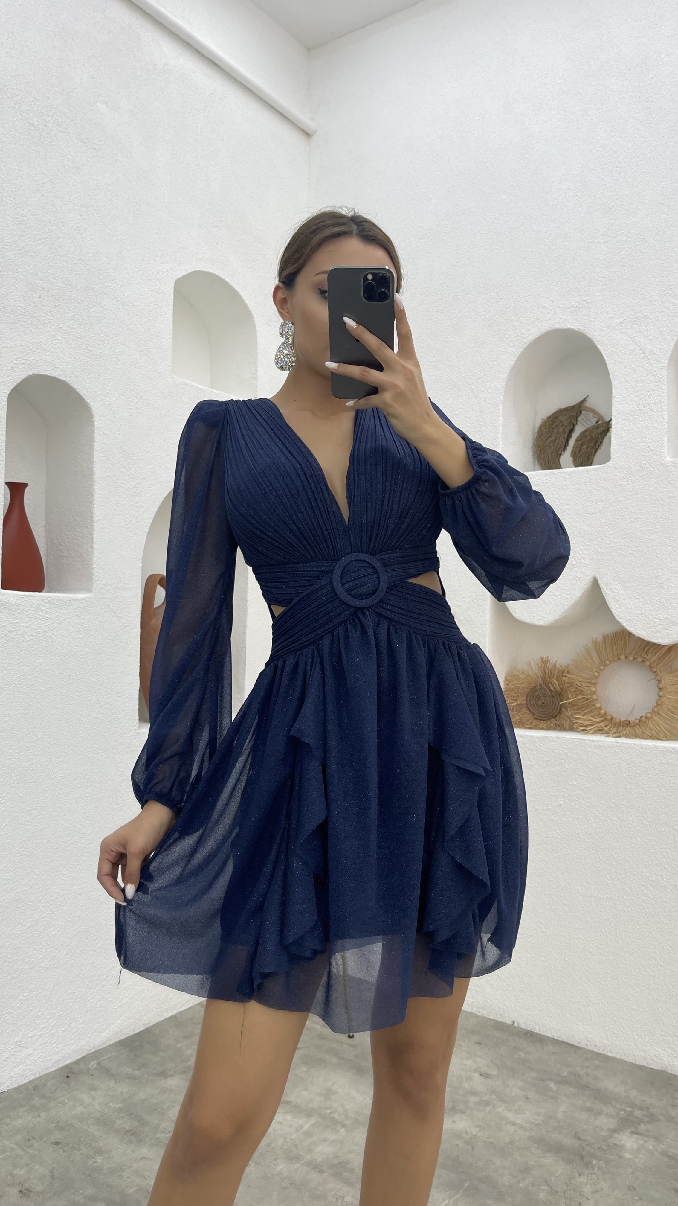 Lacivert Kemerli Bel Detay Simli Abiye Elbise