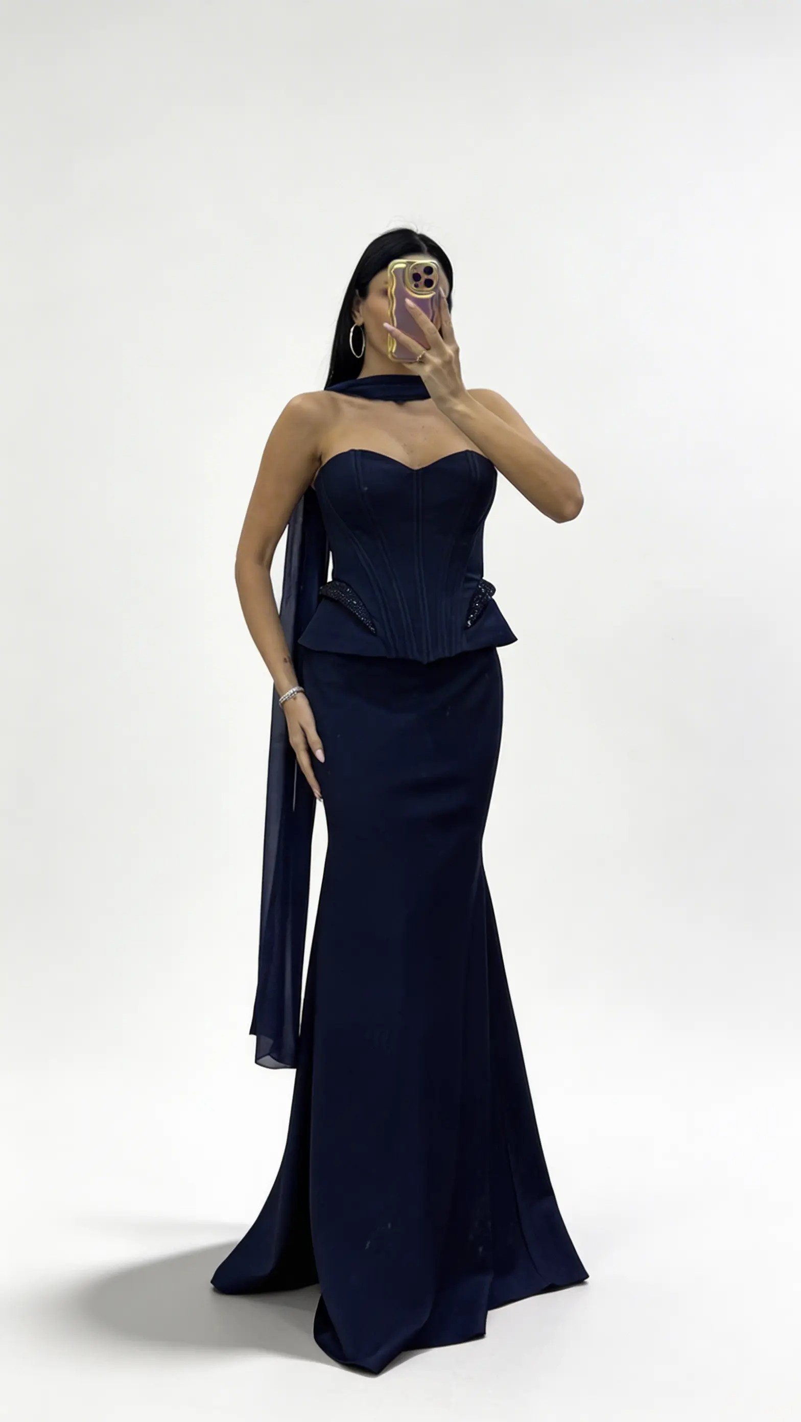 • Lacivert Korse Dikiş Hatlı  Bel Vurgulu Peplum Tasarım Uzun Abiye Elbise
