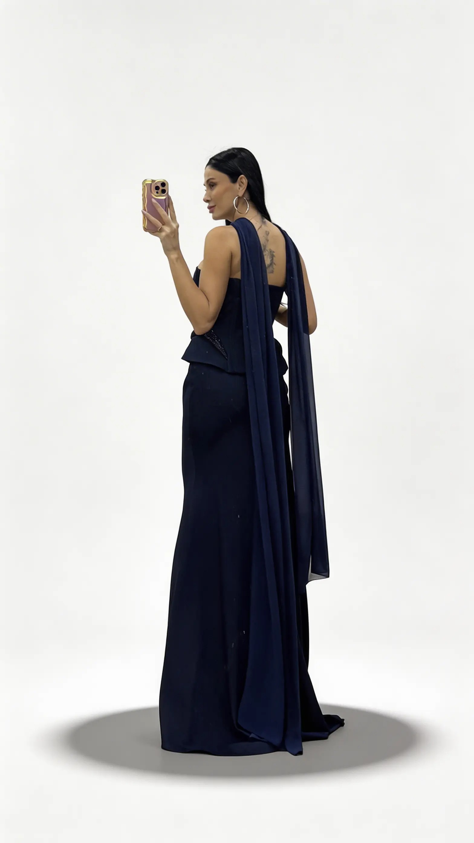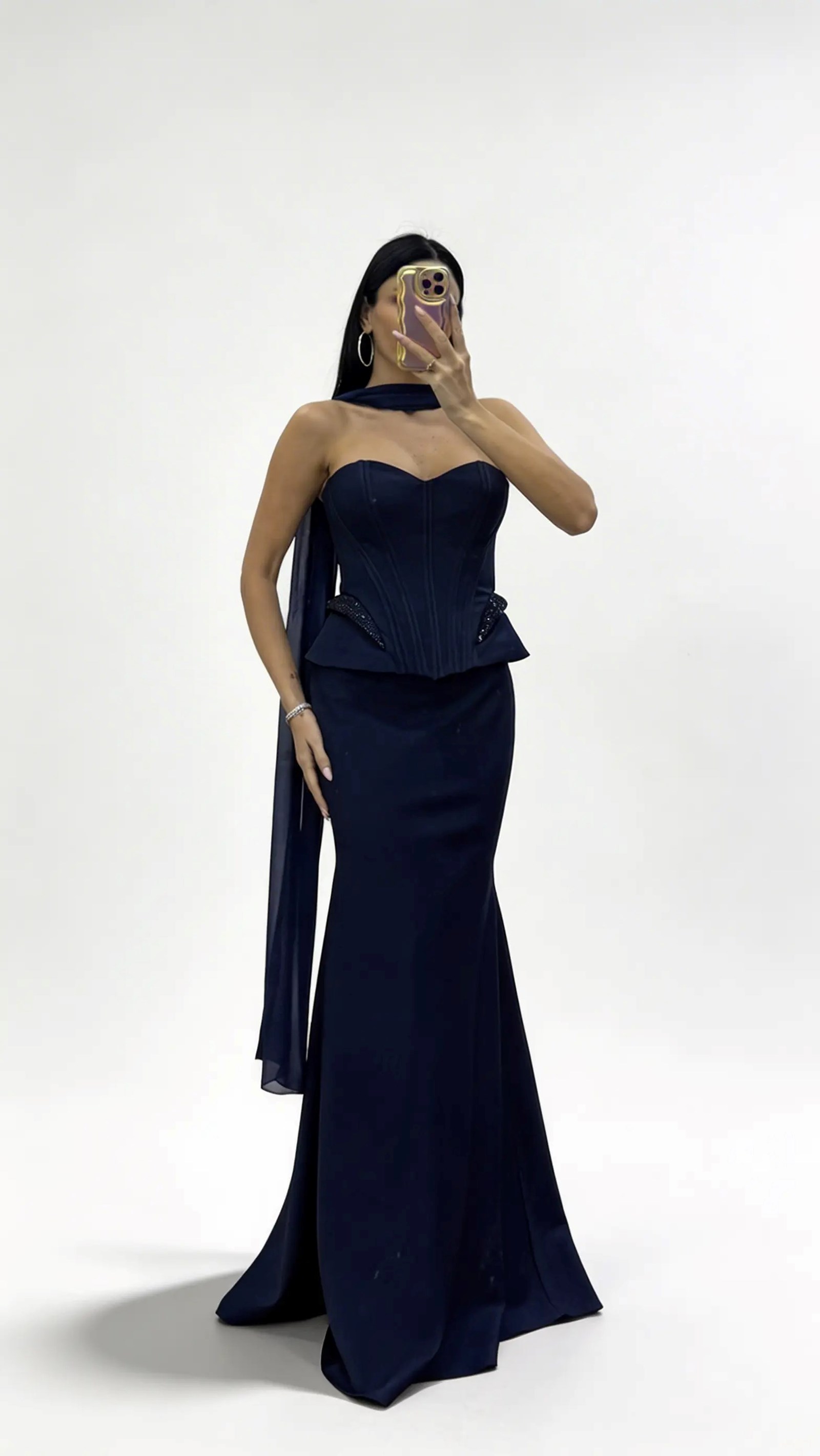 • Langes marineblaues Abendkleid mit Korsett Nähten und taillierter Schößchenform